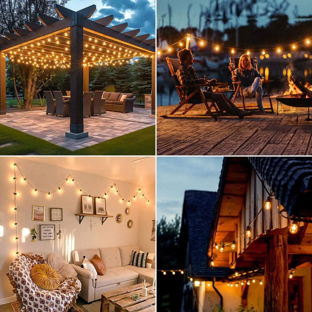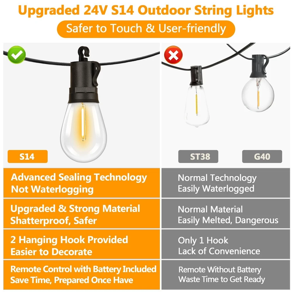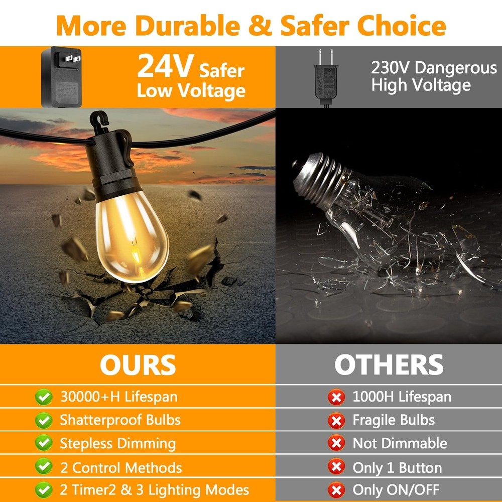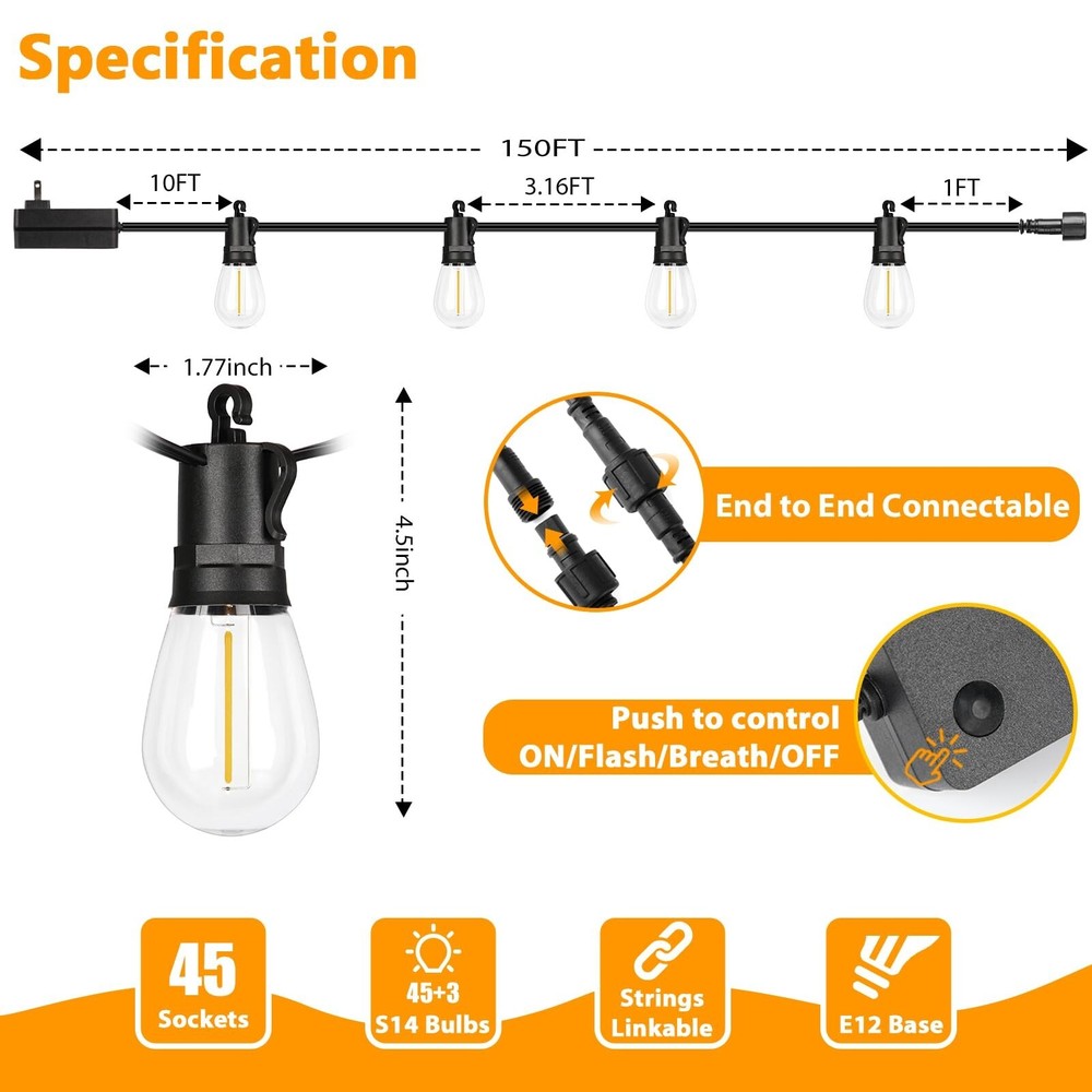 LED Outdoor String Lights, 150FT Waterproof Patio Light with Remote & 48 Shatterproof Dimmable S14 Edison Bulbs(3 Spare), 3 Modes 2 Timer Outside Garden Lighting for Balcony, Porch, Party, Christmas Product Details Size: 150 FT Brand: Brightever MPN: CMPC-O25XA UPC: Does not apply EAN: Does not apply Color: Black Brand: Brightever Indoor/Outdoor Usage: Outdoor, Indoor Special Feature: Remote Controlled, Dimmable, Waterproof, Timer, Shatterproof Light Source Type: LED Power Source: Corded Electric Light Color: Orange Theme: Sport, Christmas, Halloween, Thanksgiving Occasion: Easter, Christmas, New Year, Birthday, Halloween Style: Modern Package Dimensions : 12.44 x 11.38 x 6.42 inches; 4.43 Pounds Item model number : CMPC-O25XA Date First Available : September 21, 2024 Manufacturer : Brightever Country of Origin : China Customer Reviews: 4.8 4.8 out of 5 stars 48 ratings Color: Black Brand: Brightever Indoor/Outdoor Usage: Outdoor, Indoor Special Feature: Remote Controlled, Dimmable, Waterproof, Timer, Shatterproof Light Source Type: LED Power Source: Corded Electric Light Color: Orange Theme: Sport, Christmas, Halloween, Thanksgiving Occasion: Easter, Christmas, New Year, Birthday, Halloween Style: Modern Material: Plastic, Metal Color Temperature: 2700 Kelvin Controller Type: Remote Control Number of Light Sources: 1 Voltage: 24 Volts Bulb Shape Size: S14 Bulb Base: E12 Included Components: 3 Spare Bulb, Cable Ties Number of Items: 1 Control Method: Remote Water Resistance Level: Waterproof Seasons: Autumn, Winter, Summer, All Seasons, Spring Manufacturer: Brightever Part Number: CMPC-O25XA Item Weight: 4.42 pounds Package Dimensions: 12.44 x 11.38 x 6.42 inches Country of Origin: China Item model number: CMPC-O25XA Special Features: Remote Controlled, Dimmable, Waterproof, Timer, Shatterproof Batteries Required?: No Date First Available: September 21, 2024 24V Safer Low Voltage & Energy-Saving: Combining low energy consumption with electrical safety, our outdoor string lights are operated at a safe low voltage of 24V, which ensures a safer working environment for your families, eliminating the potential hazards associated with high voltage electricity. The power of each bulb is only 0.48W, which not only conserves energy but also offers a longer 30000H+ lifespan than traditional incandescent string lights Convenient Dual Control Methods: Two control methods are provided for your preferences. 1. Button Switch: you can turn on/off and switch the mode by simply pressing; 2. Functional Remote Control: not only can turn on/off and switch the mode, but also can set your favorite timer and brightness. Getting rid of trouble in changing moods Upgraded S14 Outdoor String Light: Crafted and designed with advanced sealing technology and improved materials, our outdoor patio string light will not easily waterlogged or melted after long-use unlike others on market. Definitely being safer and more durable for all ages, especially for your families, friends and children, a great party companion 3 Lighting Modes & Timer Function: our string light for outside is equipped with 3 lighting modes for you to choose from: Lighting, Breath, and Flash that you can create the desired ambience and change it according to your mood or occasion. Moreover, 3/5H two Timer to turn off automatically are also provided, saving the hassle of manually unplugging to turn off the lights IP65 Waterproof & Shatterproof: Made with premium materials, our outdoor hanging string light is with IP65 waterproof technology, which can withstand more kinds of weather such as snow, wind, high temperature and so on. Unlike traditional glass bulbs, our string light is also shatterproof due to the durable plastic materials. Protect your family from glass shards caused by impact, crushing, or dropping Linkable & Wide Application: Our porch string lights, featured with a connectable wire that supports end-to-end connection for up to 3 strands. Suitable not only for indoor settings but also for larger outdoor spaces such as balconies, gardens, backyards, and other scenarios, the S14 outdoor string lights can be extended to a sufficient length, allowing you to decorate with your preferred lighting. Moreover, 2 hanging hooks are provided, allowing you to hang them anywhere you need Specifications & Caution: Our dimmable outdoor string lights measure a total of 150 feet in length with a bulb spacing of 3.16 feet. The set includes 45 pre-assembled 2700K S14 bulbs, and 3 additional spare bulb is provided in the box for emergencies. Please be advised that it is not advisable to use adapters other than those recommended, particularly high-voltage adapters, to connect the Edison bulb string lights, to prevent damage to the outdoor hanging lights or potential safety hazards