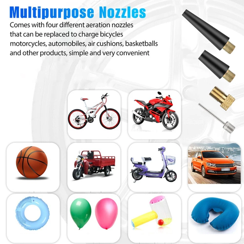 Features. 150PSI Smart Air Pump: This practical electric air pump mini inflator has a 150PSI maximum inflation pressure. Plug it into the 12V power outlet in your car and attach the stem to the tire valve. One simple press on the car air compressor and it will do all the work for you. 4 Inflation Modes & Power Prompt: The LCD digital display panel will display 4 kinds of air pressure units "PSI", "BAR", "KPA", "Kg/m²". The digital display panel will have icons such as motorcycles, cars, and balls for selection. The corresponding safety air pressure has been set by default for the type of product. Multipurpose Nozzles: Comes with four different aeration nozzles that can be replaced to charge bicycles, motorcycles, automobiles, air cushions, basketballs, and other products, simple and very convenient. The wired air pump is connected to the power supply through the attached car power cord. LED Lighting For Night Time: Power tire compressor has 3 LED lighting modes (Ordinary White light & Slow frequency warning light& Hazard warning light) for you to use as an outdoor lighting source. It is a helpful companion for emergency or daily use. Easy to operate: After connecting the tire valve, the current tire pressure is displayed, and the tire pressure can be monitored at any time. When the inflation reaches the preset value, the air pump will automatically stop inflation to avoid over-inflation. Portable & Easy To Carry: Portable tire pump comes with a carrying bag and a well-made mini electric tire inflator is designed to be easily stored in your car. Multipurpose Nozzles: Comes with four different aeration nozzles that can be replaced to charge bicycles, motorcycles, automobiles, air cushions, basketballs, and other products, simple and very convenient. The wired air pump is connected to the power supply through the attached car power cord. Specifications. ▪️ Name: Electric handheld inflatable pump ▪️ Material: poly carbon (pc) ▪️ Color: black ▪️ Display: LCD display ▪️ Maximum working pressure 150 PSI ▪️ Product Size: 175*75*55mm ▪️ Cylinder: 19 single cylinder ▪️ Power: 120W ▪️ Rated voltage: 12V ▪️ Function: Inflatable pump, lighting, warning light, mobile power ▪️ Application: cars, bicycles, electric cars, motorcycles, balls, etc. Package Included 1 x Inflator 1 x Car power cord 1 x inflation tube 4 x Inflatable adapter 1 x Storage bag
