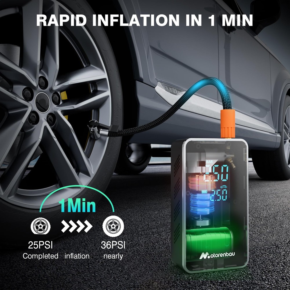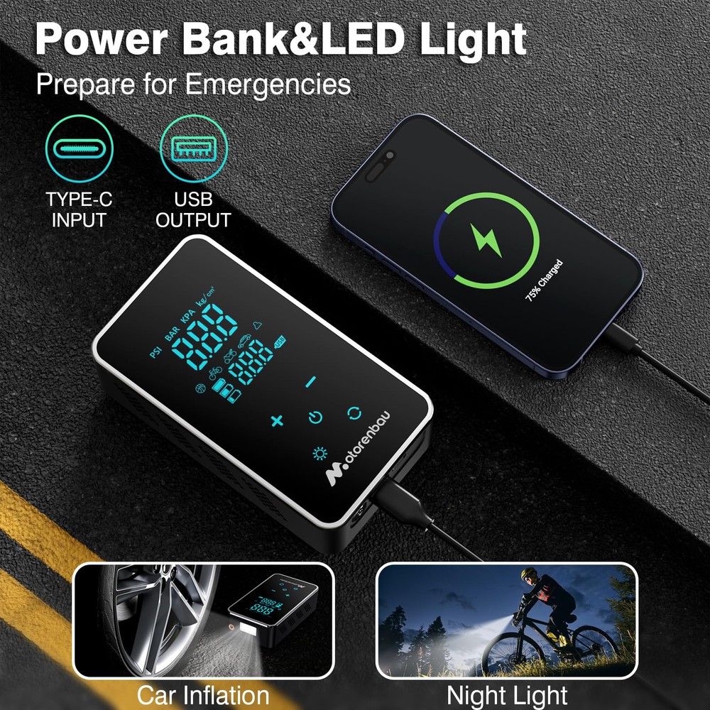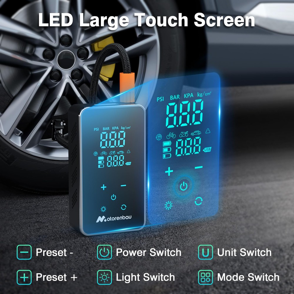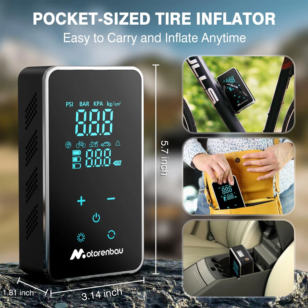 【Tire Pressure Gauge with Inflator】----Use the "M" button to set the desired pressure unit, then press the "+" and "-" buttons to set the desired pressure. After connecting the inflation hose, you can inflate for car tire. When the tire pressure reaches the preset value, it will stop automatically.We can also use the LCD digital pressure gauge to measure the air pressure of the inflatable items.It is very convenient 【Portable Auto Air Pump】----The tire air pump adopts compact design and reinforced materials inside, 45W power, maximum support 150PSI, fast inflation without cables, plug and play, car tire air pump has undergone 20,000 hours of durability test, this technology increases the service life of tire inflator air compressor by 80%(The inflation speed will be affected by the tire size, which is a normal phenomenon) 【Power Bank & Touch Screen】----Built-in high-performance battery can power the air pump or charge the phone via USB.The large touch screen can be used to observe the real-time air pressure, adjustment mode and 4 air pressure units (PSI, KPA, BAR, KG/CM²). The tire pump can be used to measure the air pressure (the normal for the measurement accuracy to have slight deviations) 【3x Fasten Inflation Speed】---- air pump for car and suv is made of the highest quality materials, a portable tire inflator for cars, trucks, SUVs, motorcycles and bicycles, the new internal design makes the tire pump smaller than other air pumps, with a size of 5.7*3.14*1.81 in, you can easily put it in a shoulder bag 【ALL IN ONE】----The tire air compressors and Inflators adopts modular design, and can replace air nozzles and ball needles.The LED lights at the tail have multiple gears, emergency lighting, SOS, red & blue light warning lights, which are convenient for changing tires in dark environments and alerting vehicles behind. It is a very practical small air pump