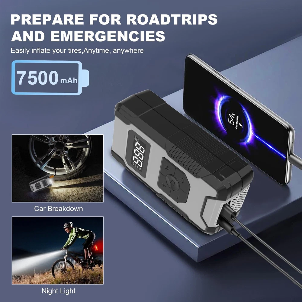 ⚡【FAST INFLATING】air compressor with portable design is a great solution for emergencies on the way. It can provide up to 150 psi pressure and refill a 185/65/R15 car tire from 0 to 35 psi less in than 6 mins. Besides, the auto-shutoff design also prevents over-inflating, making it safe to use. ⚡【4+N SMART MODES】portable air compressor for car tires is convenient to use with 5 smart modes, easily meeting your various inflating needs! The 4 preset modes are car mode, motorcycle mode, bike mode, and ball mode, which facilitate the operation of the new beginners. Moreover, the manual mode enables you to set the desired pressure from 3-150psi according to different inflatables. ⚡【CORDLESS & EASY-TO 】 No external power supply is needed, portable tire inflator for cars with a rechargeable battery pack can help you inflate most inflatables anytime.And product accessories include 1pc of ball pin, 1pc of short air nozzle, 1pc of long air nozzle, 1pc of French air nozzle connector, 1pc of storage bag, 1pc of USB-A to Type-c charging cable, 1 piece of instruction manual. ⚡【LONG-LASTING POWER】This portable tire inflator is powered by three large-capacity batteries of 2,500mAh that can work continuously for up to 30mins after being fully charged in 3-4 hours., it's recommended to rest for 3-5 minutes after each 10-minute use. ⚡【MULTIPLE ATTACHMENTS】cordless tire inflator is a must-have for drivers, cyclists, and adventurers. With rich accessories included, this portable air pump can not only inflate car tires with width ≤ 245mm and pressure ≤ 50psi, but also refill tires of bikes, motorcycles, balls, and other inflatables!
