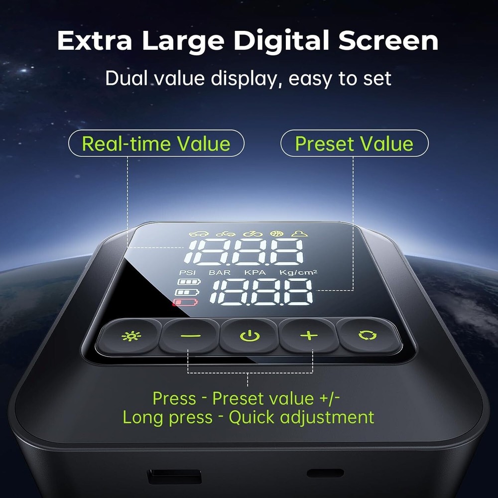 Tire Inflator Portable Air Compressor 150PSI Air Pump for Car Tires [3X Faster] Inflation Electric Smart Tire Pump with Extra-Large LCD Dual Value Display [Free Car Tire Valve Caps], Auto-Off 【Super-Fast Inflator with Extreme Precision】The tire inflator portable air compressor inflates up to 3 times faster than similar competitors. With a rated pressure of up to 150 PSI and a 7800mAh battery, it offers strong airflow and quick speed, making it ideal for inflating car tires, bikes, motorcycles, balls, and more. Inflate a ” tire (28-33 PSI) in just 56 seconds with pinpoint precision of ± PSI. NOTE: Not suitable for large-volume uses like air mattresses or paddle boards. 【Simplified One-Press Setting】- The Tire Inflator Portable Air Compressor comes equipped with 5 inflation modes for cars, motorcycles, bikes, balls, and a customizable setting, along with 4 preset pressure units (PSI, KPA, BAR, KG/CM²). Effortlessly select your required mode and unit with a single press, set it, and start inflating. The air pump will halt automatically once it hits the designated pressure, allowing you to kick back, free from the hassle of constant monitoring. 【Ultra-Large Bright LCD Display】- This portable tire inflator features an extra-large, easy-to-read LCD screen with dual pressure readings, and large buttons, allowing for precise pressure monitoring and easy operation. The top value displays real-time pressure while the bottom shows the preset target, ensuring accurate readings that are clearly visible in both daylight and at night. 【Gifted Car Tire Valve Caps】- air pump comes with a comprehensive set of accessories, including multiple inflation nozzles for various demands. Additionally, we provide a unique bonus of four high-quality aluminum alloy car tire valve caps, which are special and unique in the market. Should you ever misplace the original caps for your vehicle's tires, these supplied tire valve caps serve as an excellent substitute, sparing you the embarrassment of lost valve caps. 【Two Ways of Using】- You can use the air inflator cordlessly with the built-in large battery. However, it also features a DC 12V cigarette lighter power cord. If the battery runs low, it plugs directly into a car's cigarette lighter port and makes it easy to inflate the tires, which is a great emergency solution on the way. Two ways of using enable you to use the portable air inflator in different situations. 【All-in-one Powerful Functions】- Including a long air hose and three versatile nozzle adapters, this inflator effortlessly pumps up tires for cars, motorcycles, and bicycles, sports equipment (like balls), air cushions or pillows, and more. Built-in LED flashlight provides illumination in dimly lit conditions, and the additional USB output port turns the device into an emergency power bank for the s. This multifunction tire inflator makes it a great choice for all your needs. 【Exclusive satisfaction Service】- We provide a 36- satisfaction and support to assist with any inquiries or needs. Perfect choice for you. You will get 1* portable tire inflator, 1* air hose, 4 different air nozzle adapters, 4 car tire valve caps, 1*DC12V cigarette lighter cable, 1* USB-C charge cable, 1* storage bag, 1* user manual, 1* satisfaction policy. Should you encounter any issues, we encourage you to contact me immediately for a swift and satisfying resolution.