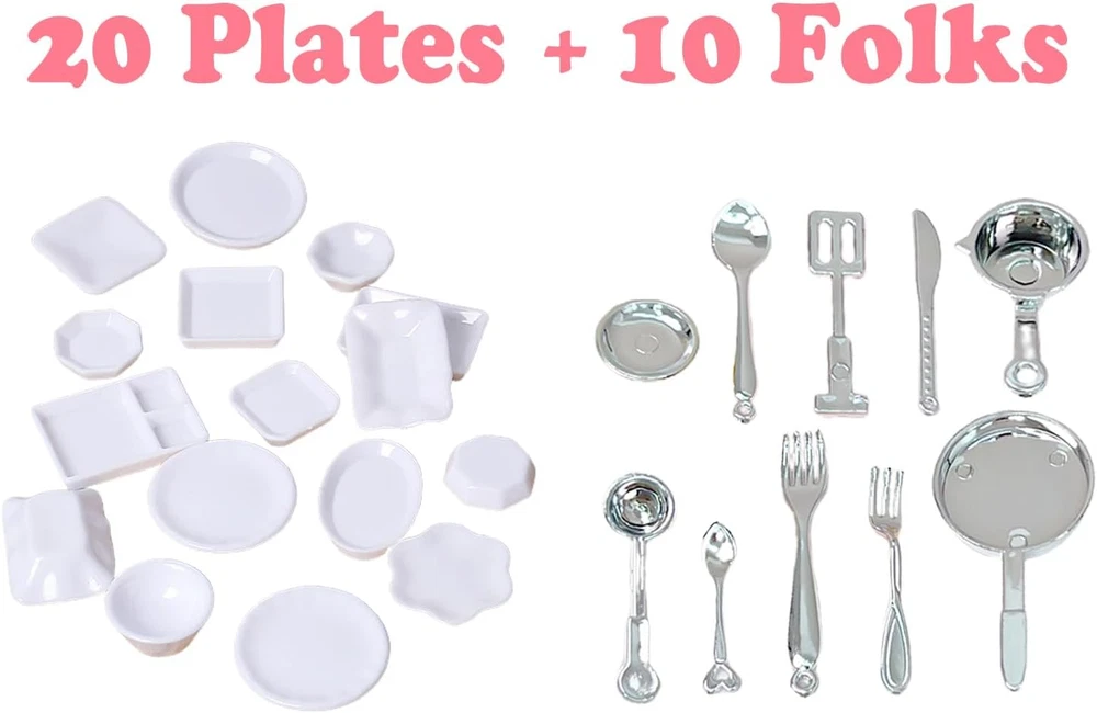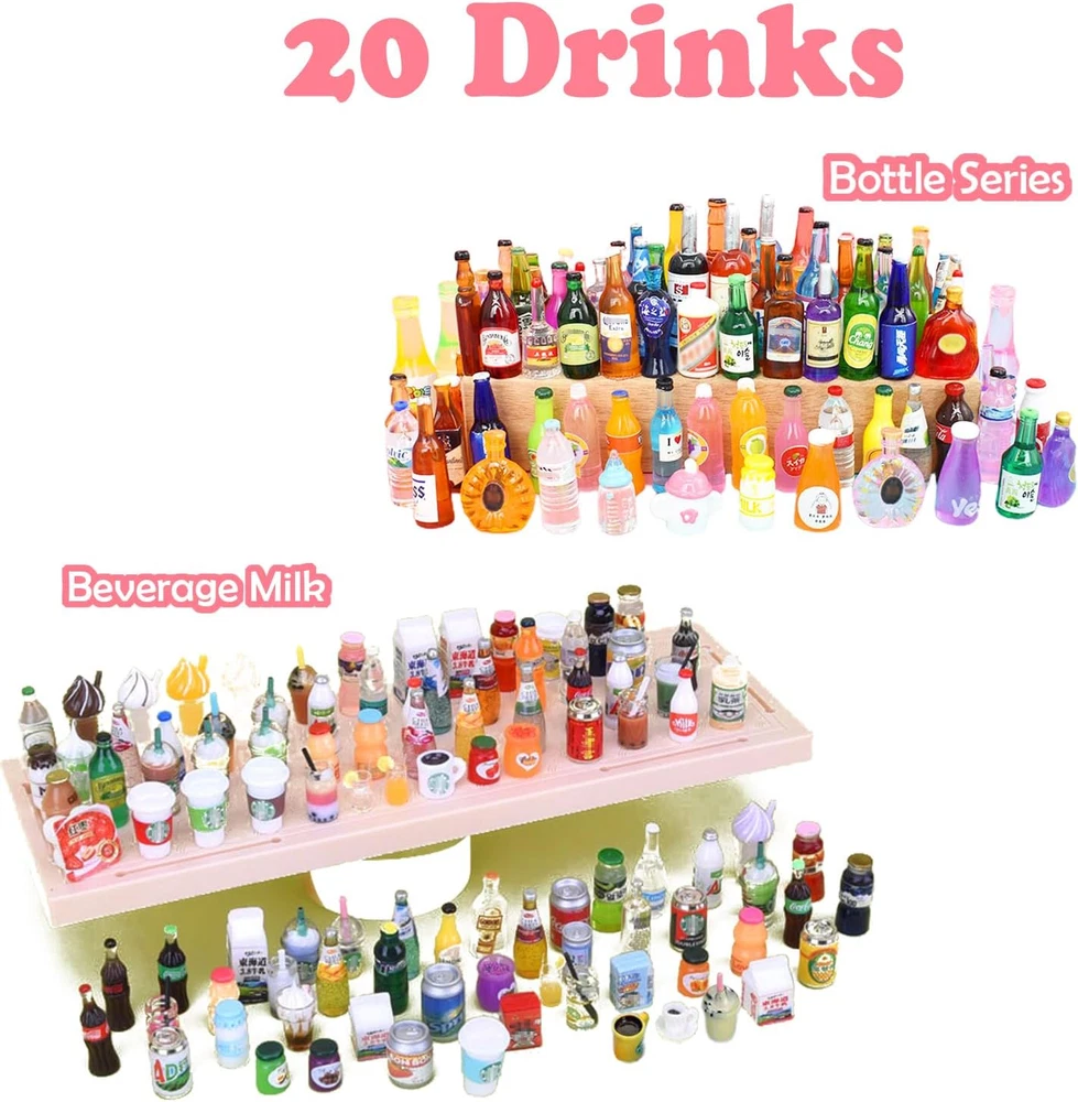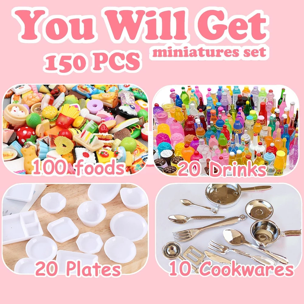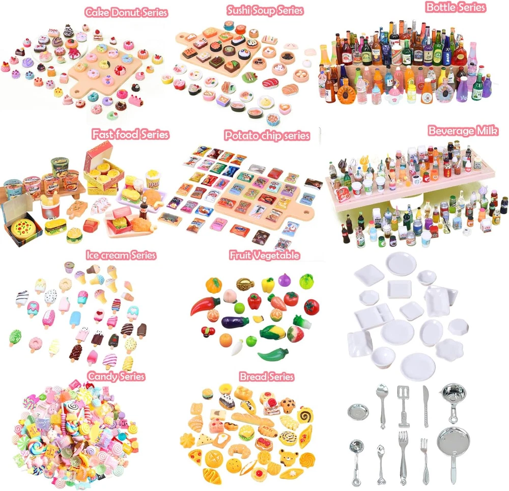 【Value miniature accessories set】150pcs value pack that contain -- 100 pcs food + 20 pcs bottles + 20 pcs plates + 10 pcs knives and forks. Includes: food, drink bottle, hamburger, french fries, cake, milk tea, bread, chocolate, ice cream, milk, drink, donut, Chinese food, sushi, toast, kitchenware, tableware. Sufficient quantity and styles, can help relieve stress, develop creativity and imagination, and bring you a lot of fun. 【High-quality materials】Made of hard resin, sturdy and durable. These food model toys are lifelike and eye-catching, perfect for pretend kitchen cooking. You can deliver meals to dolls or friends. Players can immerse themselves in the fun of kitchen and food games without getting bored, and these miniature dollhouse toys can also Stimulate their creativity and curiosity. 【Suitable for many occasions】These cute food toys are great accessories for dollhouses, living rooms, bedrooms, dining rooms, study rooms, sewing rooms, bathrooms, playrooms, etc. They can also be used as cell phones, photo frames, micro-scapes, stationery box decorations. Perfect for miniature gardens, mini landscapes, potted landscapes, window displays, 1:12 doll houses and plant decorations. Great for DIY crafts, great for making hairpins, sewing and miniature decorations. 【Ideal props and perfect gifts】Realistic and cute, the ideal prop for action figure photography, great for cosplaying, creating their own grocery store, serving fake food to family and friends, or toddlers just connecting with family and friends. Perfect for holiday toys, birthdays, Christmas and baby shower gifts, recipients of such gifts will be delighted to have a mini grocery store that adds to the joy of interacting with playmates.. 【Choking hazard - small parts】Not suitable for children under 3. Avoid swallowing. Note: Some styles may be out of stock, we will use other styles and colors instead, please refer to the actual product received. Cute miniature decoration set, mini drink bottles and food packaging, including: food, drink bottles, drink cans, burgers, cakes, donuts, milk tea, bread, chocolate, candies, ice cream, drinks, kitchenware, tableware,etc. Sufficient quantity and style, can help relieve stress, develop creativity and imagination, and bring you a lot of fun! Products include: 100 * miniature foods 20 * miniature bottles 20 * plates 10 * cookwares Specifications: Material: resin Color: as pictures shown Size: as pictures shown Suitable for many occasions: These cute food toys are great accessories for dollhouses, living rooms, bedrooms, dining rooms, study rooms, sewing rooms, bathrooms, playrooms, etc. They can also be used as cell phones, photo frames, miniature landscapes, stationery box decorations. Perfect for miniature gardens, mini landscapes, potted landscapes, window displays, 1:12 dollhouses and plant decorations. Suitable for DIY crafts, suitable for making hairpins, sewing and miniature decorations. Irresistible Holiday Gifts: Great as a gift for friends who love doing arts and crafts with kids, lovers, friends and family, perfect for holiday toys, birthdays, Christmas and baby showers, those who receive such gifts will be delighted to have A mini food store that increases the fun of interacting with playmates. Note: Choking hazard - small parts, please keep away from people under 12 years old to avoid choking risk.
