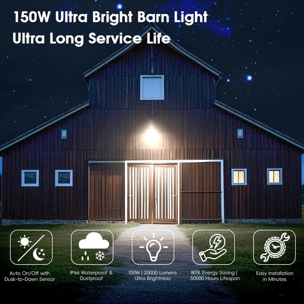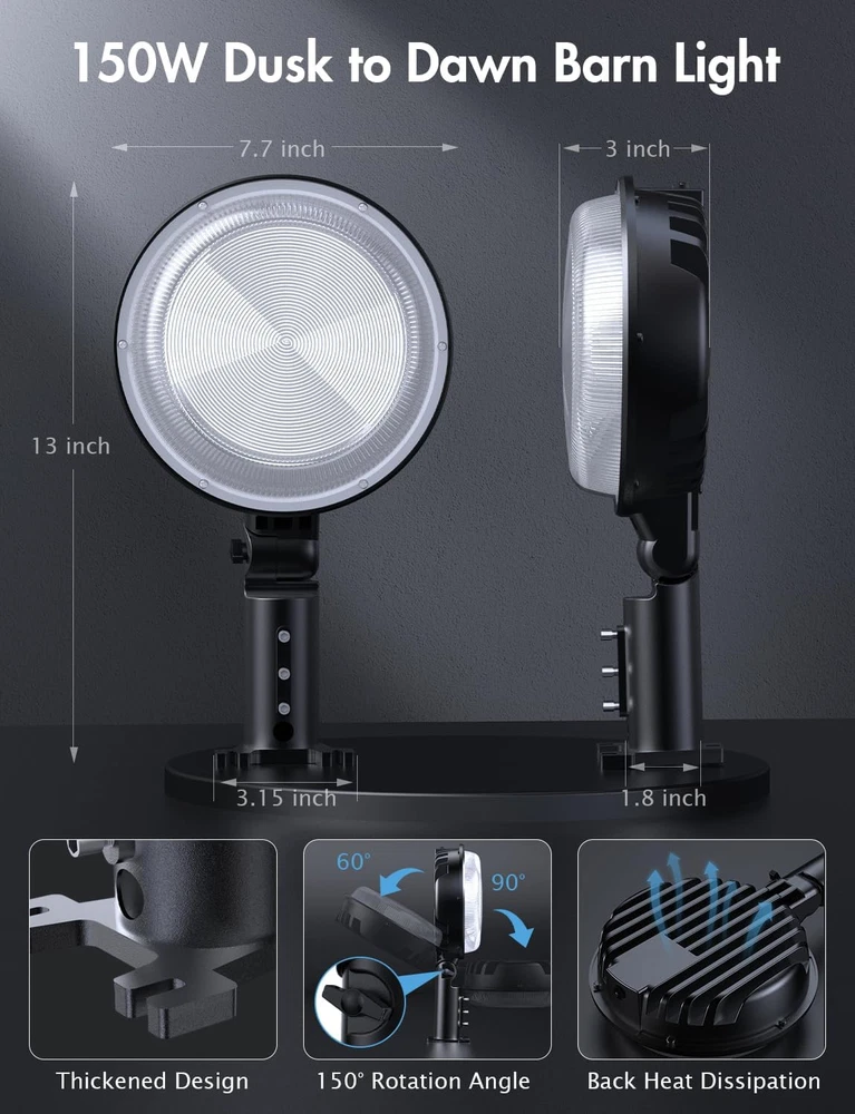 ๐๐๐๐ธ ๐๐ผ ๐๐ฎ๐๐ป ๐ฆ๐บ๐ฎ๐ฟ๐ ๐๐ถ๐ด๐ต๐ ๐ฆ๐๐ถ๐๐ฐ๐ต: Our area street lights feature a third-generation sensor photocell that automatically turns on at night and off during the day to intelligently reduce electricity waste. The barn light's head rotates 150ยฐ, allowing the angle to be adjusted for different lighting needs. ๐ญ๐ฑ๐ฌ๐ช/๐ฎ๐ฌ๐ฌ๐ฌ๐ฌ๐๐ ๐จ๐น๐๐ฟ๐ฎ ๐๐ฟ๐ถ๐ด๐ต๐๐ป๐ฒ๐๐: Experience a brightness equivalent to daylight with 6500K 20000 LM generated by our upgraded 150 high-brightness lamp beads and top-level chips. High-quality lamp beads and top-quality chips make the barn light last up to 50,000H ๐๐น๐น ๐ช๐ฒ๐ฎ๐๐ต๐ฒ๐ฟ ๐ฅ๐ฒ๐๐ถ๐๐๐ฎ๐ป๐: Our yard light is constructed with an integrated design that offers excellent corrosion resistance, excellent heat dissipation performance, and a professional IP66 waterproof design that can withstand extreme temperatures ranging from -13โ to +113โ. ๐ฆ๐๐ฟ๐ผ๐ป๐ด ๐ ๐ฒ๐๐ฎ๐น ๐๐๐ฟ๐ฎ๐ฏ๐น๐ฒ ๐ ๐ฎ๐๐ฒ๐ฟ๐ถ๐ฎ๐น: Made of one-piece die-cast aluminum to ensure superior strength and durability for a lasting performance. Fearless of wind and rain as well as any extreme weather. The excellent metallic texture will also make you feel that it is worth every penny. ๐ฎ ๐ช๐ฎ๐๐ ๐๐ผ ๐๐ป๐๐๐ฎ๐น๐น: Choose to install our dusk to dawn outdoor lighting on a wall or pole using the included mounting arm (Note: Pole diameters within 1.6 inches, mounting arm not included). Ideal for use on farms, yards, commercial areas, patios, driveways and streets as lighting fixtures and security lights. ๐ช๐ฎ๐ฟ๐บ ๐ฅ๐ฒ๐บ๐ถ๐ป๐ฑ๐ฒ๐ฟ: The dusk to dawn barn light is ๐ก๐ผ๐ ๐ฆ๐ผ๐น๐ฎ๐ฟ ๐ฃ๐ผ๐๐ฒ๐ฟ๐ฒ๐ฑ ๐๐ถ๐ด๐ต๐, it needs to be hard wired, the input voltage is ๐๐ ๐ญ๐ญ๐ฌ-๐ญ๐ฎ๐ฌ๐ฉ, and the brightness is 10X that of a solar powered light.