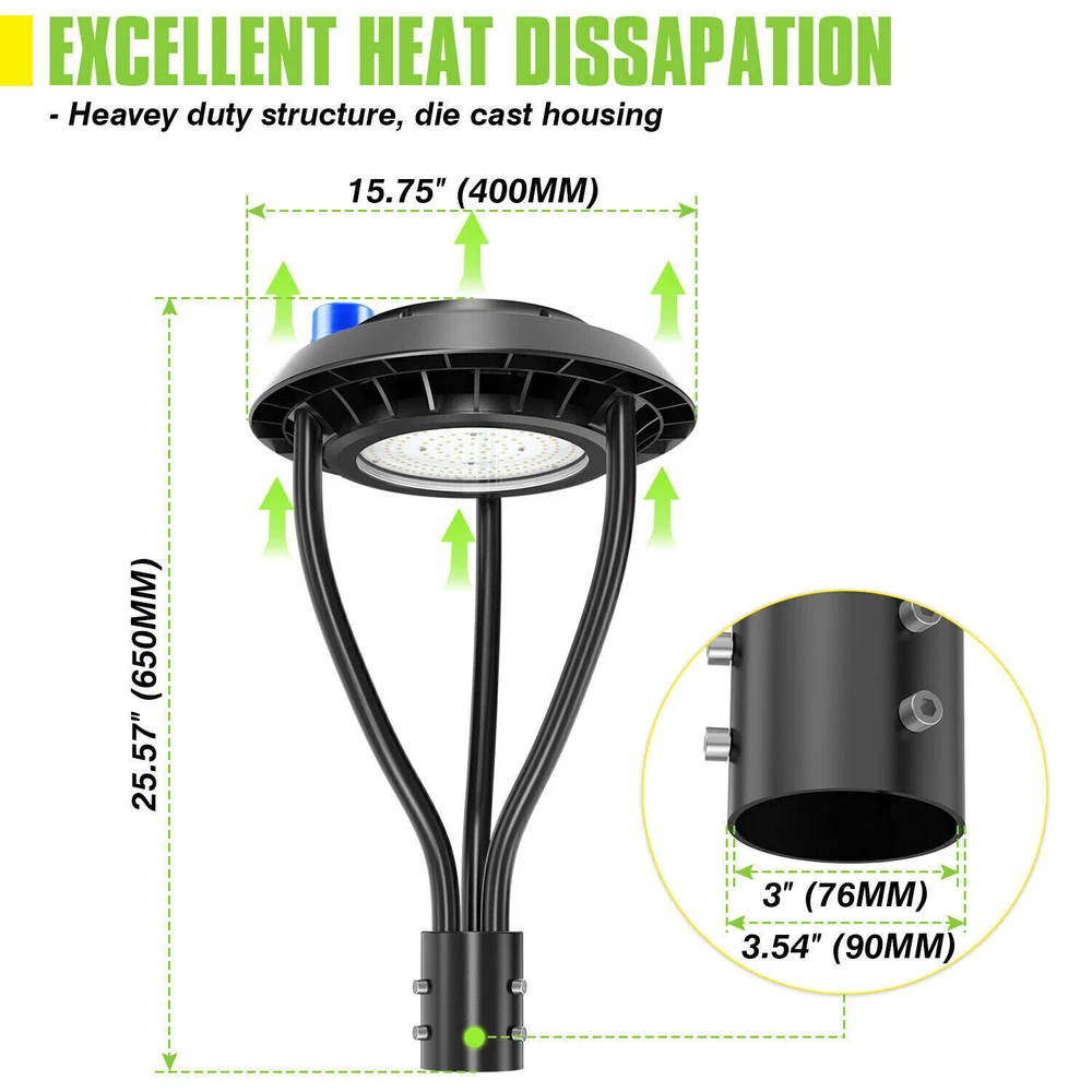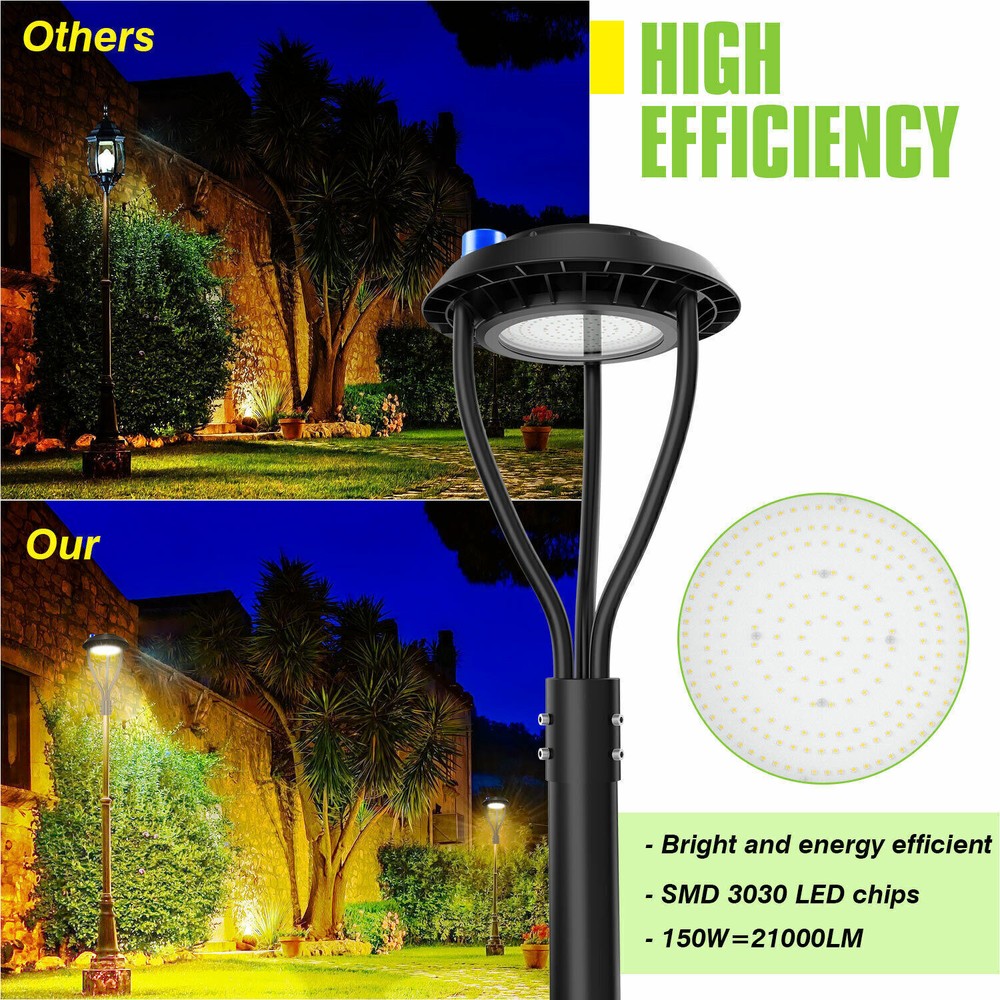 SAFE & SECURE SHOPPING 100% SATISFACTION GUARANTEED FAST SHIPPING 150W Led Outdoor Yard Lights With Dusk To Dawn Photocell For Garden Street Area Product Description 150W Led Outdoor Yard Lights With Dusk To Dawn Photocell For Garden Street Area Light Up Larger Area - The 150w light post bring 21000Lm with SMD3030 chips, up to 140lm/watt, AC 100-277V universal voltage and 120°beam angle. 5000K color temperature of lighting is a nice choice for street light illumination. Anti-shock, anti-moisture, no glare, no strobe light, no ghosting, protecting your eyes. Dust to Dawn Photocell - The Led circular post top pole light comes with photocell sensor outside automatically turns ON at sundown/night and light post at sunrise/daytime with dusk to dawn, high power factor >0.9, more than 50000hours lifespan, reduce your electricity consumption, save your electronic bill. Provides a continuous, efficient outdoor lighting environment. Commercial Grade Material - The DLC/ETL Listed post pole light fixture made of die-casting aluminum body + protective glass cover. The scientific design helps the exterior light post top to dissipate better, achieve the best use of the led lighting post. IP65 waterproof for drying, wet environment, sandstorms, snowstorms, and harsh weather conditions. Wide Application - The circular post top design give the lamp a uniform brightness and can be applied to a variety of outdoor scences, such as pathway, street, front yard, city expressway, trunk/rustic road, factories, playground, school, garden, courtyard, parking lot, public park, walkway, exterior, driveway, store, farmyard or any other commercial and industrial area. Installation and Warranty - The pole mount of our post area light fits for a 2 3/8-inch OD tenon & less than or equal to 3 inch standard pole, very easy to install and transfor(Please see the video on the product page for more installation info). KUKUPPO offer you lasting safety and reliability backed by a 5-year warranty. For a bulk order, email us in advance to get a different offer. Specifications: Rated Wattage: 150W Luminous Flux: 21000Lm Color Temperature: 5000K Protection Grade: IP65 Material : Aluminum Body+Glass Cover Input Voltage : AC100-277V 50/60Hz Dimension: Dia 400x650 mm Base: 2 Pins Wire Power Factor: >90% Beam Angle : 120 degrees Average Lifetime : More than 50000 hours Flexible Installation The pole mount of our post area light fits for a 2 3/8-inch OD tenon & less than or equal to 3 inch standard pole, very easy to install and transfor Commercial Grade Material DLC/ETL Listed quality. Scientific design helps the exterior light post top to dissipate better, achieve the best use of the led lighting post. Durable Support Rod Made of thick aluminum, stable and strong, waterproof and rustproof. High performance quality provides with lasting safety and reliability. Ultra Bright LED Chips With SMD3030 chips, up to 140lm/watt. Anti-shock, anti-moisture, no glare, no strobe light, no ghosting, protecting your eyes. Kindly Note Please note that the light can not be used IN the water. Please confirm the wire connection is right while installing. About Us Payment Shipping Terms Returns Contact Us About Us 1. 10 Years LED Light Manufacturer 2.Certified Safety LED Light Products 3.US Warehouse Fast & Convenient Delivery 30,000 sq.ft production area &100 employees professional team. UL,cUL,cETL,ETL,DLC approved products standard produce by certified request. 6 separately production line strictly control quality & speed production Professional Aging test machine&SMT Machine&IES test system&Reflow oven Payment 1. We only accept payment by PayPal . Your ebay address must match your paypal address. PO BOX can not delivered. 2. Please make payment within 7 days. If you don't need it, please inform us to cancel it, for eBay will open UNPAID dispute automatically in eighth day. 3. Paypal allows you to complete your purchase quickly and securely. It offers a variety of payment options including all the major card carriers. Shipping ★★★ ★ ★ USA Warehouse! 2-5days Fast shipping! 1. We will ONLY ship item to eBay physical Paypal address. Your eBay address must match Paypal address. 2. We ship daily Monday - Friday . All orders will be shipped within one working day after payment. 3. Tracking number will be upload on ebay within 24 hours after shipment. 4. Shipping Time: 2-5 working days for US buyers. ★ ★ ★ All of our products are shipped from our 3 different warehouses in the US.(KY/OH/TX) Terms 1. Please kindly CONTACT US via eBay message if there is any problem, instead of Open Case or Return Requests, We will always try our best to solve the problem for you. 2. We provide a 30 days satisfaction or return guarantee for exchange or refund. 3. The package must be in its original packaging and include all of the original accessories or items that came with it when returning an item. The item and package should be in original and perfect condition. Returns 1. Sellers pay return shipping costs. Sellers pay for return, replacement or exchange shipping if there's a problem with the item. For example, if the item a. Doesn't match listing description b. Damaged or defective when received c. Missing spare parts d. Counterfeit or imitation goods 2. Buyers need to pay return shipping costs. If the buyer changes mind about a purchase and wants to return an item, there may need to pay return shipping costs. For example a. Chose the wrong size or feel that the product is not suitable for buyers himself b. No need this product after received c. Find a more suitable price elsewhere than choose a return. Contact Us 1.Office Time: 9:30 - 18:30, Monday - Saturday (UTC+8) 2.Please contact us with eBay Messa ge . 3.We will respond you within 24 hours on business day. Your feedback is very important to us, please leave us a Positive Feedback with all 5-star for the Detailed Selling Rating when you received the item. If there is some problem about the product, plea