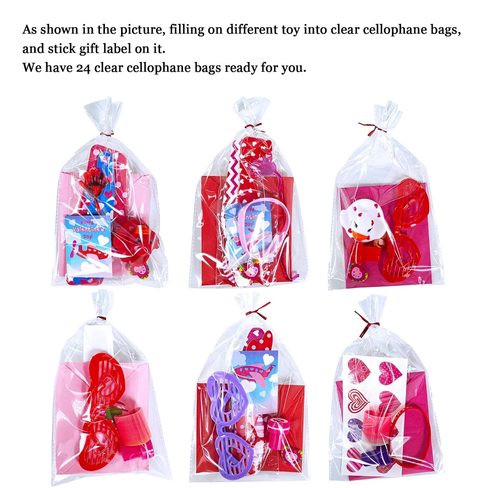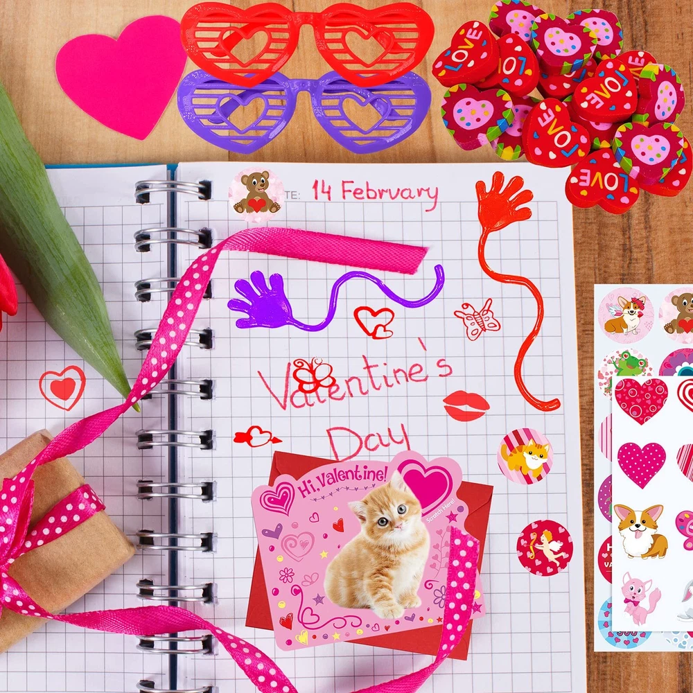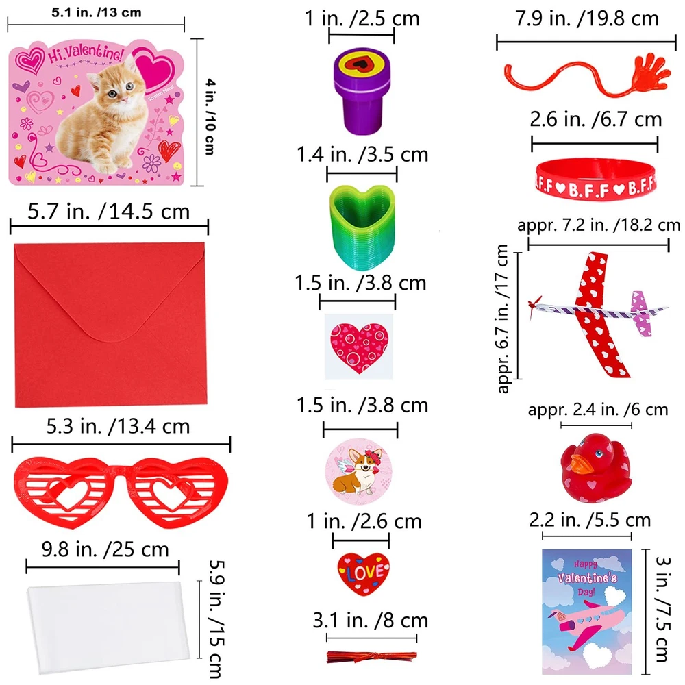 Valentine's Day Stationery Toy Assortment Set: 8 pcs Valentine gliders, 8 pcs gift exchange cards, 8 pcs Valentine stampers, 8 pcs Valentine rubber ducks, 8 pcs Valentine rubber bracelets, 8 pcs Valentine shutter glasses, 8 pcs heart-shaped magic springs, 16 pcs heart erasers, 16 pcs Valentine sticky hands, 24 pcs scratch & sniff Valentine cards, 24 pcs self-seal envelopes, 8 Valentine temporary tattoo sheets (128 pcs), 8 Valentine sticker sheets (192 pcs), 24 clear plastic bags, 24 twist ties. Color & Designs: In bright Valentines colors of red, pink, purple, blue, white, yellow, and green, these Valentine toys for kids feature vibrant print and cute Valentine's Day sayings, including assorted heart patterns, dog, cat, rabbit, bear, frog, ladybird, butterfly, ice cream, flower, cupid, rose, lip prints, cupcake, gift box, heat balloon, love letter, plane, "I LOVE YOU", "You're My Sweet", "YOU ROCK", "love", "HAPPY VALENTINE'S DAY", "CUTIE PIE", "B.F.F", "XOXOXO", "Be Mine", "Kiss Me". Size: Valentine gliders: 7.2" long. Valentine stampers: 1" in diameter. Valentine rubber ducks: 2.3" wide. Valentine bracelets: 2.6" circ. Valentine shutter glasses: 5.2" long. Valentine magic springs: 1.3" in diameter. Valentine erasers: 1". Valentine sticky hands: 7.8" long. Gift exchange cards: 3" x 2.1". Scratch & sniff Valentine cards: 4" x 5.1". Valentine envelopes: 4.3" x 5.1". Valentine tattoos & Valentine stickers: 1.5" in diameter. Cellophane bags: 9.8" x 6". Twist ties: 3.1" long. Material: These assorted Valentine party favors for kids are made from foam, plastic, rubber, paper, vinyl, and cardstock. They are safe and non-toxic toys which have tons of fun, perfect to hand out as an alternative to candy Valentine's gifts for kids or give them out as Valentine's Day party favors. Fun and safe to use, this Valentine party favors set with great variety is perfect for many gifting occasions. Hand these cute toys out as an alternative to candy Valentines gifts for kids. Perfect for kids valentine crafts, kids Valentine's Day exchange, class Valentine's Day prizes, valentines goody bag stuffers, kids Valentine's Day party favors, valentines party pack, Valentine's Day school treats, valentines giveaway, birthday party favors and more.