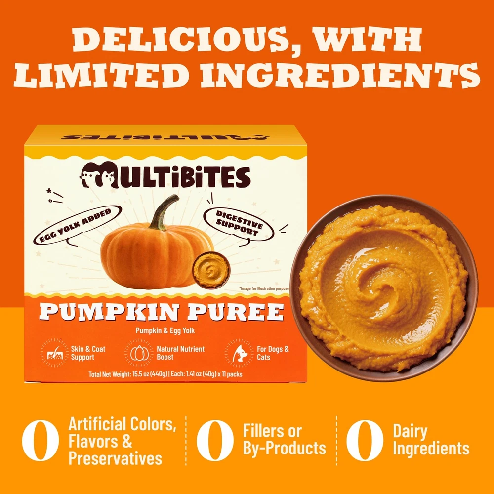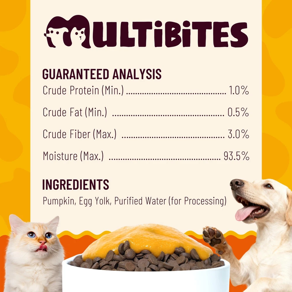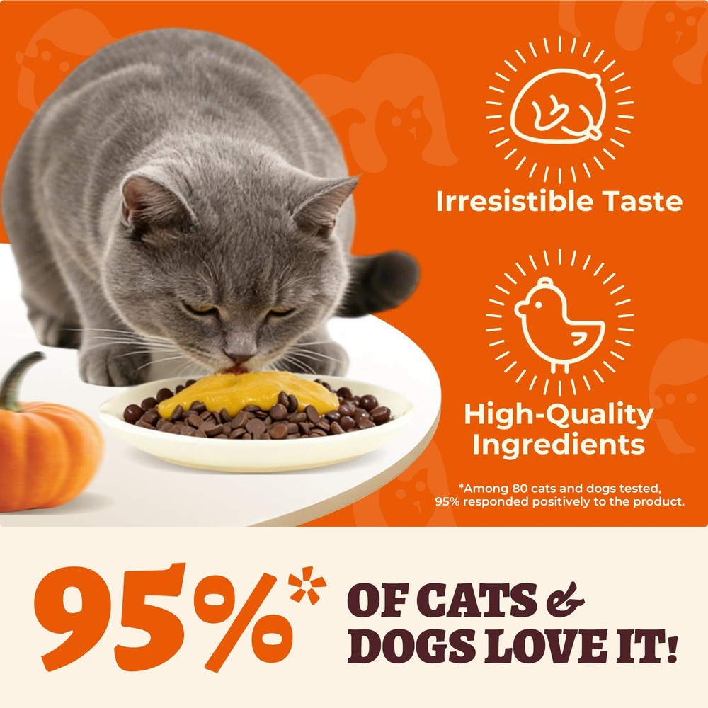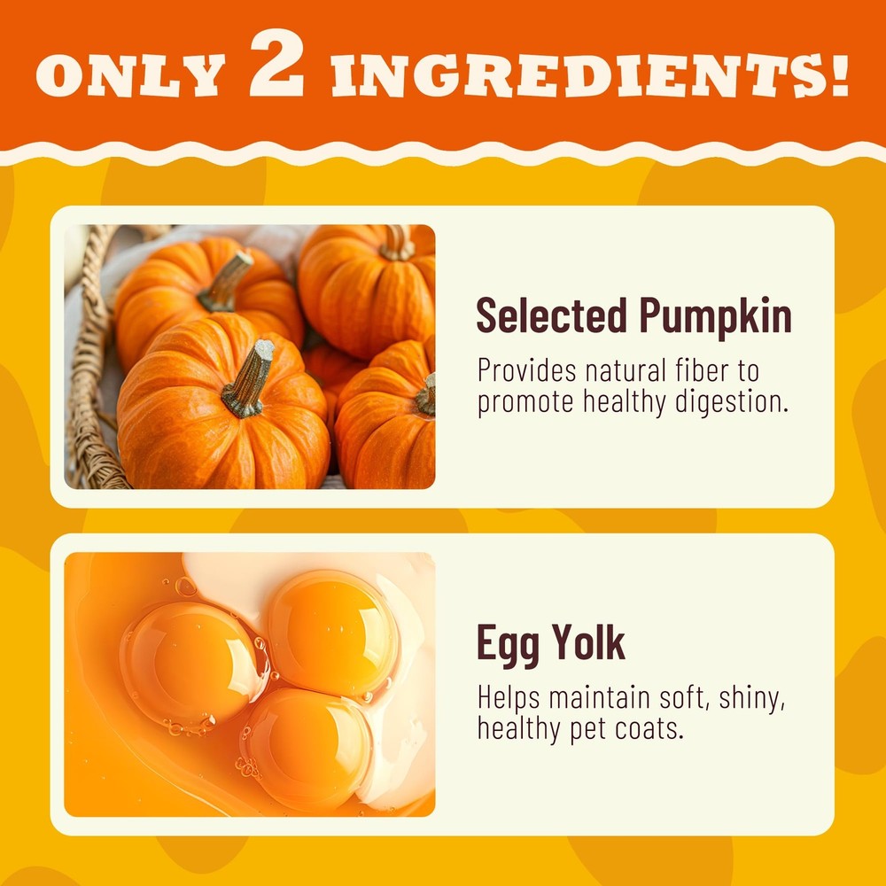 15.5oz Premium Pumpkin Puree for Cats & Dogs - Digestive Health,Sensitive Stomach for Soft Cat Treats - Natural Fiber Supplement for Dog Food Toppers,Kittens,Puppy Snacks Irresistible Puree Treats -This savory pumpkin puree made with the natural sweetness premium pumpkin and the rich taste of egg yolk. It's more than healthy dog treats, smooth texture makes it delicious lickable cat treats. It's a hit even with picky eaters Only 2 Ingredients - Selected pumpkin and a whole egg yolk. Pumpkin serves as a high fiber supplement for pets, paired with nutritious egg yolk, helps to support digestive health. No artificial additives, preservatives, makes it the ideal healthy pet treats Support Digestive Health - Smooth in texture, easy to eat and digest. The perfect blend of pumpkin and egg yolk provide a natural source of fiber, help with cat constipation relief and dog digestive support. It's ideal as sensitive stomach pet treats Promotes Firm, Regular Stool-This pumpkin puree is a natural fiber supplement, grain free, gluten free, that supports gut health for pets. It helps promote firm, regular stools, and assists with anti diarrhea for dogs, helps constipation relief for cats Easy to Serve for Dogs & Cats-This soft dog treats is a healthy dog treats for small, medium breed. Whether used as a daily dog fiber supplements, or simply as cat food toppers, or serve alone, you can trust that every serving provides pure, natural nutrition Convenient Pouch Packaging-Compared to canned pumpkin puree, our pack stays fresh in the fridge for 2–3 days after opening, it better preserves freshness, prevents moisture loss—making it ideal as squeezable cat treats and small dog treats