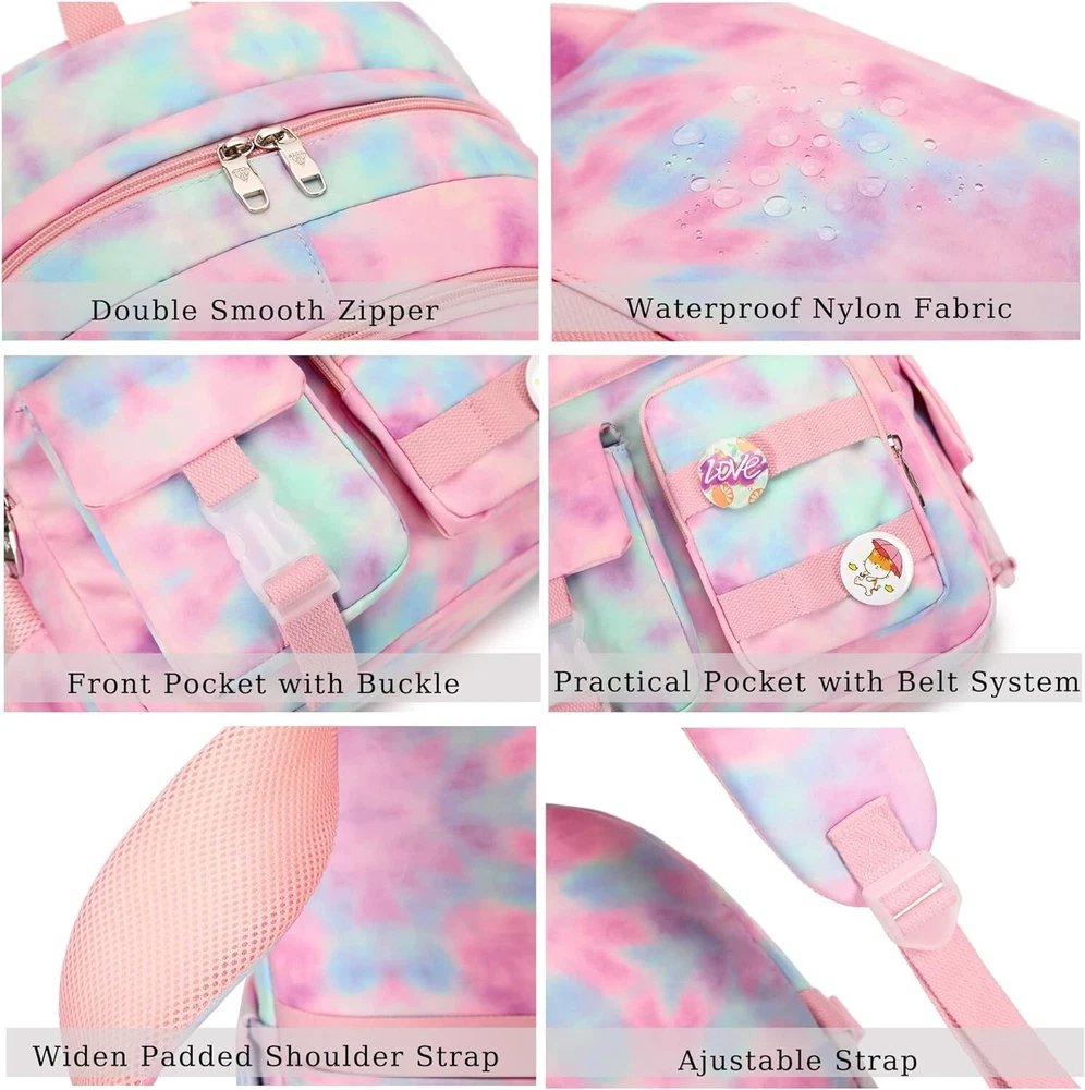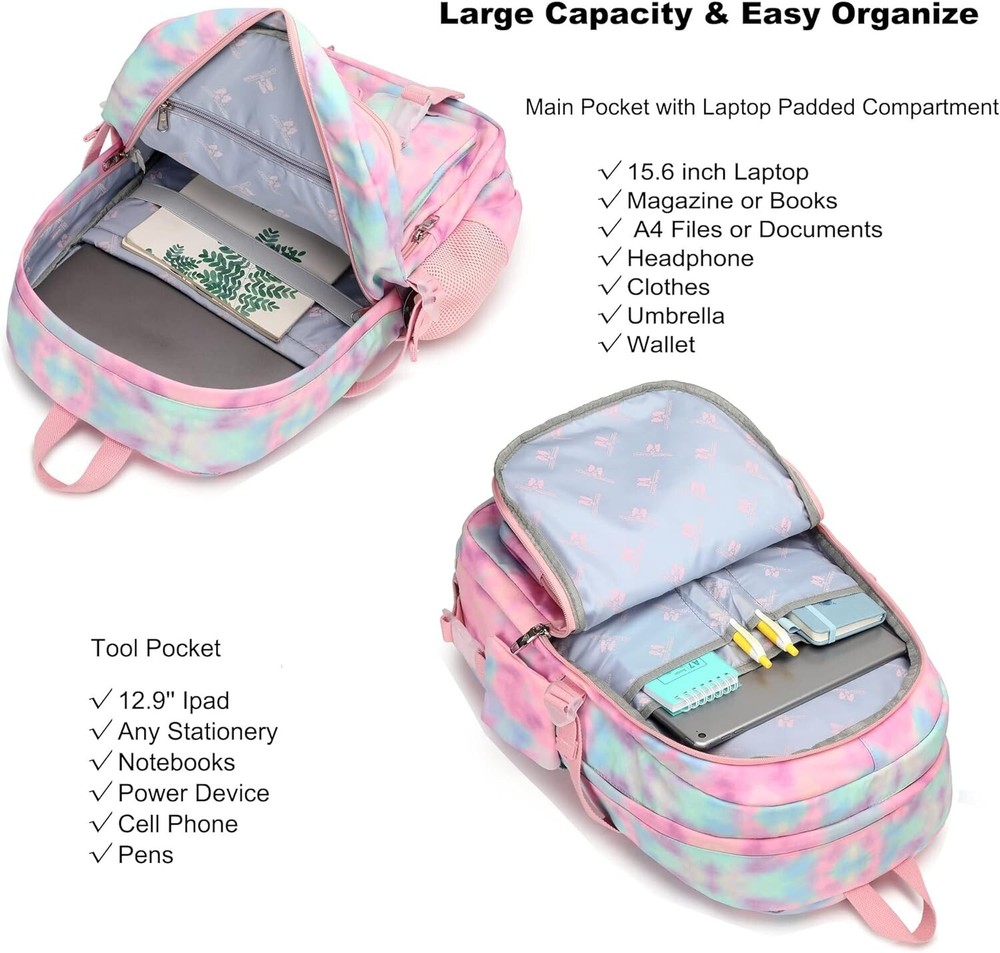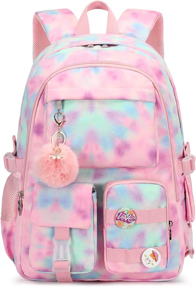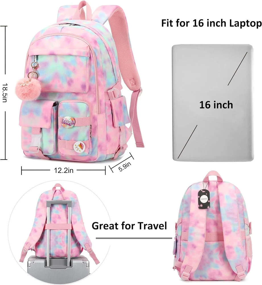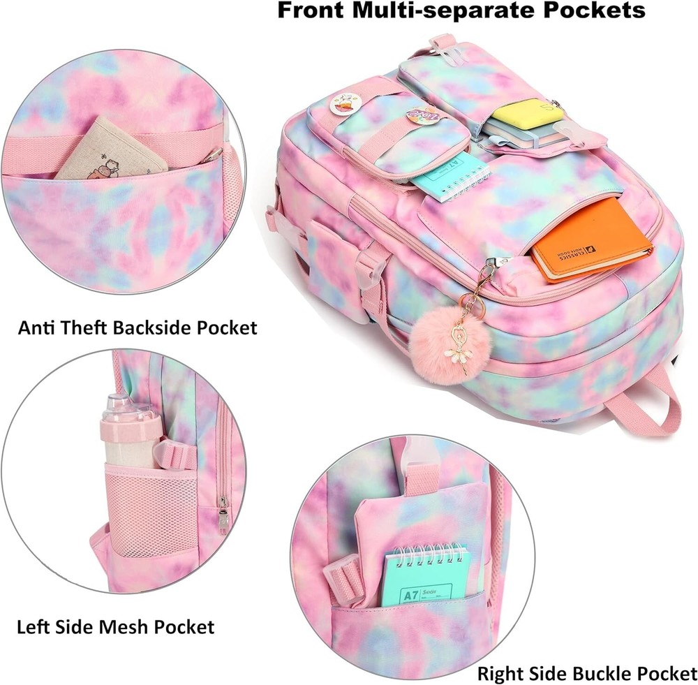 Laptop Backpacks in School Bag College Backpack Anti Theft Travel Daypack Large Bookbags for Teens Girls Women Students Tie-Dye Pink 【Large Size & Gift】: The size of back pack is """(L*W*H), LB. The laptop bag with padded compartment sleeve fit for , , inch tablet. This bag sacks also along with fluffy ball key pendant and personality badge as gift makes the bags more fashionable and unique 【Waterproof Material &Smooth Zipper】: The campus backpack is made of waterproof, ultra-lightweight, high density nylon fabric and cute printing polyester lining. The metal zippers closure are used by the premium quality zippers to ensure the long-lasting usage 【Safety & Comfortable 】: The considerate belt on the both side can create a solid base of support if you’re packing a lot of stuffs on the back packs. The Widen and thicken durable S-shape straps is well-padded, adjustable and comfortable to carry. The luggage belt on the back can be fitted on luggage/suitcase to make your travel more convenience 【Multi-compartments & Large Capacity 】: The big bookbag has 5 separate different size pockets and two side pockets meet your daily storage. The front three pockets can hold charge device and other small items, convenient for your daily organization. The main pocket of includes laptop padded sleeve with elastic belt and hidden inner zipper pockets. The front tool pockets also come with multiple compartments to provide roomy space for necessities 【For Any Ages & Occasion】The waterproof backpack purse is stylish enough for casual and Ladies use, while the design provides the multi functionality. Backpack perfect for young teens, ladies. The basic multipurpose daypack for most of your needs, easy to match your cloths, suitable for short trip, work, shopping, university, school, etc.