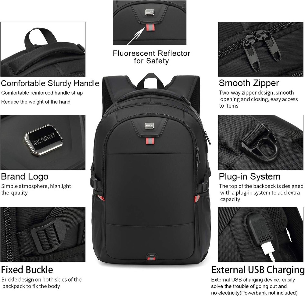 Super Big Storage Space for Your Daily Necessities(15.6 Inch Laptop and Tablet, Power Bank, A4 Files, Wallet, Clothes, Umbrella, Water Bottle and More Your Items). Lots of Pockets Make Your Items Organized and Easier to Find. THIS ITEM IS NOT INTENDED FOR USE BY CHILDREN 12 AND UNDER. Breathable Material Make Your Back More Comfortable and Adjustable Shoulder Straps Relieve the Stress of Shoulder. Made of Water Resistant and Durable Material, Metal Zippers Close and Open Smoothly to Ensure Long-lasting Usage Everyday. A Luggage Strap Allows Backpack Fit on Luggage/Suitcase, Slide Over the Luggage Upright Handle Tube for Easier Carrying. A Hidden Anti Theft Pocket on the Back Protect Your Wallet, Passport and Valuable Items from Thieves. Perfect Used for Office, Working, College, Business, Shopping, Dating, Travelling, Camping, Hiking, Walk a Dog, Value Gifts etc. A Must Have for Business Documents, College Supplies, Travel Accessories and Laptop Accessories. USB Port Design Offers You a More Convenient Way to Charge Your Phone While Walking. Please Noted That This Backpack Doesn't Power Itself, USB Charging Port Only Offers an Easy Access to Charge. Product Description Large Multi-Compartment and Pocket Separate Laptop Compartment Padded Laptop Compartment: shockproof padded sleeve compartment fits laptop up to 15.6 inch. Front Organizer Compartment Front Easy Access Zippered pockets: for Phones, pen, keys, wallet, purse, glasses and other small items. Large Main Compartment Main Compartment: clothes, travel accessories, books, binders, tech electronic accessories, headset, magazine, camera, CD's,etc Feature for INSAVANT Travel Laptop Backpack Luggage Strap / Suitcase Sleeve Luggage / Suitcase strap on the back is great to slide over the luggage tube and attached to your rolling luggage securely for easier transport. Don't have to carry the backpack on your back, less burden on your shoulder and back when on the go. External USB Charging Port Travel laptop backpack with USB charging port offers quick access to charge your phone and all USB devices conveniently, also other electronic devices such as compatible for kindle devices.(Portable Power is NOT INCLUDED) Anti-Thief Zipper Back Pocket The hidden theft proof pocket designed on the back sits up against the wearer's body. Anti-Pickpocket back pocket is difficult to steal personal items, store your valuables such as passport and money when traveling so no one can get into it without you feeling it. Best Gifts for Men and Woman Gifts for him, Gifts for her, Gifts for husband, Gifts for wife, Gifts for girlfriend, Gifts for boyfriend, Mothers Day Gifts, Fathers Day Gifts, Anniversary Gifts, Birthday Gifts, Valentine's Day Gifts, New Year's Day Gifts, Labor Day Gifts, Halloween Gifts, Thanks Giving Gifts, Christmas Gifts. About INSAVANT Laptop Backpack Material Details Laptop Backpack: Sturdy Laptop Backpack has One Separate Laptop Compartment for iPad, Macbook, Laptop(Size Up to 15.6 inch) and Other Electronic Devices, Make Your Items Organized and Safe. Travel Backpack: Perfect for Occasional International Travel / Weekend Short Trip Getaways / Airplane Travel / Outdoor Hiking Camping Backpack for Men and Women. School Backpack: The Extra Large School Backpack is Your Back to School Essentials. Perfect for Classrooms, College Students, High School Students, Teachers, and Outdoor Activities. Great Gift Chioce: Best Father's Day/ Mother's Day Gift for Your Husband / Wife / Lover / Son / Daughter / As Everyday Backpack, Work Backpack, Professional Business Laptop Backpack for Men Women Adult Teens or Daily Use at Anywhere.