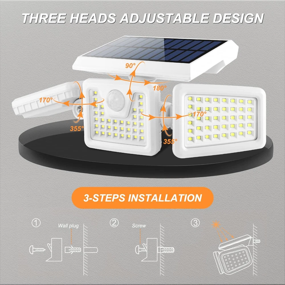 【MOTION SENSOR】: Solar Motion Sensor Light Outdoor is equipped with 120 degree angle and sensitive motion sensor, which can provide illumination widely and without delay. Once the sensor of Solar Spotlights Outdoor detect the motion, there will be 30s illumination and without motion detected for long time the lights will auto turn off. 【BATTERY CAPATITY】: The Solar Outdoor Lights are built-in replaceable battery, which can provide 1500 times illumination with fully charge. The Solar LED Lights Outdoor will be charged auto in daytime and start working in darkness. So please install these lights under sunshine for effective battery charging. 【IP65 WATERPROOF】: The Solar Lights with Motion Sensor are waterproof, heat-resistant, frost resistant, suitable for most weather conditions and suitable for outdoor patio, garden, lawns, deck, yard, drive, outside wall, fence, etc. 【EASY TO INSTALL】: The package of LED Solar Lights includes brackets and screws of each lights. The outdoor security lights motion can be mounted on the wall with screws and great for patios, lawns, patios, front door etc. 【SPECIFICATIONS】:Solar Panel: 1.8W, 5.5V; Wattage: 8W; Lumen: 550lm; LED qty: 156 pcs; Battery: 3.7V; Waterproof Rate: IP65; Installation Type: Wall Mounted; Sensor Angle:120 Degree; Color Temperature: 6500K; Modes: Off / Sensor Product Description Flexible Heads 3 head solar lights outdoor with adjustable design, can be rotated freely to any angles for your needs. IP65 Waterproof With IP65 waterproof, our solar lights outdoor are suitable for any weather and places like patios, lawns, and patios. Solar Powered Solar motion sensor lights with solar panel will light up at night while sensing motion and charge in the day time. INCX Solar Lights Outdoor with Motion Sensor Solar Panel: 1.8 W, 5.5 V; Wattage: 8 W; Lumen: 550 LM; LED QTY: 156 PCS; Rechargeable Battery: 3.7 V; Waterproof Rating: IP65; Installation Type: Wall Mounted; Sensor Angle:120 Degree; Color Temperature: 6500 K; Modes: Off / Sensor.