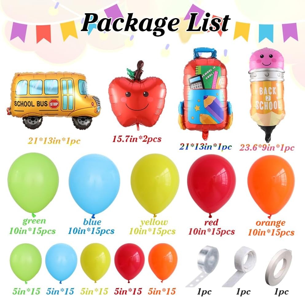 Free eBay listing template designed by dewiso.com 158pcs Back to School Balloon Garland Arch Kit, School Bus House Pencil Bag Foil Balloon with Rainbow Balloons for First Day of School Kindergarten Graduation Party Supplies FREE AND FAST SHIPPING! About this item Back to School Balloon Garland: 5pcs foil balloons + 30pcs red latex balloons + 30pcs orange latex balloons + 30pcs yellow latex balloons + 30pcs green latex balloons + 30pcs blue latex balloons + 3pcs balloon accessories Premium Material: All of our latex balloons are made of natural non-toxic latex. All materials are of high quality and good safety, please feel easy to use. With thick skin, they are not easy to pop out and can stretch well Widely Applications: The balloon arch can celebrate both indoor and outdoor activity, such as Back to School theme party, The First Day of School Party, Graduation, Kindergarten, Pre-school, Primary School Events, Birthday, Baby Shower and so on Warm Tips: You can inflate all the balloons to 90%. Please avoid sunburn, overheat, pointed object and excessive friction, strong wind may cause popping Easy to Assemble: We provide a long balloon stripe and dot glue to help you to make balloon arches more easily.The garland is bendable to the shape you want.Hope you enjoy the fun of DIY Product We offer a 30-Day Return Policy on items which you are not completely satisfied with. You have the option for a full-refund or an exchange of the item. No returns are available on items shipped outside of the US . Shipping We offer Free Shipping to the US and ship within 2 business days of payment, usually sooner. We use UPS express shipping. That's why your products are usually delivered within 3 days . Contact We try our very best to make sure every customer is completely satisfied. If there's a problem , message us! We're happy to help. 24/7 live chat available.
