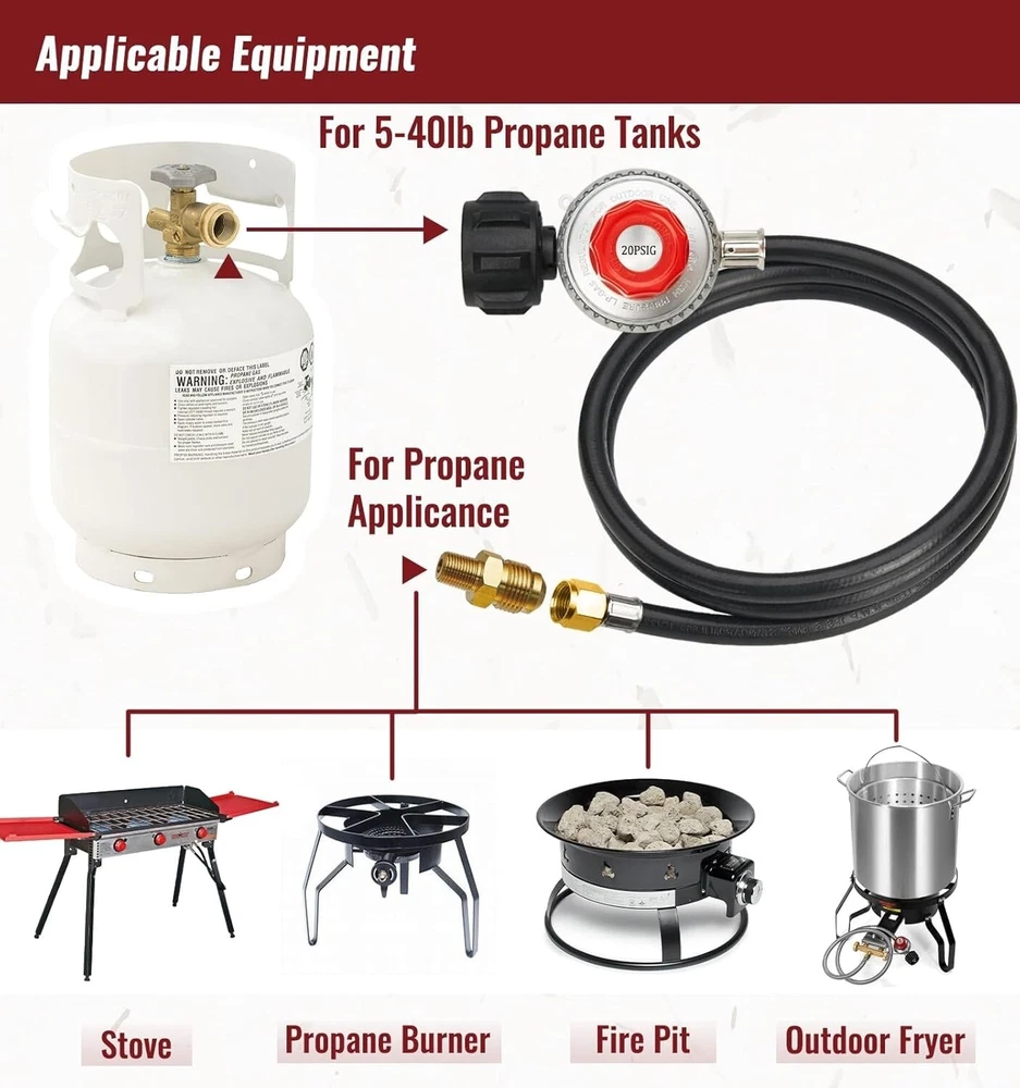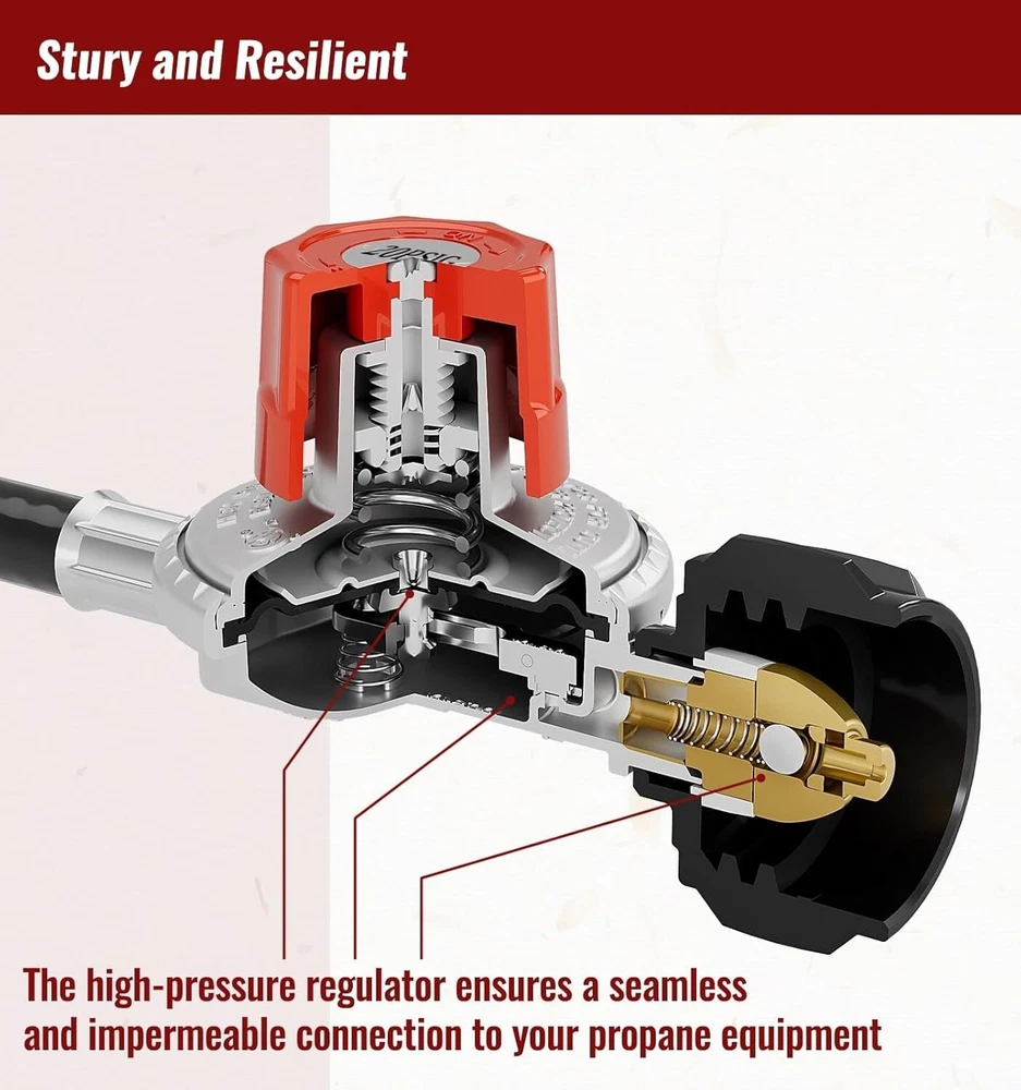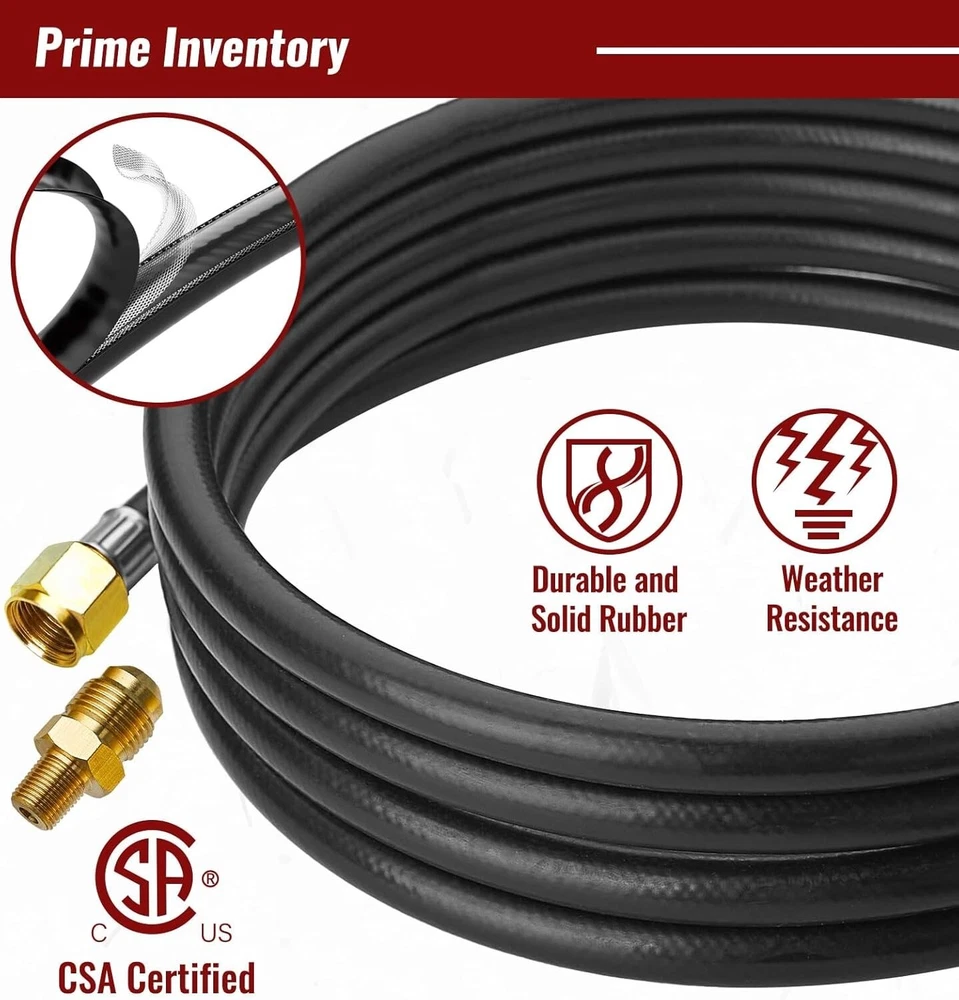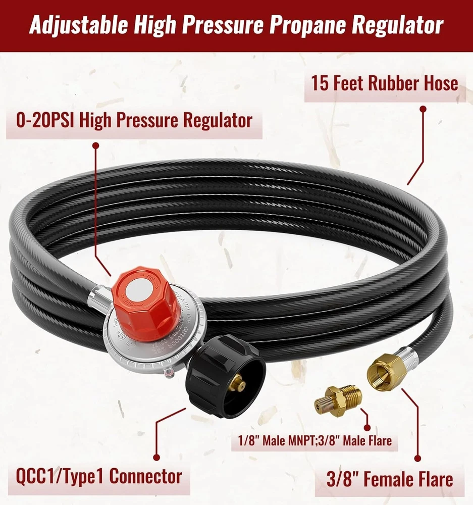 15FT High Pressure Propane Regulator Hose with Gauge 0~30PSI Adjustable Propane Size:15 Feet Color: Rubber Constructed from high-quality rubber, this hose offers exceptional durability and flexibility, making it ideal for a variety of high-pressure applications. HIGH-PRESSURE DESIGN Expertly designed for a wide range of pressure adjustments, this hose operates smoothly between 0-20 PSI, making it versatile for various applications. Meets the rigorous standards of the Canadian Standards Association (CSA), ensuring top-notch safety and quality. Backed by a strong commitment to customer satisfaction, ensuring a positive experience with our product. BRASS CONNECTOR Provides a 15-foot reach, The hose is designed for a secure connection with Type-1 (QCC-1) propane tank connectors. It features an internal ⅜-inch flare fitting and an external diameter of ⅝ inches, ensuring a reliable and tight fit Return Policy: We offer a 30 day return policy from the receiving date. Please contact us for a Free Return Label. Please use our return label so it will go back to our supplier and we can do a refund or replacement afterwards. Feedback: Your satisfaction is very important to us! If you have any problem with your order, please contact us and we will do our very best to make you satisfied. As long as you are happy with your purchase, please leave a positive feedback for us. We will always leave you a positive feedback in return. If you have any problem with your purchase, please do not leave a negative feedback. Please Contact us ... and your issue will be solved quickly and positively We are a small family-owned business trying to make a living, not a huge company that does not care ... We will ALWAYS do our best for you!