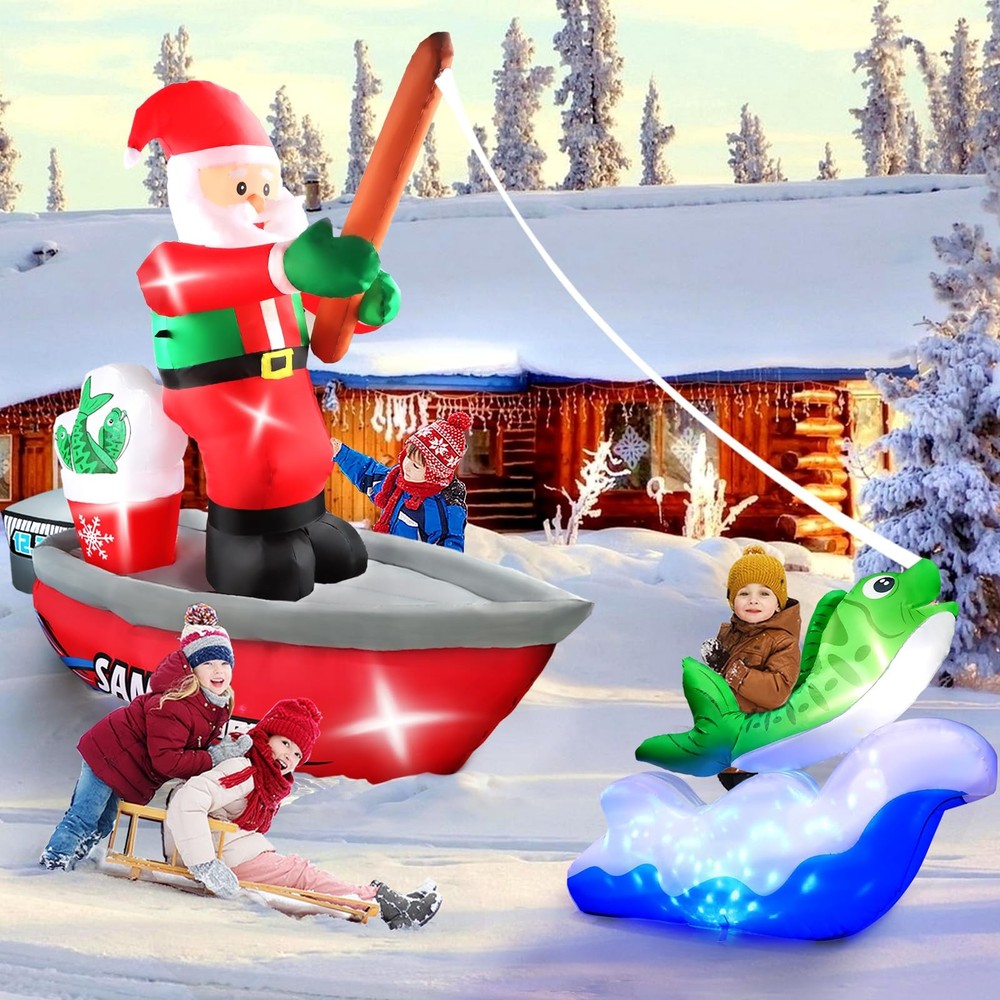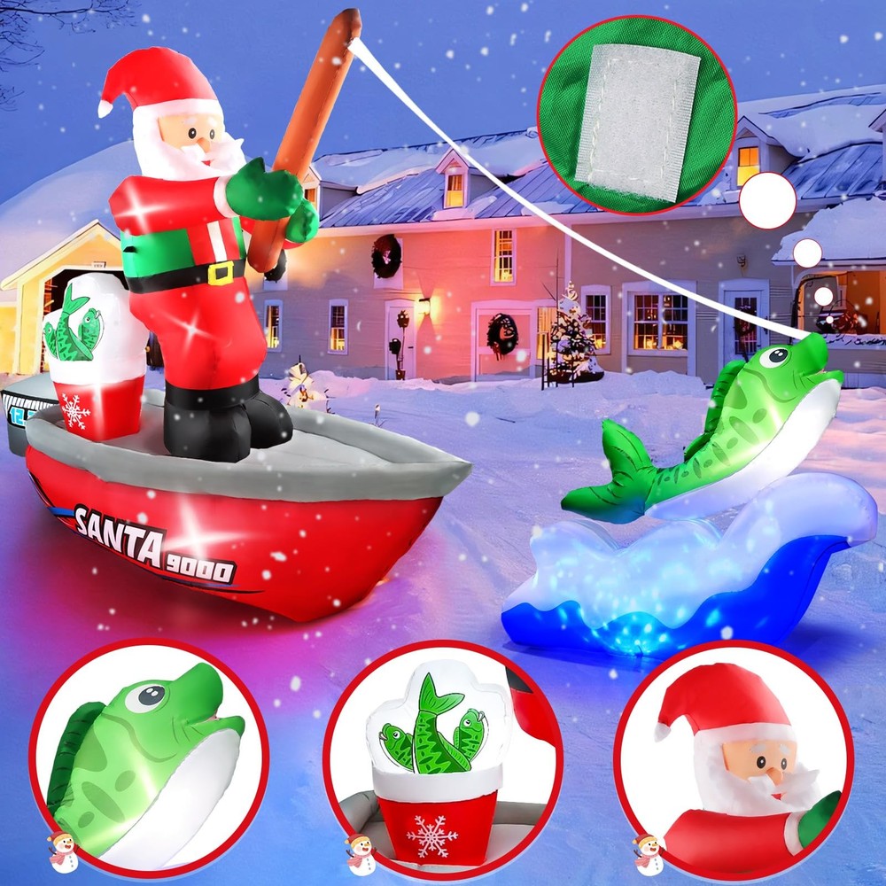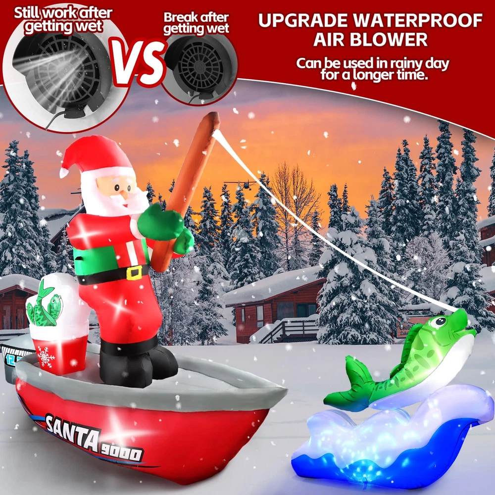 15FT Long Christmas Inflatables Fishing Santa Claus, Santa Inflatables Blow Up Yard Outdoor Decorations with Built-in Rotating Blue LED Lights for Xmas Party Yard Garden Lawn Indoor Decors Product Feature: 1.Sturdy and Waterproof- Made of high-quality polyester fabric, it is weather-resistant and fade-resistant, will not rips and tears easily. 2.Fast Inflates & Safety- Equipped with a powerful built-in fan that can be inflated in minutes. The CE and UL standard safety-certified adapter ensures the safety for usage. 3.Eye Catching LED Light- Built in bright LED lights to illuminate your lawn or garden, attracts the attention of neighbors and children, create a perfect night display effect. Product Specifications: Fabric: Waterproof Polyester Size: 15Ft Long Color: Colorful Design: Christmas Inflatables Fishing Santa Claus Power: Plug in Package Include: 1 x Christmas Inflatables 4×Buckle 10×Ground Stakes 4× Fixed Rope 1×Power Adapter 2×Air Blower 5× Build-In White Led Light 1× Build-In Blue Rotating Projection Lamp t 3× Build-In Sandbag 3× Patch Cloth 【15FT Christmas Inflatables】Make a splash this holiday season with 15FT Christmas inflatable! Featuring a jolly Santa Claus reeling in a big catch while riding his Santa Fishing boat on the sea waves, this holiday decoration is specially designed in two separate parts for easy setup and mobility without sacrificing impact. Perfect for adding a touch of festive fun to your Christmas display. 【Built-in Rotating LED Lights】Watch your yard come alive with this eye-catching blow up yard decoration! Features a rotating projection lamp and 5 bright white LED lights, this Santa inflatable is perfect for creating a playful and vibrant atmosphere that's sure to impress everyone passing by. Whether it's day or night, the dynamic rotating LED lights will surely light up your yard to draw attention from everyone around. 【Upgrade Air Blower】Enjoy long-lasting use with our upgraded air blower. It's waterproof, powerful, and won't break easily, even in wet conditions, it can still work well. Simply zip up the bottom, plug it into a standard outlet, and the Christmas inflatables fishing Santa Claus will inflate in minutes. With CE and UL safety certifications, you can feel confident that your Xmas inflatable are safe and secure. 【Premium Quality】Our blow up inflatable are crafted from high-strength polyester fabric, ensuring superior water and fade resistance and protection against rips and tears. With air-tight stitching technology, our Christmas inflatables outdoor decorations ensure longevity and can withstand any weather condition, from wind to snow. 【Versatile Christmas Decoration】Our Christmas inflatables with built-in light will come with all necessary components - 10pcs ground stakes, 4pcs metal buckle, 2 black ropes, 2 white rope 3pcs patch cloth and 3 built-in sandbag that ensuring maximum stability and durability. Its compact and lightweight design makes it portable and easy to store. Perfect for placing in the garden, yard, walkway, patio, lawn, indoors or outdoors parties.