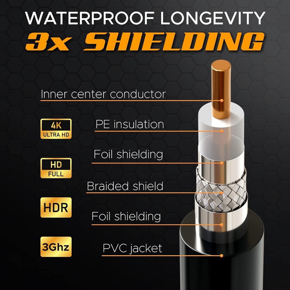 15FT RG6 Coaxial Cable Connectors Set- High-Speed Internet, Broadband and Digital TV Aerial, Satellite Sky Cable Extension - Weather-Sealed Double Rubber O-Ring and Compression Connectors Black UNLIKE OTHER COAX CONNECTORS THAT give you a SPOTTY SIGNAL and an INCONSISTENT connection, the 75ohm Standard Shield RG6 Cable provides a solid, RELIABLE CONNECTION and effectively extends your signal, due in part to its nickel-plated brass COMPRESSION connectors – known as the best type of F connectors to shield signals from noise. Our F type connector is compatible with all RG6-wired devices: BROADBAND & high-speed Internet, SATELLITE TV, digital TV, and more. FRUSTRATED WITH THE LOW QUALITY OF other COAXIAL CABLES that break and STOP FUNCTIONING after just a few weeks – or worse, don’t work from the get-go and FALL APART when you first connect them? At , we pride ourselves on engineering some of the highest-quality, most DURABLE compression coax connectors & cables on the market, so they’re sure to become your reliable go-to. Our hardy DOUBLE RUBBER O-ring is even WEATHER-SEALED, so our extension cable is safe for both INDOOR and OUTDOOR use. YOUR COMPLETE COAXIAL CONNECTION KIT. Our -quality coaxial cable connector set includes everything you need for a FAST, STABLE CONNECTION: 75OHM RG6 Standard Shield Cable, BRASS Compression Connectors (nickel-plated), WATERPROOF and weather-sealed Double Rubber O-Ring for both inside and outside use, LEAD-FREE PVC Jacket, and an EASY-ROTATE Nut for connecting to your device. Also includes an EXTRA EXTENSION COUPLER, so you can connect multiple cables and extend your total cord length! OUR CUSTOMER PROMISE: At , we’re committed to our customers’ ABSOLUTE SATISFACTION. If for any reason you aren’t thrilled with your internet and TV aerial extension cable within 30 DAYS of purchase, simply contact me directly to send back your undamaged coaxial cable compression connector set, and we will return your F connector to coax cable PAYMENT IN FULL. We also offer a 12- satisfaction on our compression coaxial connector and cable for a free or full reimbursement. AT , WE’RE COMMITTED TO engineering top-of-the-line cables and connectors with SUPERB FUNCTIONALITY. Founded by a group of passionate, innovative electronics experts in the United Kingdom, our company offers excellent performance in such categories as Data Cable, Audio & Video Accessories, Television & Tele Cables, Brush Faceplates, and more. Our CUSTOMER SERVICE TEAM is standing by to help you with anything you need – we reply to all inquiries WITHIN 24 HOURS.