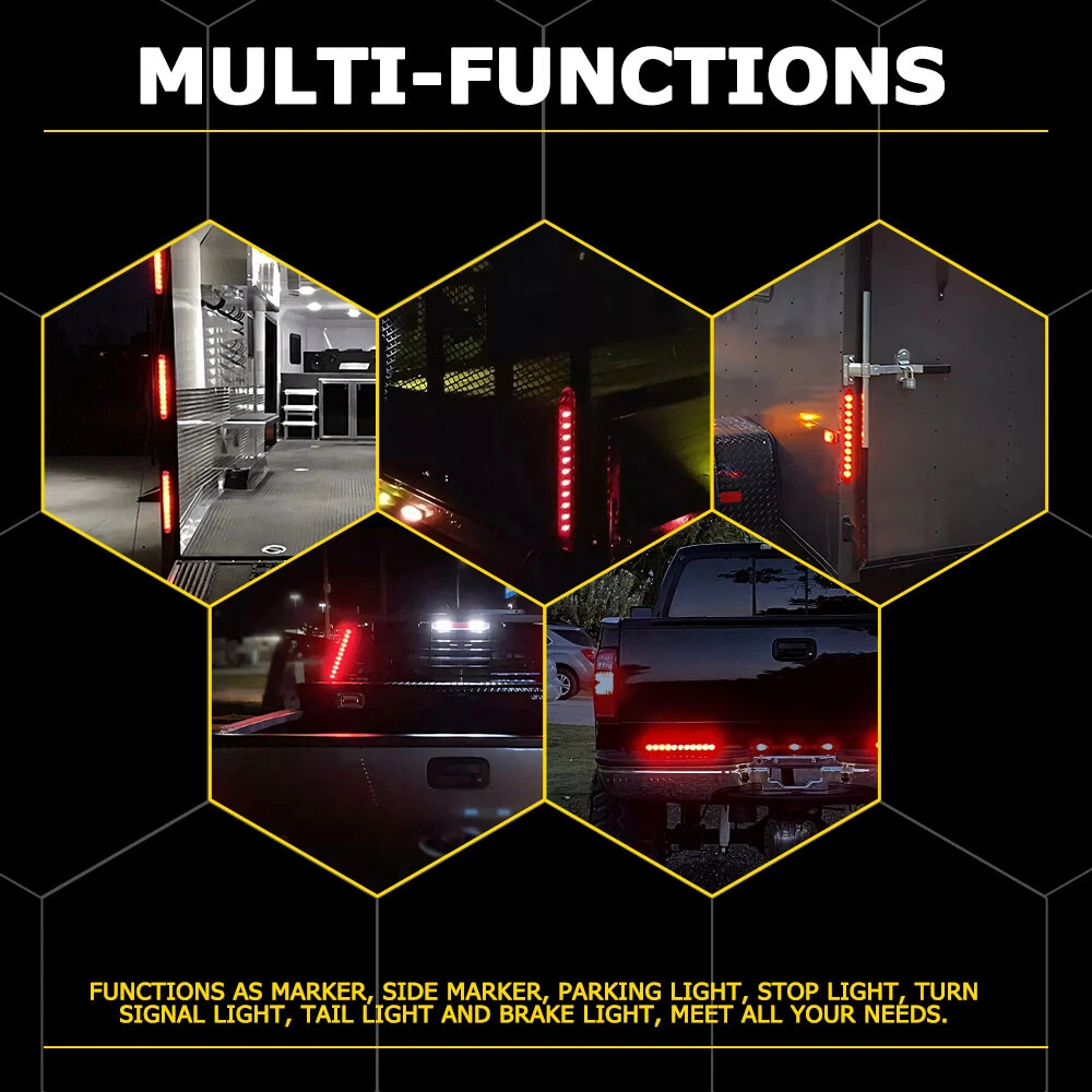 Specifications: Size: 15inch Lens color: Red Lighting color: Red LED quantity: 11 LED Material: PC lens+ LED beads Voltage: 12V Waterproof rate: IP67 Service life: 50000h+ Wire connection: White wire: Negative (the ground) Black wire: Tail/running light Red wire: Brake/stop light Light model: Black wire: Low bright red Red wire: High bright red Function: Functions as Clearance, Side Marker or Identification Light, Stop, Turn, Tail and Reverse Signal Light. Suitable scene: Fit for most of vehicle styles such as Heavy Duty Trucks, Semi Trailers, Cargo Trailers, Boat Trailers, work Vehicles. Features: 15INCH 4X Light 11LED Bar Turn Red Stop Tail Light Brake Strip For Truck Trailer Specifications: Size: 15inch Lens color: Red Lighting color: Red LED quantity: 11 LED Material: PC lens+ LED beads Voltage: 12V Waterproof rate: IP67 Service life: 50000h+ Wire connection: White wire: Negative (the ground) Black wire: Tail/running light Red wire: Brake/stop light Light model: Black wire: Low bright red Red wire: High bright red Function: Functions as Clearance, Side Marker or Identification Light, Stop, Turn, Tail and Reverse Signal Light. Suitable scene: Fit for most of vehicle styles such as Heavy Duty Trucks, Semi Trailers, Cargo Trailers, Boat Trailers, work Vehicles. Features: *Excellent material Made of superior material to ensure its long service life and high durability. *Waterproof Waterproof with fully sealed design, prevent air, bubbles or little stones enter into inner space to broke the tail light bar. *Clear wiring 3 Wires connection system, white wire connect to negative pole (Black wire: low bright red/Red wire: high bright red). *Multi-functions Each light has 11 high quality LED diodes, providing maximum visibility. Functions as marker, side marker, parking light, stop light, turn signal light, tail light and brake light, meet ALL your needs. *Wide application Fit for most of vehicle styles such as Heavy Duty Trucks, Semi Trailers, Cargo Trailers, Boat Trailers, Work Vehicles, etc. Packaging include: LED tail light bar*4 Screw for mounting*8 Item Specifics Brand AUXITO Application Clearance, Side Marker or Identification Light Application 2 Stop, Turn, Tail and Reverse Signal Light Dimension 15 inch Dimensions 15.55" x 1.27" x 1.02" Fit For For Pickup, truck, trailer, boat, Lorry, Van, caravan Fitment Universal For Any 12V Vehicles Heavy trucks Fitment Type Direct Replacement LED Type 11pcs super bright Red LED Manufacturer Part Number For Heavy Duty Trucks, Semi Trailers, Cargo, Boat Trailers Number of Bulbs 4 Type Rear Tail Lights/Brake Lights Bar Voltage 12V-24V Manufacturer Warranty 2 Years Waterproof Rate IP67 Light Color Red Universal Fitment Yes Bulb Life Hours Up to 50,000 Hours Placement on Vehicle Rear Payment We accept PayPal via eBay Secure Check-Out only. Immediate payment needs to be processed for items with Add to Cart option so that any promotional discounts can be applied to your order immediately. Shipping 1 .We do everything we can to ship your orders out as soon as possible. 2. Shipping and Handling: We process orders within two business day after the payment was clear. Returns Our 30-day Satisfaction Guarantee assures our customers that they will receive all orders promptly and exactly as described. In addition, it allows customers to return new and unused products in their original factory condition for any reason within 30 days from the date of purchase. 1. All returns must be pre-approved by AUXITO and have a return merchandise authorization(RMA) number. Unauthorized returns will not be accepted. 2. Buyers are responsible for appropriate packing, returning shipping cost, insurance and returning the item in "new" condition. Used items will not be accepted for return. 3. We will replace the returning item with an identical item, issue a full store credit or a full refund. Contact Us Our Working Time:(GMT+8)Monday to Friday,9:00-18:00. For inquires and customer support, please send your email via ebay email system. All emails will be responded to within 24 hours during business days. Feedbacks 1. We appreciate your business and strived to improve our customer service and our commitment to quality. 2. We will leave a positive feedback immediately after payment is received. We appreciate a positive feedback as much as you do. 3. If for some reason there is any issue with the purchase, please contact us prior to leaving feedback, and we will be glad to work with you to have it resolved. DESCRIPTION PAYMENT SHIPPING RETURN POLICY CONTACT US Hot Item Fit For 2015-2019 Hyundai Center Light Gray Sonata Armrest Console Lid Cover USD 13.29 4" Red Truck Long Performance High Flow Cold Air Intake Cone Dry Filter Cotton USD 27.54 Waterproof Motorcycle Handlebar Dual USB Phone Charger Cigarette Lighter Socket USD 13.29 190 PCS Bumper Fender Moulding Side Garnish Grille Retainer Clip ABS Various USD 10.99 AUXITO 7440/7443 Turn LED Signal Light Bulbs Anti Hyper Flash Amber Super Bright USD 21.84 Hot Item AUXITO 7440/7443 Turn LED Signal Light Bulbs Anti Hyper Flash Amber Super Bright USD 21.84 Fit For 2015-2019 Hyundai Center Light Gray Sonata Armrest Console Lid Cover USD 13.29 4" Red Truck Long Performance High Flow Cold Air Intake Cone Dry Filter Cotton USD 27.54 Waterproof Motorcycle Handlebar Dual USB Phone Charger Cigarette Lighter Socket USD 13.29 190 PCS Bumper Fender Moulding Side Garnish Grille Retainer Clip ABS Various USD 10.99 15INCH 4X Light 11LED Bar Turn Red Stop Tail Light Brake Strip For Truck Trailer Specifications: Size: 15inch Lens color: Red Lighting color: Red LED quantity: 11 LED Material: PC lens+ LED beads Voltage: 12V Waterproof rate: IP67 Service life: 50000h+ Wire connection: White wire: Negative (the ground) Black wire: Tail/running light Red wire: Brake/stop light Light model: Black wire: Low bright red Red wire: High bright red Function: Functions as Clearance, Side Marker or Identification Light, Stop, Turn, Tail and Reverse Signal Light. Su