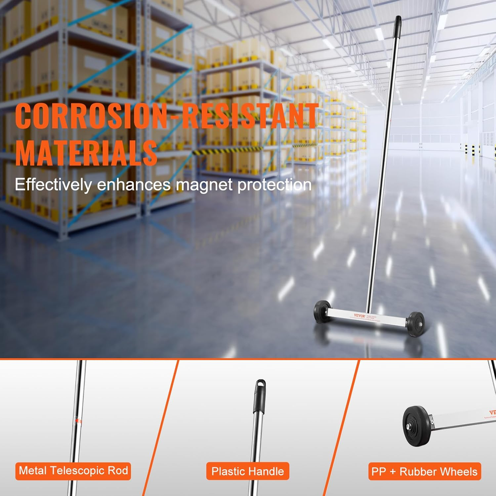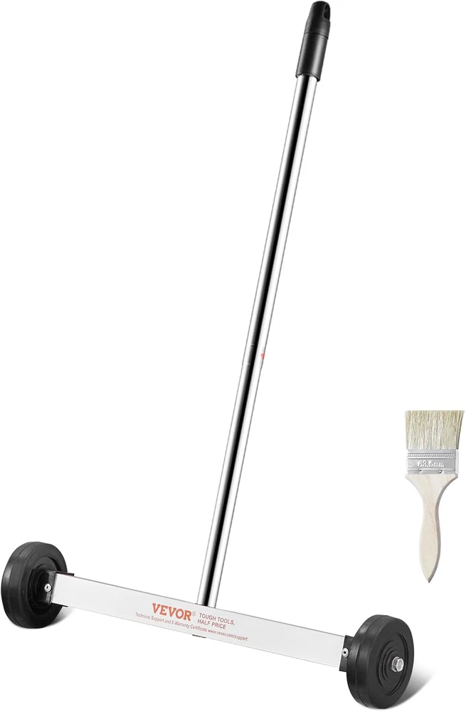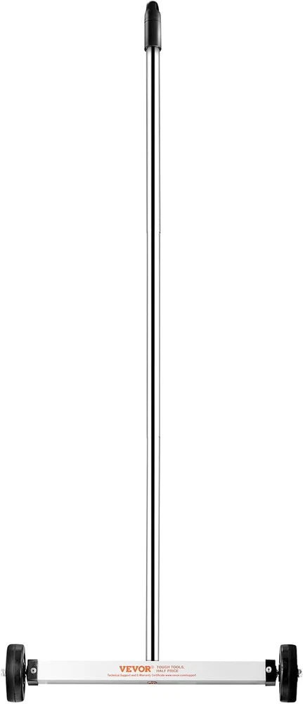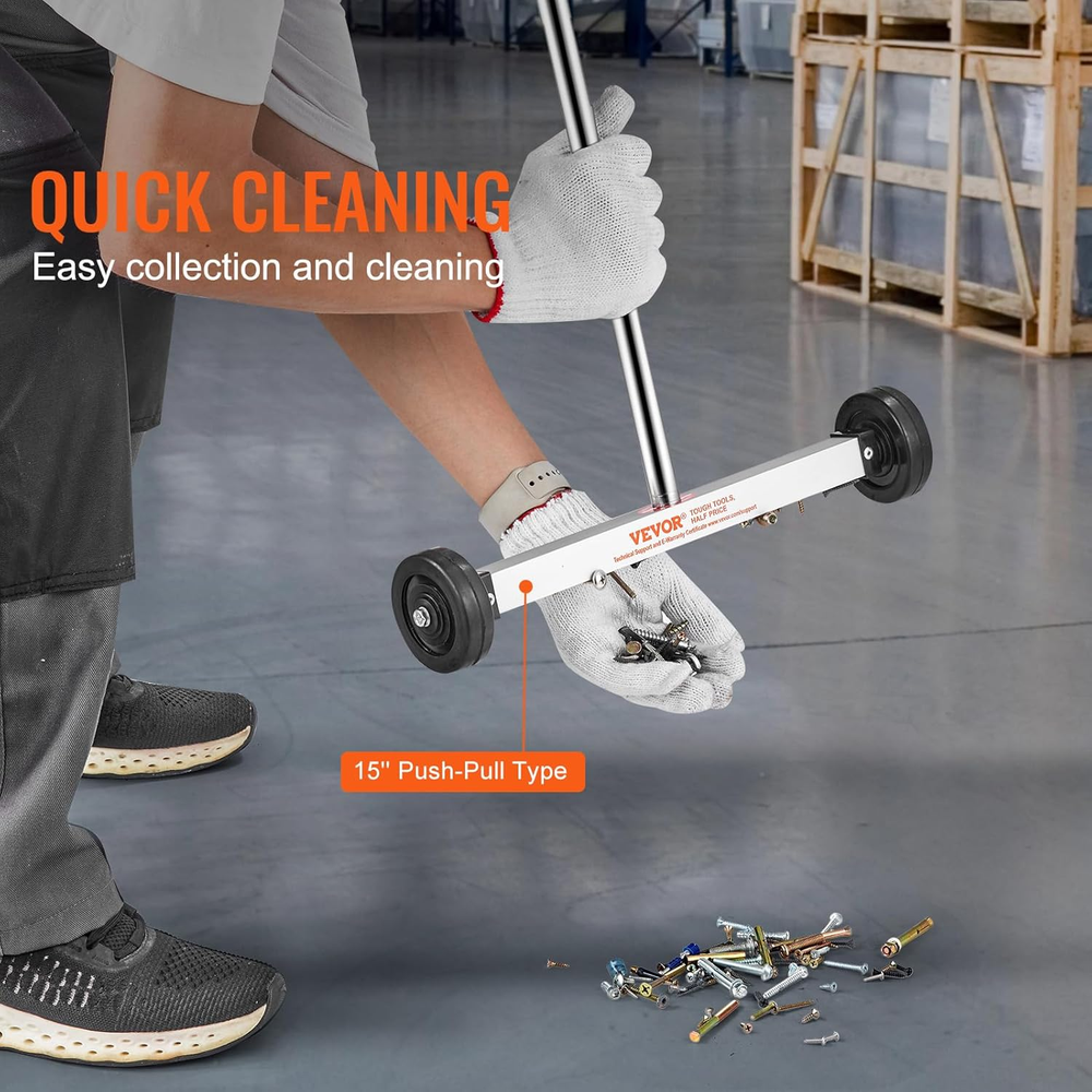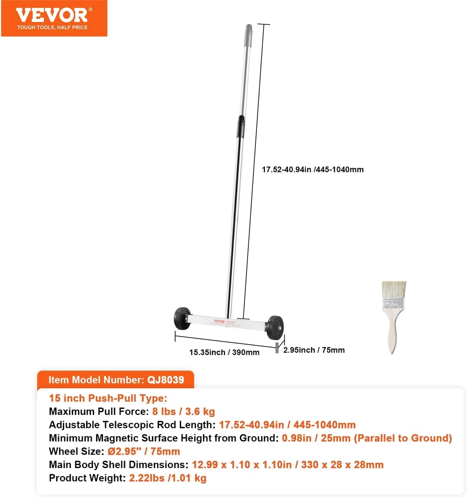 Strong Magnetic Power: This 15'' mini magnetic sweeper maintains a load capacity of up to 8 lbs (3.6 kg), making it easy to quickly collect nails, screws, and black metal debris, protecting you from shards and sharp metals. Lightweight and Portable: The 15-inch rolling magnetic sweeper features an adjustable telescoping handle from 17.52 to 40.94 inches (445-1040 mm) and weighs only 12.37 lbs. It saves space and is perfect for narrow areas, ideal for collecting nails or small metal parts in homes, small spaces, or yards. Easy to Use: The magnet sweeper is designed with an ergonomic rubber handle for a comfortable, prolonged grip. The Ø2.95-inch (75 mm) wheels effortlessly clean over gravel and grass surfaces. It includes a brush for added convenience. Durable Construction: Made from high-quality materials including aluminum, plastic, magnets, and iron, the nail magnet sweeper withstands demanding work environments. Featuring an aluminum alloy shell that's durable and corrosion-resistant. The anti-disassembly screw design ensures stability, while the PP + rubber wheels provide durability and traction. Versatile Application: With a wide cleaning range, the magnetic nail sweeper efficiently picks up damaged nails, screws, and black metal waste, especially useful in garages, roofing projects, or post-automotive or mechanical repairs. Pro tip: After projects, clean floors, lawns, garages, and workshops to prevent injuries. Product Description VEVOR Magnetic Sweeper - Say Goodbye to Metal Debris This 15'' push-pull rolling magnetic sweeper is equipped with magnets capable of pulling up to 8 lbs (3.6 kg), swiftly collecting excess metal debris wherever needed. Compact and lightweight, this magnetic sweeper is easy to carry and store, ensuring efficient workspace organization wherever your job takes you. Easy to use, this magnet sweeper simplifies operation without requiring professional guidance. Follow straightforward steps for effortless cleaning, making it accessible even for beginners. Our nail magnet sweeper features a corrosion-resistant metal base and ergonomic rubber grips for durability and comfort. PP + rubber wheels provide durability and traction, while anti-disassembly screws ensure stability and longevity. With an exceptionally wide cleaning range, the magnetic nail sweeper covers more ground and absorbs more metal, making it suitable for construction sites, factories, warehouses, and more.