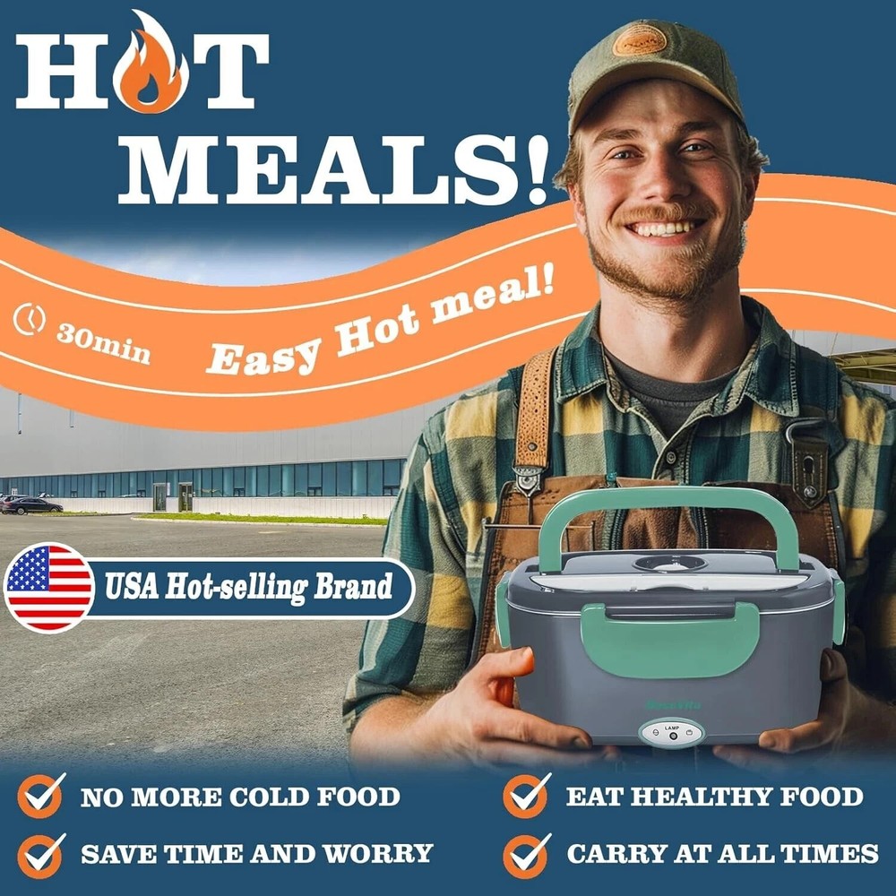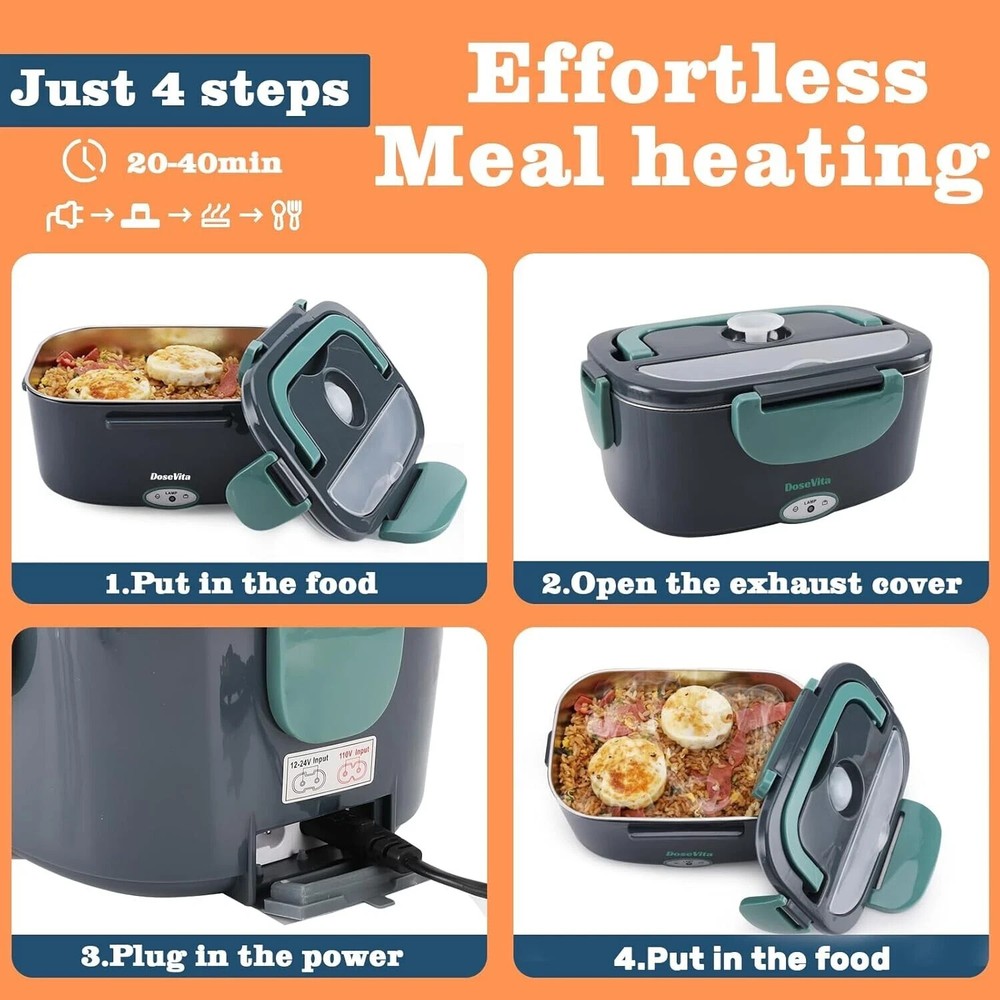 Large Capacity & Portable - Contains a 1.5L stainless steel liner and a 0.45L food-grade plastic compartment, suitable for matching different meals and achieving nutritional balance! Detachable design makes cleaning very easy! The top cover of the lonchera eléctrica portátil has an anti-scald handle and storage room for cutlery, it is very convenient to carry outdoors! (Note: Don’t immerse the body in water, Don’t add water to the heated base) Leak-proof Design - Electric lunch box cover has latches on all four sides, making the overall structure stronger. And the built-in rubber sealing ring plays an excellent leak-proof role. Even in a shaking car environment, there is no need to worry about food spills! The self-heating lunch box is specially designed for the office, car, truck, outdoor work, or people who work on the go. 3-in-1 Portable Food Warmer - It is equipped with 2 power adapters: a 110V home indoor adapter, a 12V/24V car, and a truck adapter. Plugin the power to heat up the food, it can be used at home/office/car/truck. Let you enjoy fresh and hot meals whether you are working outdoors or indoors! This also makes an ideal, heartwarming white elephant gift for family and friends! Enjoy Healthy Warm Food! - Made of premium food-grade material, it is the best heat lunch box container for packing healthy food. The outer shell has strong heat resistance, even if the internal temperature reaches 100 degrees, it will not be hot! 304 stainless steel for the inner tank has no odor and is durable, reusable, and easy to clean! Max 80W High-Power & Fast Heating - Electric lunchboxes for adults adopt a PTC heating system and power 80W, with constant temperature and low heat consumption cycle function, it can keep the food heated evenly and also lock the moisture of the food to keep your food fresh. It only takes 20-35 minutes to quickly heat up to the optimum temperature, and find a warm sense of belonging in the tired work!