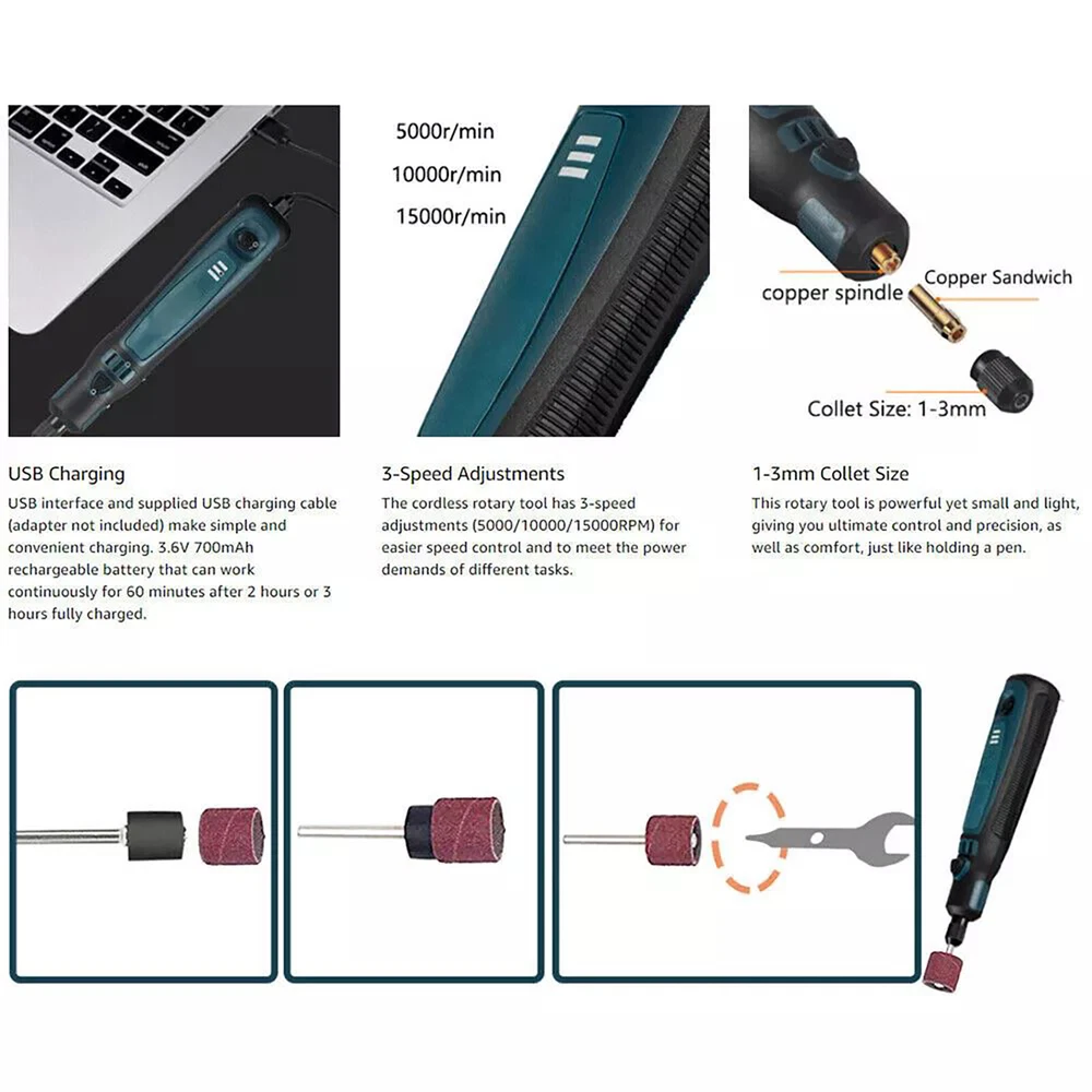 Product Description 15Pcs/Set Cordless Electric Mini Drill Grinder Engraving Pen Rotary Tool Kit Features: Multiple uses to meet different needs: Grinding, polishing, engraving, rust removal, drilling, cutting, etc. Three-speed power adjustment to meet different operating needs. Adjust to different gears according to the number of presses on the power switch. Three-dimensional efficient heat dissipation ensures stability and durability, no overheating. Pen design for easy grip, small body, big power. High-quality batteries, no worries about battery life. Specifications: Color: As pictures show Voltage: 3.6V 3-Speed: 5000r/min ,10000r/min,15000r/min Collet Size: 1-3mm Charging Port: USB Tool Weight: 0.10kg Battery capacity: 700mAh Charging time: 2-3h Package included: 1 × Cordless Rotary Tool 1 × USB Charging Cable 15 × Accessories (8 × Sanding ring, 5 × Abrasive head, 2 × Rubber wheel) If you have any questions, please feel free to contact us via ebay. We usually respond within 24 hours. Payment Shipping Returns Contact Us We accept all verified payments from ebay. Orders will be shipped after receiving cleared payment. Payment due within 7 days after auction ends and for buy it now listings. We ship most of our orders within 24 hours, and may up to 48 hours for. If you want faster shipping way. Please contact us before making payment. Sometimes due to problems with our transportation company system, your shipping information may be delayed to update. We recommend that you try again after 3-4 days. If you still haven't checked the shipping information, you can contact us by ebay message. Always believe we can figure things out with communication, if it comes to return, the pacakge must be intact and the same as you receive. If you have any questions, please feel free to email our service specialists 24 Hours a Day, 7 Days a Week. We will reply you ASAP. Return/refund is accepted within 30 days after the buyer receives the item. NO exchange will be accepted after 30 days from the date when the item is received. Please contact us first before returning your product!!! If you have any questions, our Customer Service staffs welcome you to email us. We strive to answer all questions and resolve any problems as quickly as possible. You can contact us 7*24, we will reply at the first time, and we will surely solve your problems. Note: 1.We try our best to reply to your emails as soon as possible, however, due to high volume of daily incoming emails and time zone difference, we may not be able to reply your emails immediately. Please allow 1 business days for us to response. If you do not receive any reply from us, please check your email ensuring your mailbox has not reached full size. 2.Due to some ISP SPAM filter settings, you may not be able to receive our replies; if you have problems receiving our emails, you may need to use a different email account to contact us. 3.Please give us the opportunity to resolve any problem. We understand the concerns and frustrations you might have, and will try our best to resolve the issues. Please email us before leaving any negative feedback or open any dispute on PayPal. 4.We care about our valued customers, and will always try to help you. So if you have any problems, please e-mail us immediately. Payment We accept all verified payments from ebay. Orders will be shipped after receiving cleared payment. Payment due within 7 days after auction ends and for buy it now listings. Shipping We ship most of our orders within 24 hours, and may up to 48 hours for. If you want faster shipping way. Please contact us before making payment. Sometimes due to problems with our transportation company system, your shipping information may be delayed to update. We recommend that you try again after 3-4 days. If you still haven't checked the shipping information, you can contact us by ebay message. Returns Always believe we can figure things out with communication, if it comes to return, the pacakge must be intact and the same as you receive. If you have any questions, please feel free to email our service specialists 24 Hours a Day, 7 Days a Week. We will reply you ASAP. Return/refund is accepted within 30 days after the buyer receives the item. NO exchange will be accepted after 30 days from the date when the item is received. Please contact us first before returning your product!!! Contact Us If you have any questions, our Customer Service staffs welcome you to email us. We strive to answer all questions and resolve any problems as quickly as possible. You can contact us 7*24, we will reply at the first time, and we will surely solve your problems. Note: 1.We try our best to reply to your emails as soon as possible, however, due to high volume of daily incoming emails and time zone difference, we may not be able to reply your emails immediately. Please allow 1 business days for us to response. If you do not receive any reply from us, please check your email ensuring your mailbox has not reached full size. 2.Due to some ISP SPAM filter settings, you may not be able to receive our replies; if you have problems receiving our emails, you may need to use a different email account to contact us. 3.Please give us the opportunity to resolve any problem. We understand the concerns and frustrations you might have, and will try our best to resolve the issues. Please email us before leaving any negative feedback or open any dispute on PayPal. 4.We care about our valued customers, and will always try to help you. So if you have any problems, please e-mail us immediately. powered by