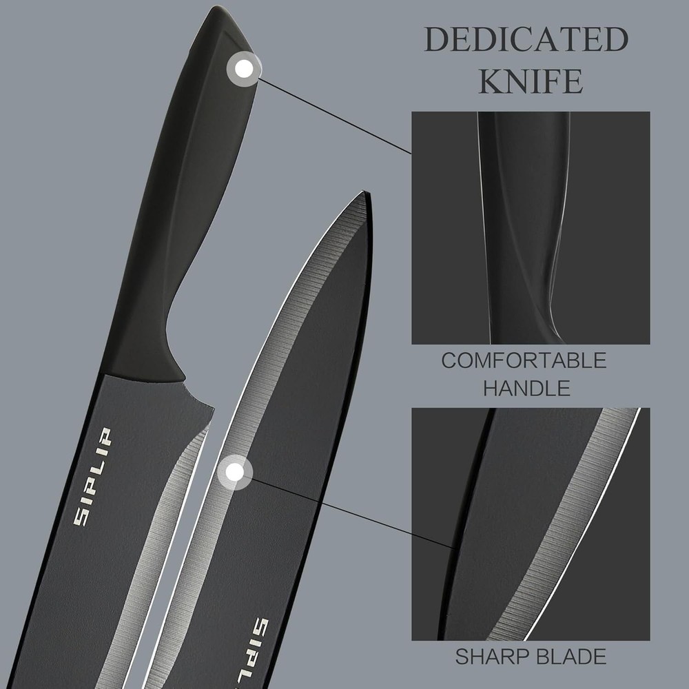 Product Description Kitchen knife set with Magnetic knife holder, 15 pieces high carbon stainless steel sharp kitchen knife set including chef's knife, bread knife, serrated steak knife set, knife sharpener 15 Piece Knife Set - Made of high carbon stainless steel 3CR14, super sharp, well balanced, non-stick, rust proof with long lasting quality. Includes: Magnetic knife holder, 8'' chef knife, 8'' bread knife, 8'' carving knife, 7'' santoku knife, 6 steak knives, 5'' utility knife, 3.5'' fruit knife, shears, knife sharpener. Quality Raw Material AND Sharp Blades - Made from High Carbon Stainless Steel 3CR14 is forged from one solid piece of steel,Processes the steel in a specific way to make sure it has a high hardness of 52°Rockwell. It makes each knife has extremely sharpness, rust-resistance, long-lasting edge, and excellent toughness. The edges of knives are carefully hand sharpened, maintaining the well-balance between achieving ultra thin slices and maximum resilience which is assist chop food. The Magnetic Knife Holder is a versatile holder that provides a safe, convenient and stylish way to store knives. It is double sided strong magnetic suction, no need to worry about falling off, stronger adsorption force allow largest knives to hang safely and securely, ultra sturdy and easy to clean up, providing an easy and effective way to store knives, while freeing up valuable countertop space, and it’s easy for you to see and reach all your different knives when you cook. Kitchen knives set has a unique outlook compared with the other ordinary knives set. Two styles to choose from, one is pure black exquisite and understated, the other one is plating gorgeous and cool, it looks more sophisticated and stylish. Ergonomically designed stainless steel handle provides comfort, don't have to worry about handles falling off. It also prevents blunt and rust effectively. It provides a strong grip to perform delicate work and helps reduce hand fatigue. Beautiful Packaging AND GREAT Service - Each knife is backed by superior quality assurance and can be purchased with confidence. The knife set comes with a beautifully packaged, and it can be a gift for parents, wives, husbands, friends and family. It can be a gift for wedding, birthday, housewarming, thanksgiving, Halloween. Please inform us if you have any questions about our products, which is convenient to us providing better services for you. About Us We are a reputable seller with many years of experience selling on eBay. Our goal is to provide high-quality products and excellent customer service. Shipping Items will be shipped within 1-3 business days when we received payment. (Orders are not processed on weekends & holidays) Tracking information will be sent once item is shipped. Delivery time depends on destination and other factors Item is shipped to ebay address. Leaving correct address can minimize delay. For international shipping and shipping to Guam, Hawaii and Alaska, Please contact us before placing the order. International buyers please note: Import duties, taxes and charges are not included in the item price or shipping charges. These charges are buyer’s responsibility. We will try our best to reduce the risk of the custom duties. Local pick-up is unavailable at the moment. Contact Us We reply any email messages within 1 business / working days(off-duty at weekend). If you do not get a response from us, then please check your junk or spam mailbox. Our Business hours: Mon-Fri 9:00-18:00, UTC/GMT +8 hours. Please contact us either by clicking "contact seller" in the "purchase history" section or simply click "ask a question" at the bottom of this page. If you are unsatisfied with our item or service, please contact us before leaving any feedback. We are committed to resolve all issues in a friendly and satisfactory manner.