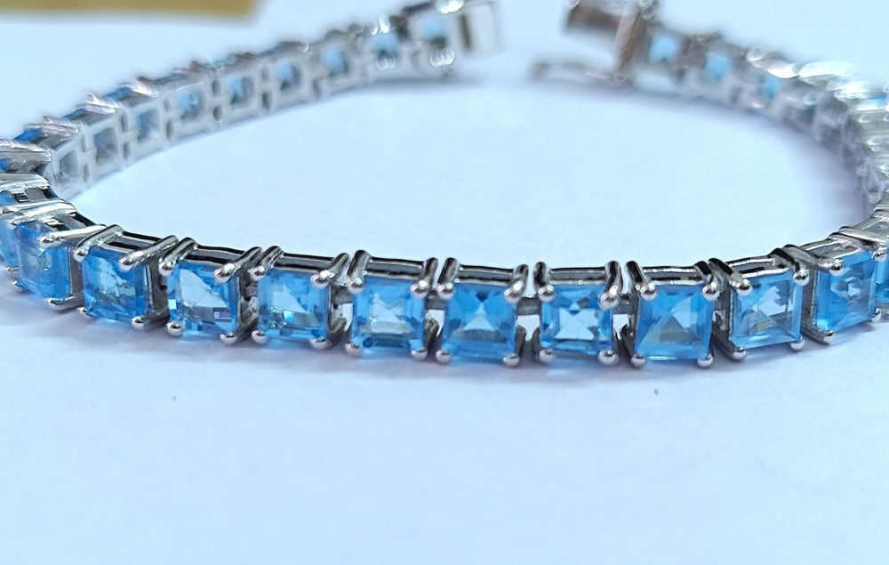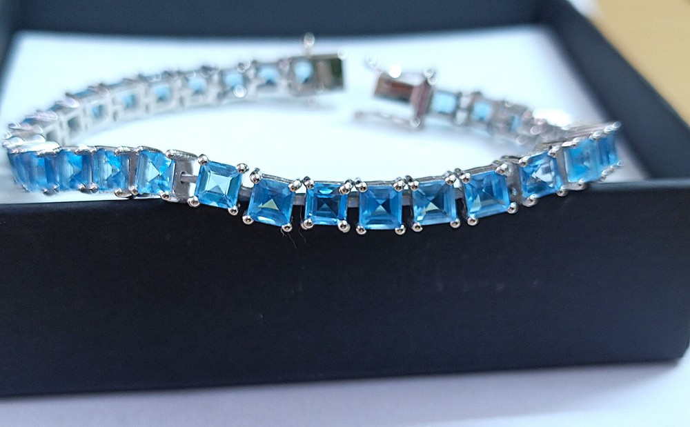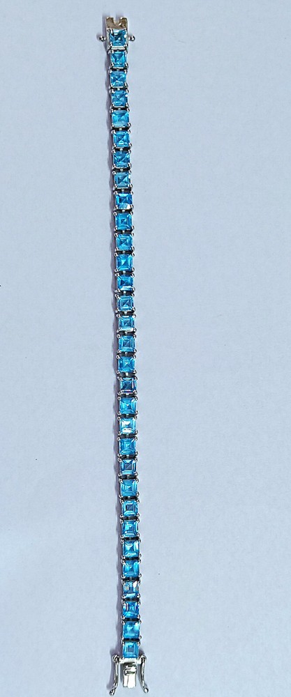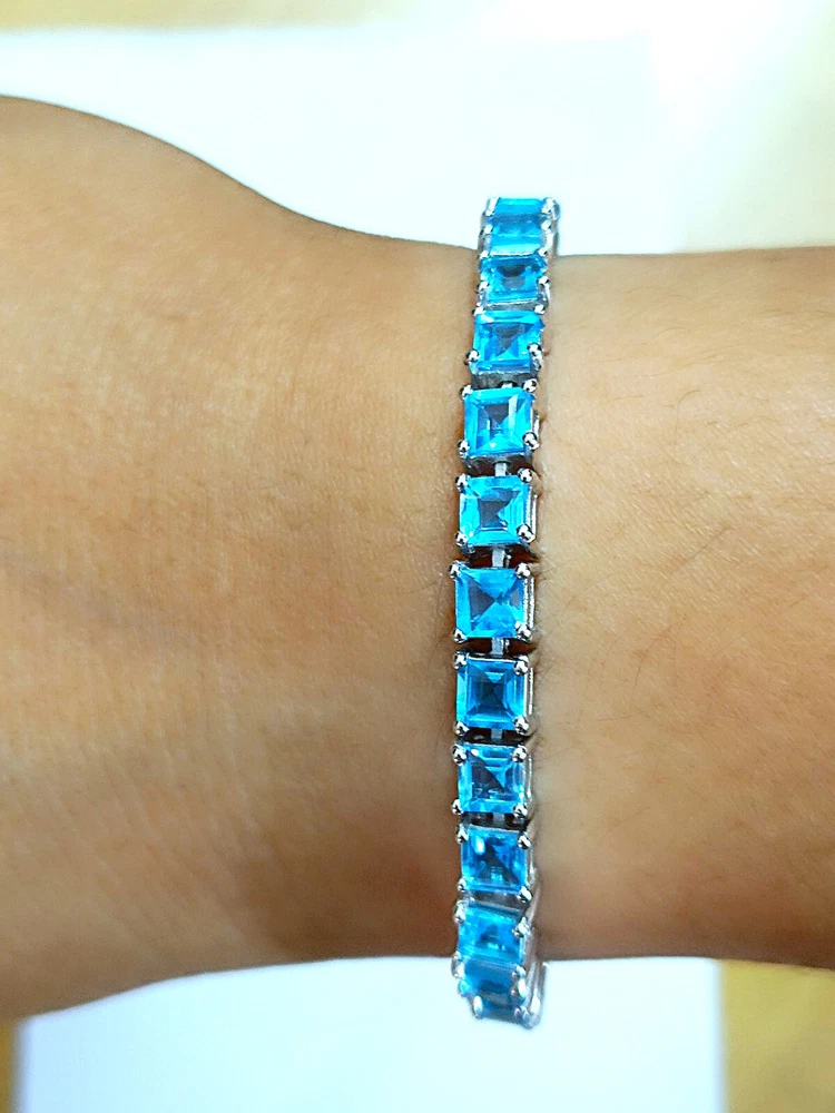 Square Natural Switch blue topaz. women's Tennis Bracelet in Sterling silver, November , birthstone Bracelet, Party wear Bracelet, Finance gift Bracelet, Gemstone Bracelet, Tennis Bracelet. ==================================== PRODUCT DETAILS Product Type - Bracelet Bracelet type - Tennis Bracelet Gemstone setting - Natural Switch blue topaz Natural Switch blue topaz shape - Square Natural Switch blue topaz . size - 4mm Natural Switch blue topaz color - Sky Blue Setting type - Prong ==================================== Benefits of Switch Blue Topaz stone: Wearing blue topaz can also boost self-assurance and courage, especially in speaking situations. As the stone of communication, it helps overcome public speaking phobias and fosters balance and self-control. It promotes healing of the soul, instills a sense of worthiness, and reduces self-doubt, reminding individuals that their voice deserves to be heard. Blue topaz is often associated with writers for its ability to strengthen willpower and focus, providing clarity and aiding in effective communication. It helps clear the mind, make better decisions, and improve communication abilities overall. This gemstone is known to calm the mind, heal the body, and soothe the soul, contributing to overall well-being. The potent energy of blue topaz is linked to the throat chakra. Wearing Blue Topaz Jewelry activates the throat chakra, removing blockages and allowing for clear expression of desires and goals. This activation helps set appropriate boundaries, provides strength, and reinforces the value of one's words. Unblock throat chakra can foster closer connections with loved ones and oneself, alleviating feelings of being unheard or unworthy. =========================== Shipping Policy :---- • Shipping Thru FedEx, DHL Express, USPS & Other Courier Services. • We ship item(s) from India to Worldwide . • We also use USP Which take 4-5 days for delivery with 100 % insured and online tracking . • We provide you each item with individually packed secured with quality products to help ensure safety and undamaged delivery =================================== Regards by RG jewels