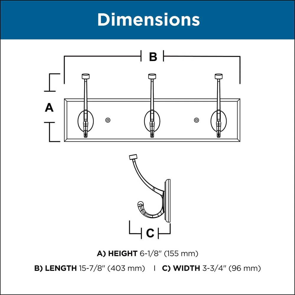 This 15 inch decorative rail features 3 handsome hooks in nickel against a clean, bright white backing. Hook rails pack a lot of storage in a wall-mounted solution that adds to your home’s ambiance. The classic rail coordinates with many home decors and keeps things tidy in your foyer, bedrooms, or bathrooms. CLEAR CLUTTER: Access everything you need, smartly organized with this attractive wall coat rack DIMENSIONS: Coat hook rack measures 6.09"H x 15.85"L x 3.68"D FINISH: Bright white rack with warm gray nickel hooks BUILT TO LAST: Strong fiberboard coat rack with durable metal hooks COORDINATE: This classic design adds sophisticated elegance to your room decor STURDY: Rail weight capacity is 35 lbs. when mounted properly : Feel secure in your purchase with our Limited INSTALL: Includes mounting hardware and installation instructions for accurate mounting the first time