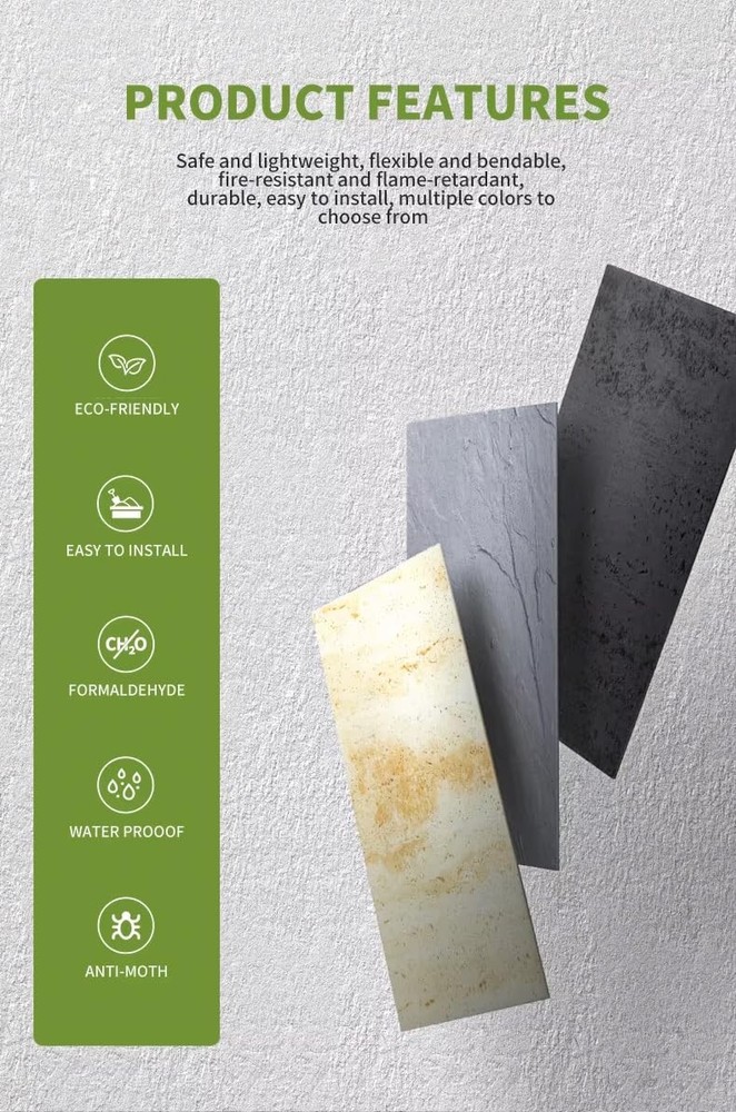 soft stone wall panels are an innovative wall covering, guaranteed to add instant warmth and interest to any feature wall. these flexible soft stone wall panels are waterproof making them perfect for both indoor and outdoor applications ensuring durability and longevity in any environment, designed for a modern aesthetic. these stone panels add a sleek and stylish look to any space blending seamlessly with contemporary interior and exterior designs, benefit from our online technical support and a 30 years warranty ensuring that any installation or maintenance questions are promptly addressed for your peace of mind. 【Materials】Made from clay mineral powder and fiber with a matte texture finish. It can hold up to moisture, sunlight and washing. waterproof and heat resistant in climates ranging from -37 deg C up to 80 deg C. 【Specification】Available in 4 colors for options, each wall panel is 22.64in(L)*11.22in(W)*0.10in(T),there are 15 pieces per box with coverage of 26.46 square feet. 【Installation】Due to its lightweight and flexibility, it is relatively easy to install, It can be cut according to needs and is suitable for walls of different sizes and shapes to provide more flexible design solutions. 【Feature】It can mimic the appearance of natural stone to add a stylish and authentic touch to any space.it is suitable for different indoor and outdoor spaces, such as living room, bedroom, kitchen area space feature walls, company logo wall, conference room, lobby backdrop, reception desk front function space in the workplace, dining establishment, cafes, cinema, and club design. 【Application】Suitable for both of indoor and outdoor use, its flexibility and softness allows it to adhere to curved and round surface to enhance the overall design possibilities.