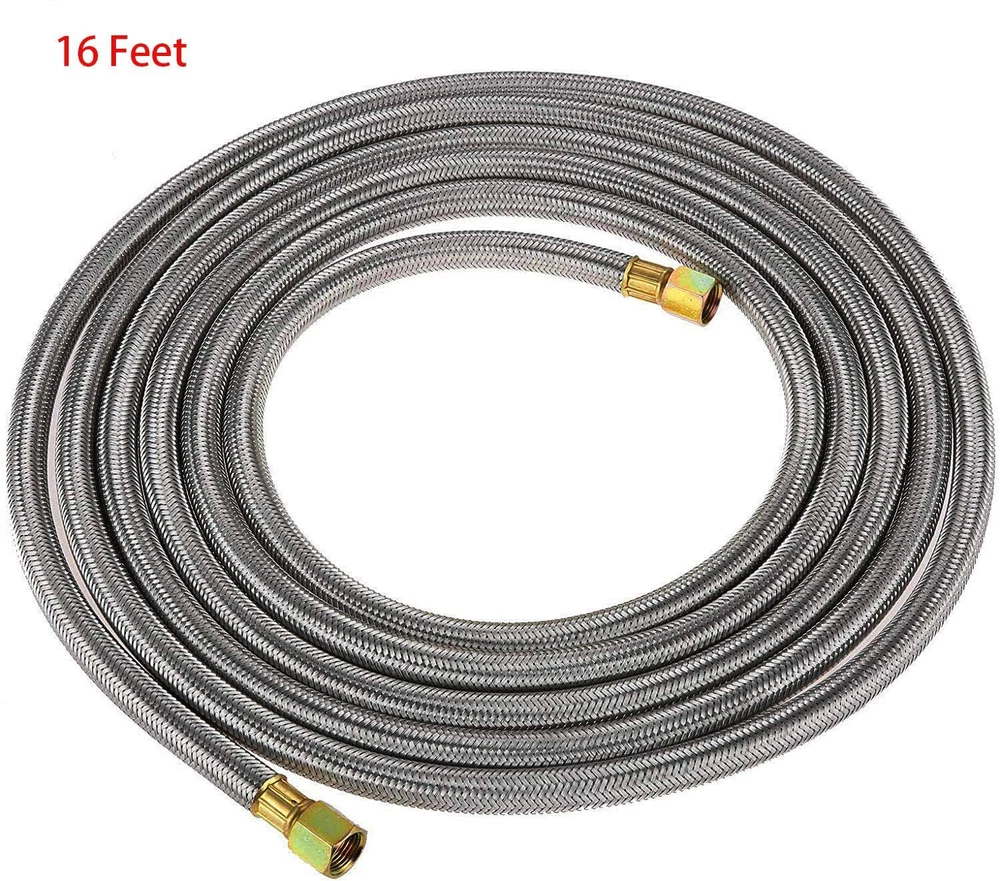 This Extension Hose with Stainless steel braided more durable and flexible for any RV grill, fire pit, heaters, torch extension using Specifications: 16Feet Long, Extension Stainless Steel Propane Hose 350PSI Rated More Durable with Coating Stainless Steel. Fittings: Both Ends with 3/8" Female Flare Connector (Thread standard is 5/8"-18UNF Female Swivel Fittings) Easy to Used for BBQ Grill, Fireplaces & Other Gas Appliance Extension Using and Propane Torch and Other High Pressure Gas Application. Not Suitable for Water. Kits Include: 1 of 16 FT Hose, 1 of 1/2" Npt Male to 3/8" Male Flare Fitting Adapter, 1x of Npt Female to 3/8" Male Flare Fitting Adapter, Burst Pressure of Hose: 37Mpa. And Leaking Test Passed.
