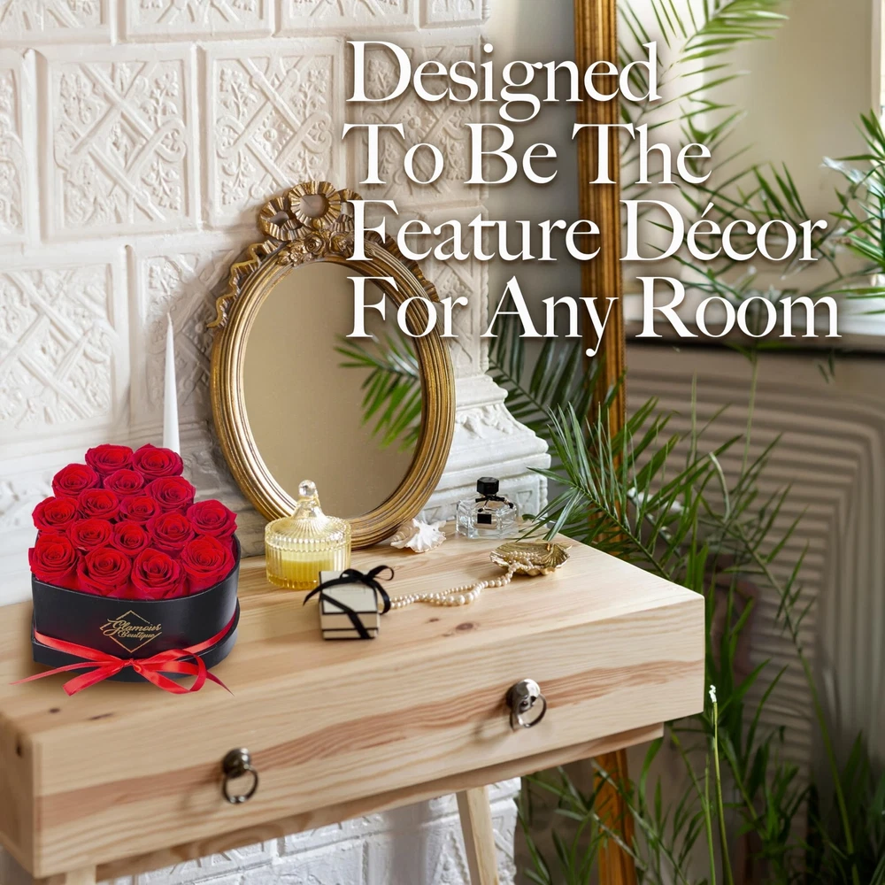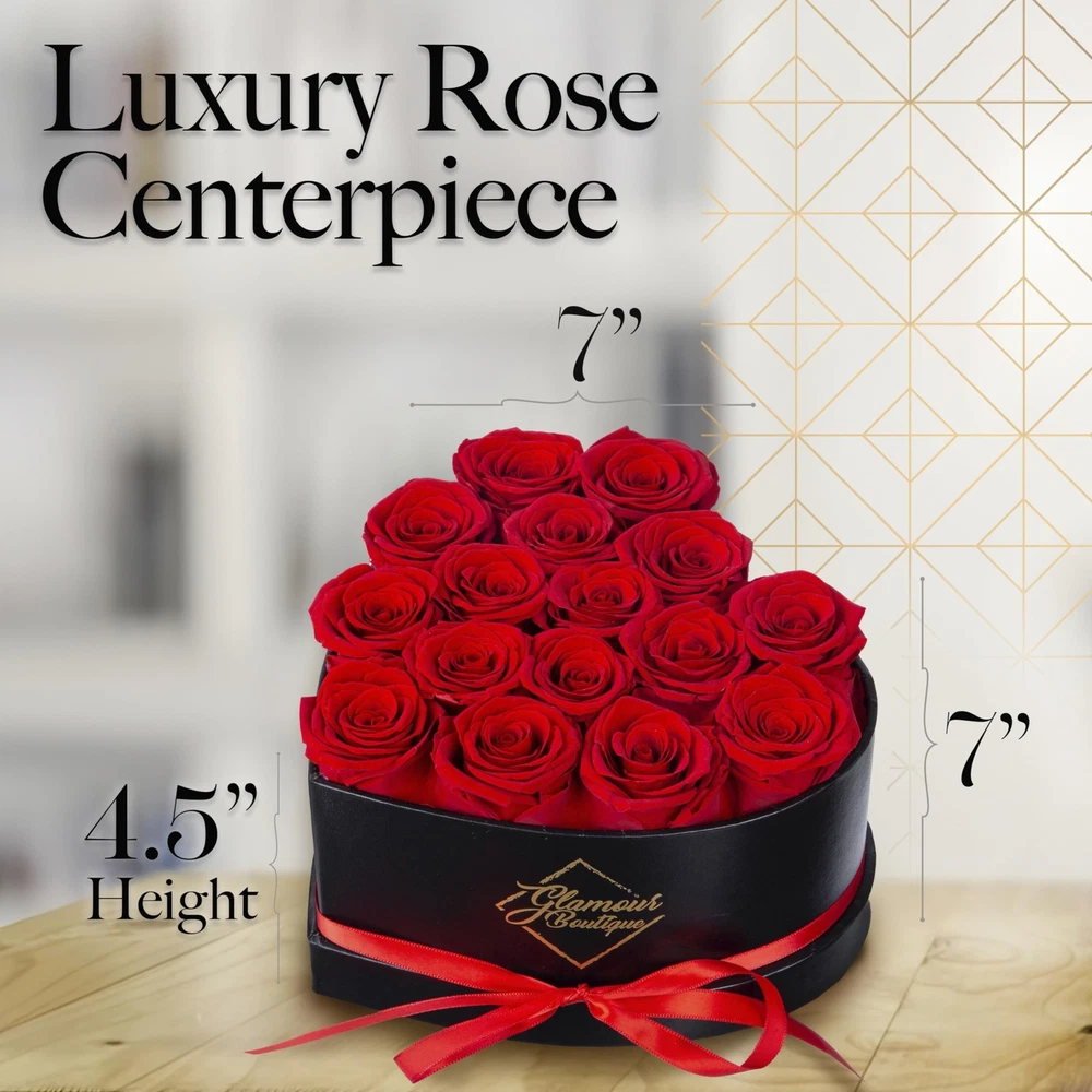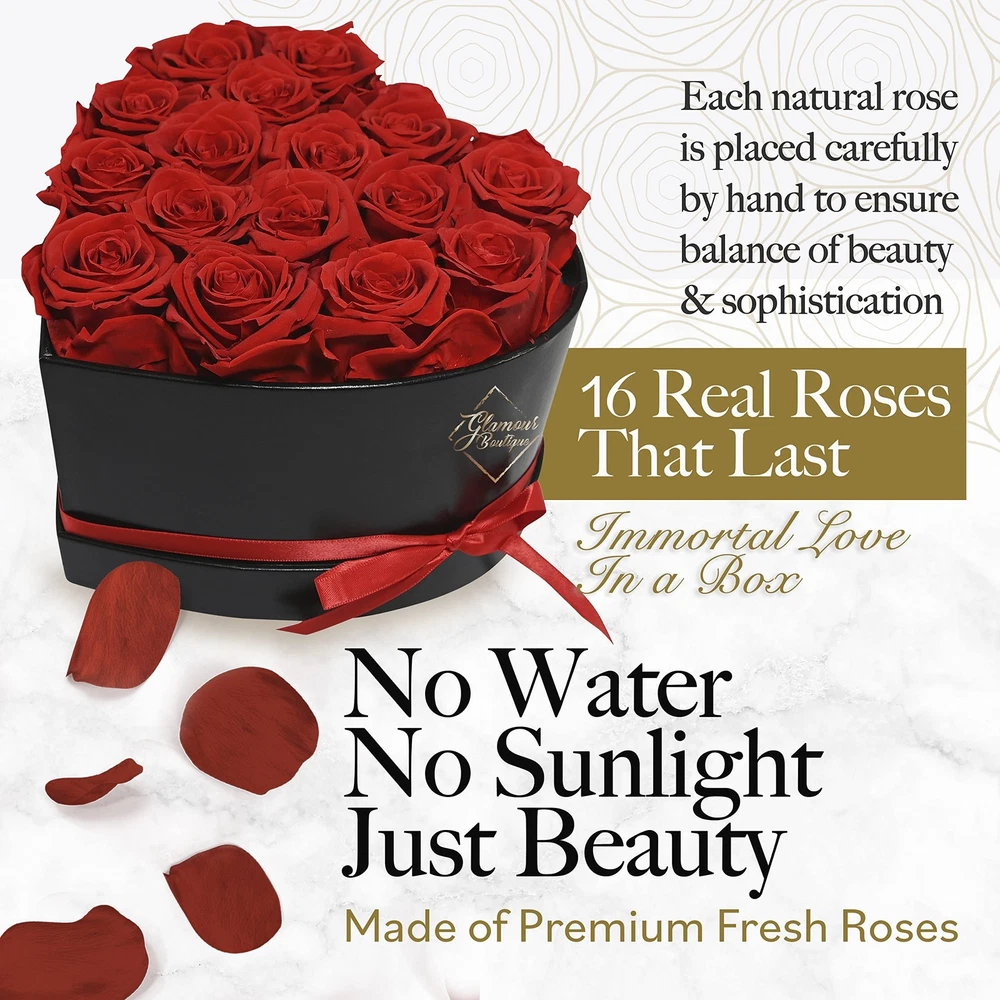 16 Flower Forever Heart Shape Box - Preserved Roses, Immortal Roses Gift for Her Rose Eternal Preserved Flowers for Mothers Day Women Valentines Day Gifts for Wife - Red Product Details Size: 16 Roses Color: Red 16 Roses Brand: GLAMOUR BOUTIQUE MPN: 16REDHeart UPC: 719417522240 EAN: 0719417522240 Product Dimensions: 7 x 7 x 4.5 inches Item Weight: 1.28 pounds Manufacturer: GLAMOUR BOUTIQUE Item model number: 16REDHeart Batteries required: No Timeless Elegance in Every Box - Encased in a beautifully crafted heart-shaped box, our preserved flowers are meticulously arranged to create a stunning display of eternal beauty and love. Crafted to Last for Years - Made from real roses using a premium preservation process, these preserved roses bouquet retain its natural charm for up to 3 years. Easy Maintenance - No water, sunlight, or upkeep required! These roses forever birthday gifts for women maintain their vibrancy and elegance, making it an excellent long-lasting gift or centerpiece. Versatile Colors & Arrangements - Choose from a variety of roses in a box sizes (7, 16, 27, or 50 roses) and elegant colors like Red, Blue, Pink, Tiffany, and more to suit any occasion or indoor style. An Exceptional Gift Idea - Delight your loved ones with GLAMOUR BOUTIQUE roses, a luxurious symbol of everlasting love. Ideal flowers roses forever in a box for Valentine's Day, Mother's Day, weddings, anniversaries, birthdays, or as home decor.