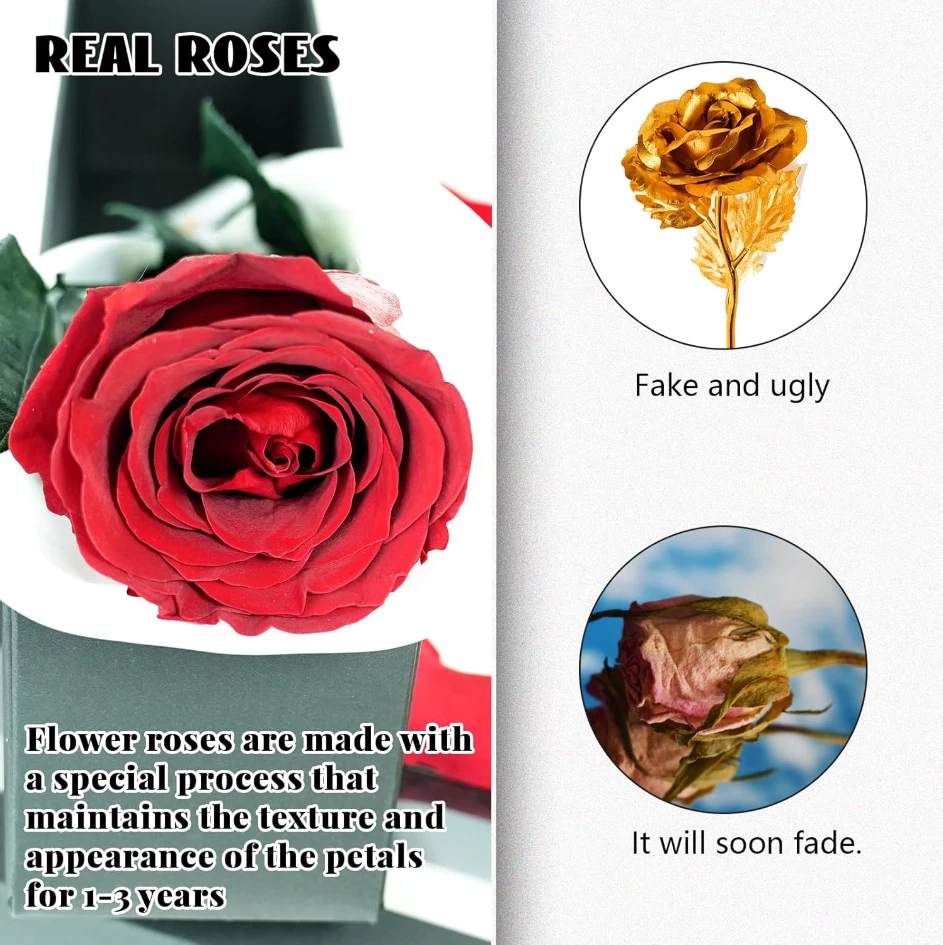 Authentic Forever Flowers: Our preserved roses are real and natural, ingeniously preserved to stay fresh and beautiful, offering you the symbol of eternal love. Anniversary Gifts for Women: An excellent gift choice for any special lady in your life. Ideal for anniversaries, birthdays, Valentine's Day, or just to say, "I love you. Forever Roses in a Box: The roses are beautifully present ed in a deluxe box, making it a memorable and sophisticated gift for any occasion. Preserved Flowers: Our expert preservation process ensures that our roses maintain their stunning appearance much longer than regular flowers – a gift that truly keeps on giving. All Occasions Covered: Whether you’re celebrating an anniversary, birthday, or expressing love and sympathy, these preserved roses are the perfect touch.