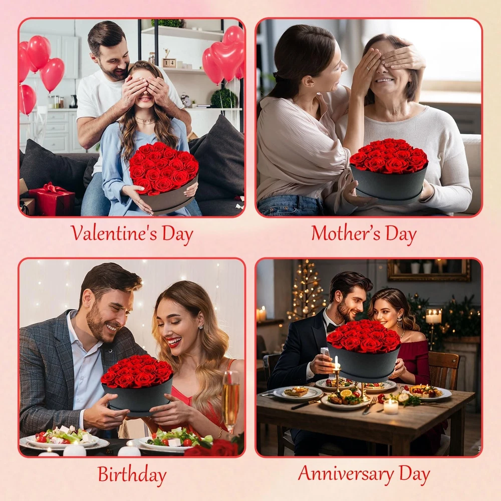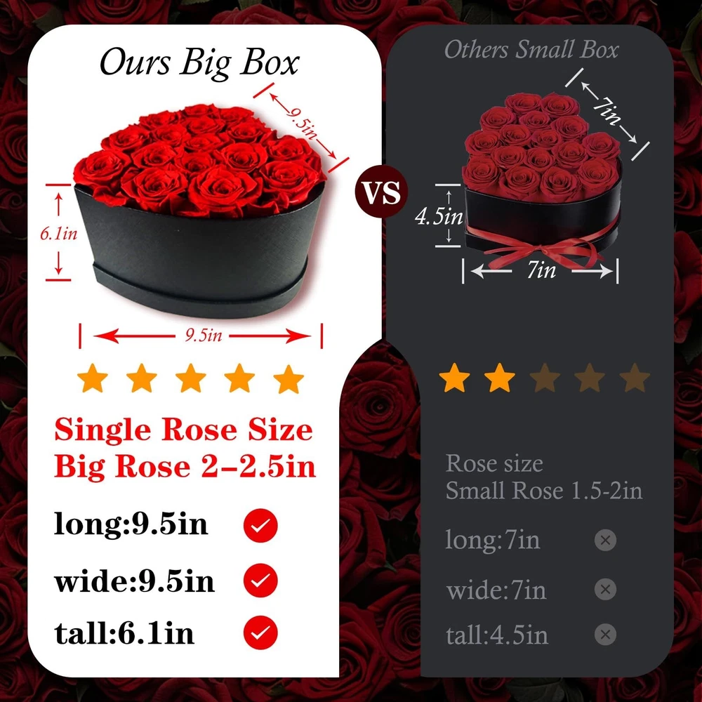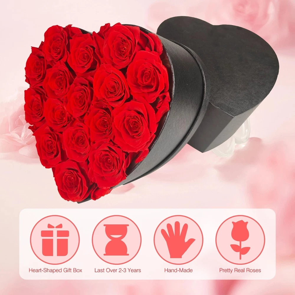 16 Forever Flowers, Preserved Rose in 9.5 inch Heart Shape Box, Birthday Gifts for Women, Wife, Mom, Prime Eternal Roses Gifts for Valentines Day, Mothers Day, Anniversary, Graduation, Wedding Product Details Package Dimensions: 9.72 x 9.57 x 6.42 inches Item Weight: 2.09 pounds Manufacturer: TuuToo Country of Origin: China Item model number: BBT-A01 Batteries required: No GRADE A QUALITY LARGE SIZE ROSES : Each rose in our Forever Flowers Gift Box is carefully selected and made from high-quality fresh roses. Each flower measures 2-2.5in size and is composed of 16 roses. The large-sized flower shape represents high-quality floral material. BIG-SIZED GIFT HEART SHAPE BOX:Due to the large size of the roses, we have chosen a large-sized gift box. The unique and exquisite heart-shaped gift box measures 9.4 * 9.4 * 6.6 inches, and the recipient will be filled with huge surprise and happiness. LONG AND LASTING: Preserved Flower is made from real fresh roses. It has the dual characteristics of long-term storage of fake flowers and non-toxic, harmless, and bright natural flowers. It preserves the internal tissues, moisture, and texture of the flowers and can be stored for 3-5 years without withering. METICULOUSLY HANDMADE:Every step of the craftsmanship of Eternal Flower relies on manual labor, and every heart-shaped gift box requires a lot of time and careful arrangement by floral designers. This is a thoughtful gift, a gift full of love. DELICATE AND ROMANTIC GIFT: Rose is a noble and beautiful flower, and the eternal flower represents this eternal love, lasting beauty. It is the best choice to gifts for women, mother, wife, partner, and is also a gift for Mother's Day, Valentine's Day, Christmas, birthdays, and more.