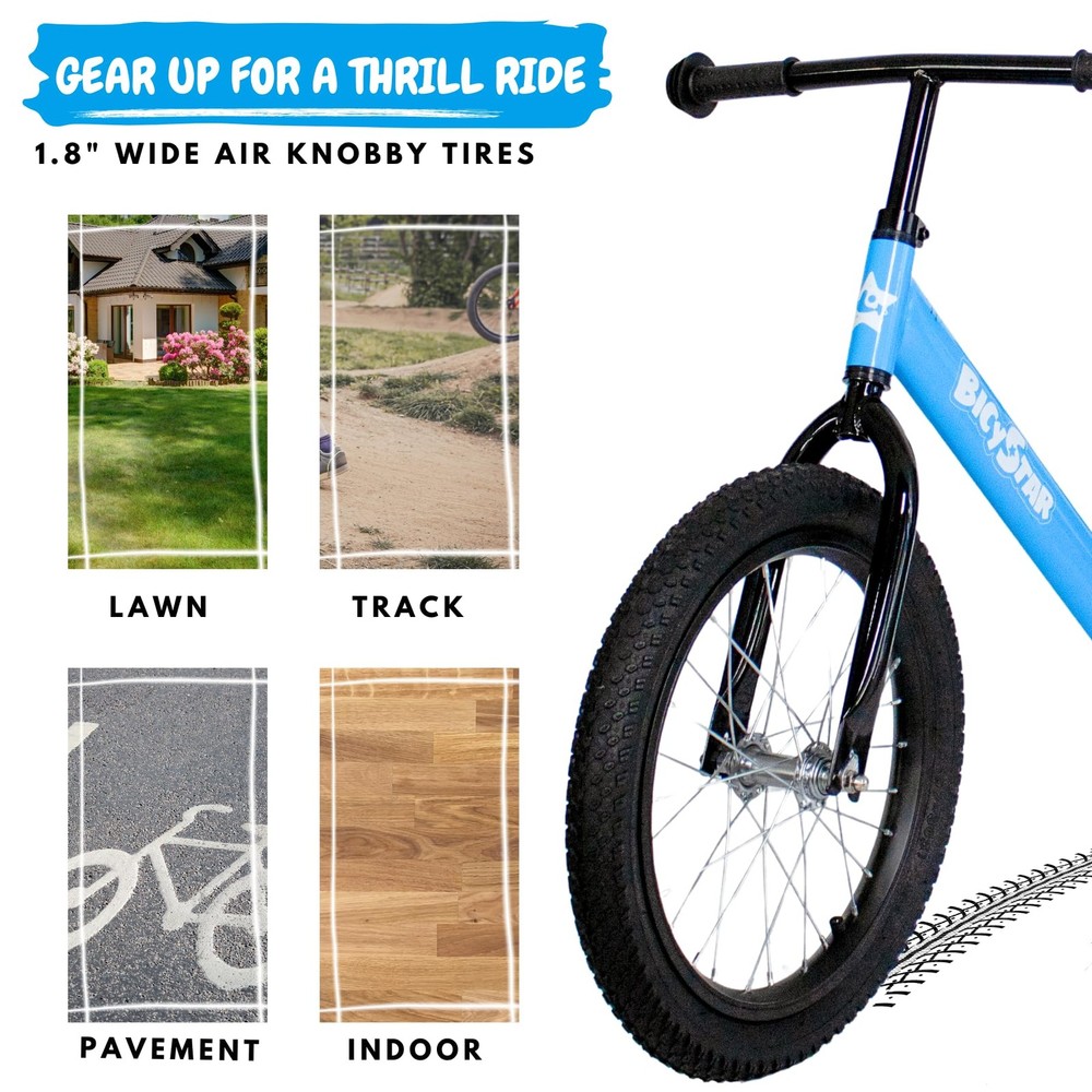 Introducing our 16-inch Balance Bike, a thrilling ensemble of innovation, comfort, and adrenaline-infused experience. Like a well-choreographed dance of form and function, our balance bike is the answer to your child's quest for the perfect biking adventure! ADJUSTABLE EXCELLENCE - Customizability rules the roost with an adjustable seat height of 17-24 inches and handlebar height at 25-28 inches. Geared for 5-9 years old riders, our childrens Balance Bike promises a riding experience as unique as your child, time after time. SUPER-TREAD TIRES - Ride with confidence as the 1.8-inch wide air knobby tires conquer all terrains in style. No track is out of bounds as they invite more speed, stability, cushioning, and better traction. < EASE OF BALANCE - Lightweight brilliance at 10.8lb ensures the balance bike is easily portable. The lighter build promises a perfectly balanced ride, every time. LARGER AND MORE COMFORTABLE - The larger frame design is engineered to smoothen transition from a pedalless balance training bike to a pedal bike, especially for the initially timid bikers. Imagine your little biker exploring the neighborhood, mastering the art of balance on this sleek ride. Their grin widening with each ride, their joy resonating with each flight taken on that bunny hop, that's the story of our 16 inch Balance Bike. Built to hone their biking skills while erupting laughter and promoting growth, our Balance Bike is shaping new biking narratives daily. A smooth ride, comfortable enough to ease hesitant hearts into biking, yet thrilling enough to keep them pining for more. Assembly is a breeze, letting fun times roll sooner. Get ready, set, and vroooom! GAME OF GROWTH - Our toddler bike isn’t just fun, it’s also a medium to enhance their motor skills, self-confidence, and independence. Empower your child with balance and coordination. Our toddler balance bike is your child’s first step towards biking independence and designed for nothing less than extraordinary adventures for your little one. PERSONALIZED CHILD FIT - With height adjustability that spans from 17 to 24 inches (seat) and 25 to 28 inches (handlebar), suitable for kids aged 5-9 years old, it stands proudly as a loyal buddy through your child's growth spurts. The quick-release makes real-time adjustments a cinch. Our kids balance bike adapts instantly to your child's ever-changing needs. THE FANTASIA OF BALANCE - Bike light. Bike right. With lightweight(10.8lb), low stand-over height, ideal for future tricksters, balancing becomes less of learning and more of laughter. ORDER NOW to gift your child the joys of uncomplicated fun. EXPEDITION WITHOUT BOUNDARIES - Gear up for an adrenaline-pumping thrill ride with our 1.8-inch wide air knobby tires. Offering superior stability and traction, this balance bike 4+ year old is destined to turn every terrain into a thrilling quest. So go ahead, take the fun off-roads too! A bike that tolerates, supports, and partners all the bumps, the thrills, the growth spurts. ASSEMBLY IS AS EASY AS A RIDE - Receive your balance bike nearly ready to fly! Just assemble the fork, insert the handlebar and seat-post and watch your child soar! Our no pedals bike is the quickest ticket to independence and endless fun!