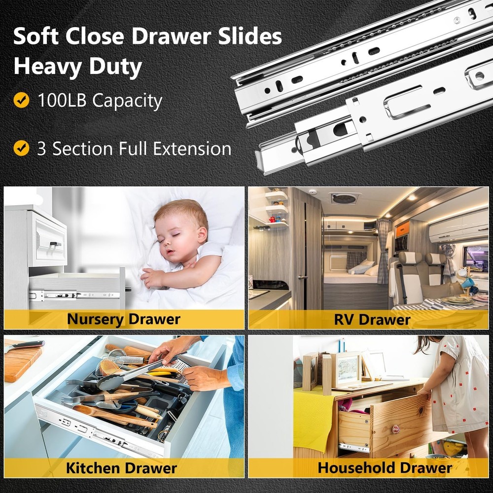 16 inch Ball Bearing Drawer Slides 6 Pairs (12pcs) - 100LB Capacity, Full Extension Side Mount Slides for Kitchen Cabinets, Wardrobes, Office Furniture (Silver 16inch) Product Details Color: Silver Size: 16inch-400mm Brand: SBUUBKI MPN: Drawer Slides UPC: Does not apply EAN: Does not apply Color: Silver Material: Alloy Steel Brand: SBUUBKI Product Dimensions: 16"L x 1.77"W x 0.47"Th Mounting Type: Side Mount Drawer Type: 3 fold full extension Manufacturer: SBUUBKI Number of Items: 12 Part Number: Drawer Slides Item Weight: 12.84 pounds Product Dimensions: 16 x 1.77 x 0.47 inches Country of Origin: China Item model number: Drawer Slides Size: 16inch-400mm Item Package Quantity: 6 Included Components: 6pairs-12pcs Drawer Slides, 12pcs screws Batteries Included?: No Batteries Required?: No Date First Available: September 5, 2024 [Drawer Slides]: With 6 pairs 12pieces included and each drawer slides match with 12pcs screws, this offers ample supply for multiple drawer installations or replacements. [Guide for Choosing Size of Drawer Slides]:Side installation.To determine which size of slides are good for your drawer, please measure the length of the drawer without the frame board. And if the length is not even, please choose 1 inch shorter. The length of slides can't be longer than the cabinet case depth. Face frame cabinets will require a rear mounting bracket, whereas for faceless cabinets the slides are mounted directly on the side. Ball Bearing Mechanism: Two sets of solid steel balls are used inside the ball bearing drawer slide rail to ensure smooth and quiet performance that offer less noise at closing the slide operate smooth and silent No more slamming drawer Full Extension: 3-Fold full extension Detachable Drawer Slides Designed for maximum accessibility, these slides allow drawers to be pulled out completely, providing unobstructed access to contents. [High-Grade Material]:All of the drawer slides which made by made from high-grade cold rolled steel, and the material is one times the thickness of ordinary slides. The surface of the drawer slide rail adopts electrophoresis process, which isolates the direct contact between water and air, prevents the slide rail from oxidizing and rusting, and improves corrosion resistance. [Application range]: SBUUBKI drawer slides are available in 10inch, 12inch,14inch,16inch,18inch,20inch,22inch.Various choices for drawers in your kitchen,bathroom,bedroom,office with different depth.It also can apply to ,keyboard drawers,wardrobe drawers,wooden or steel drawer,cabinet drawers,toolbox drawers that with demand for big load-bearing capacity.