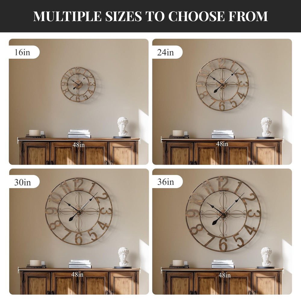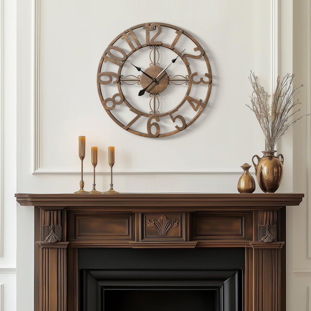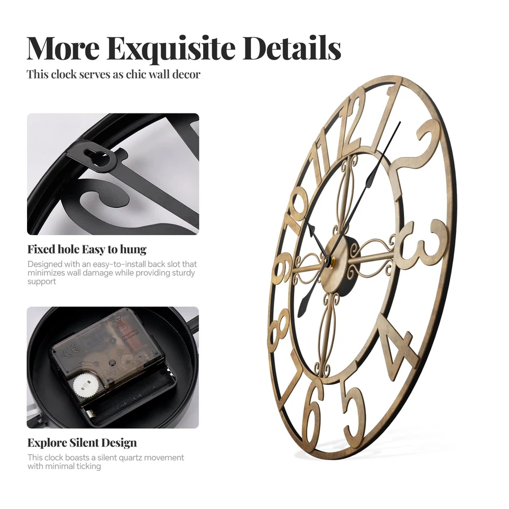Wall Clock, 16 Inch Metal Bronze Wall Clock for Living Room Kitchen Mantel, Completely Silent Non Ticking Battery-Operated Round Rustic Modern Wall Clock - Arabic Number Bronze Large Wall Clock: This 16-inch retro-style clock features a hollowed-out design crafted from high-quality metal, combining vintage charm with durability. Whisper-Quiet Performance: Powered by a single AA battery (not included), the clock’s silent quartz movement ensures a peaceful environment without distracting ticking sounds. Easy-to-Read Design: Bold Arabic numerals ensure clear visibility, making this metal wall clock a stylish and practical choice for any home or a thoughtful gift for special occasions. Versatile Wall Décor: Perfect for any space, this versatile clock enhances living rooms, offices, bedrooms, kitchens, mantels, classrooms, or public areas with its chic and timeless appeal. Hassle-Free Installation: Equipped with a convenient back slot for easy hanging, it minimizes wall damage while providing reliable and secure support.