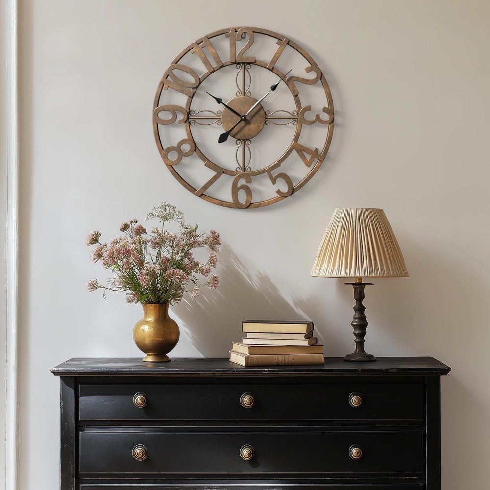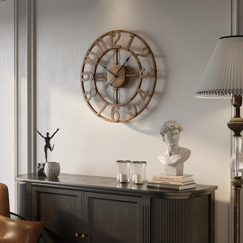 Love this stylish bronze wall clock—it adds a rustic-modern touch to any room! The silent movement is perfect for bedrooms or offices, and the large Arabic numbers make it super easy to read. The hollowed metal design gives it a vintage yet durable feel. Super easy to hang, and the battery operation is hassle-free. A great blend of form and function!