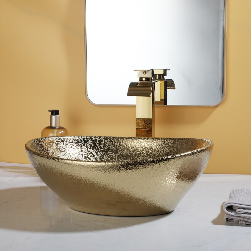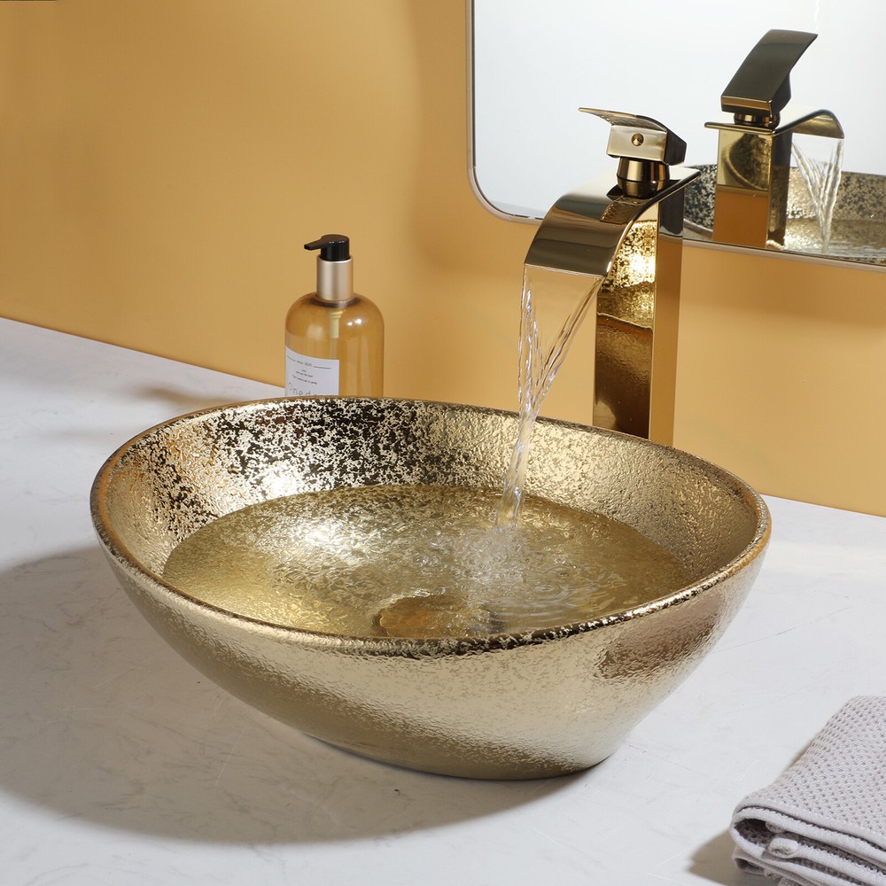 Finish: Gold Brand: sazh Material: Ceramic Basin MPN: Does Not Apply Item Length: 16.2 inch Room: Bathroom Number of Faucet Holes: 1 Hole Features: Heat Resistant Color: Gold Item Height: 5.2 inch Mounting: Freestanding Shape: Oval Type: Basin Style: Contemporary UPC: Does not apply Items Included: Basin Waste, Tap gtin13: Does not apply Country/Region of Manufacture: China Item Width: 13.4 inch