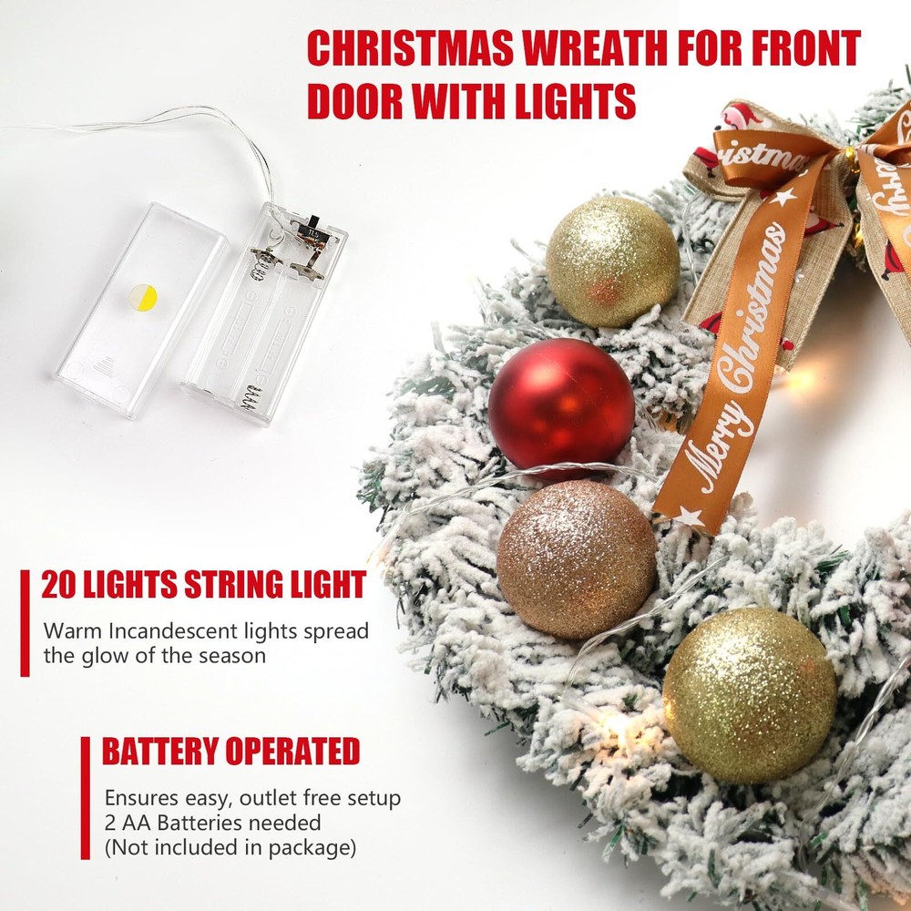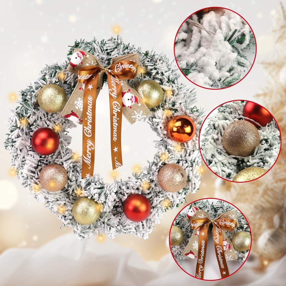 16 Inch Lighted Christmas Wreath with Metal Hanger, Christmas Wreath with Balls Ornaments Bowknot for Front Door, Battery Operated 20 LED Lights, for Front Door Gate Wall Xmas Party Decorations Christmas Wreath for Front Door: Green pine needles covered in snowflakes, with golden, red, and orange Christmas balls Ornaments and a golden bowknot. This stunning wreath is the perfect touch to enhance the festive atmosphere of your Christmas party decorations. High-Quality Christmas Wreath: Our Christmas wreath is made of high-quality materials. Good workmanship, this light-up Christmas wreath is sturdy and can be used for a long time. We offer the 15" metal hanger made from high quality steel, the surface treatment is very smooth and clean. It is durable, not easy to bend, will not damage the door and door frame, please rest assured to use. Battery Operated Wreath: This Christmas wreath come with 20 led lights light string, powered by 2 AA batteries (not included). Just place them anywhere without the worry of needing a plug socket nearby, adding a charming and festive glow to illuminate your home. Ideal Christmas Decoration: This versatile Christmas wreath is perfect for both indoor and outdoor settings. Perfect for front doors, staircases, balconies, offices, bedrooms, Christmas parties, walls, fireplaces, gardens, terraces, and swing stands, adding a festive touch to every corner of your home. Perfect Size: The Wreath is 16 inch dia. After opening the packaging, the branches can be adjusted to expand the wreath and get the perfect shape. 16 inch Lighted Christmas Wreath with 20 Led Lights Christmas Wreaths for Home Decor This Christmas wreath for front door has a 16 inch size We offer the 15" metal hanger for your convenience. LED lights need 2 AA Batteries, but batteries are not included in the package. The wreath can be used indoors or outdoors. To prolong the life of the wreath, it is best to be hung under a covered location. Christmas Theme Design: Made of high quality materials. Balls Ornaments on the Christmas door wreath, this unique design will make your front door outstanding. Package Includes: 1 x 16'' Christmas Wreath 1 x 20 Led Lights Lamp string 1 x 15" metal hanger Notes: Manual measurement, please allow slight errors on size. The color may exist a slight difference due to different screen displays. SHIPPING Domestic Buyers - We have confidence in our products, but if you are not fully satisfied please contact us within 30 days of purchase and you will get full refund. - We ship within 3 business days of payment, usually sooner - We offer FREE shipping on all orders! - We only ship to the lower 48 states, no APO/FPO addresses or PO Boxes allowed International buyers – please note: Import duties, taxes, and charges aren't included in the item price or postage cost. These charges are the buyer's responsibility. - Please check with your country's customs office to determine what these additional costs will be prior to bidding or buying. * Order Cancellation Policy ** You can return a product for up to 30 days from the date you purchased it. 1. The seller reserves the right to cancel the special case only due to eBay cancellation fee. 2. The decision of seller is the final. 3. The seller will respond to the cancellation request within 2 business days. Please wait for the result of cancellation. 4. In case the cancellation is not completed by some reasons, the buyer can follow the options below to get the refund. 4.1 The buyer can reject the item when it arrives. 4.2 The buyer can send the item back to the seller within 30 days If the buyer receives item (USA Shipment ONLY). The seller will provide the FREE return label to the buyer when the buyer opens " Return Item" case on eBay by using the reason as "Change my mind" ONLY. 5. When buyer has placed the order. The order will be processed and completed by automatic warehouse system within 5 minutes. In case that buyer sends the cancellation request after 5 minutes of placing the order, the request will be rejected. **Sending direct message to cancel the order is not allowed for every case.* Return Policy For the return case - If buyer would like to return the items for refund or replacement, please CONTACT SELLER to receive the free return label from seller. The refund or replacement will be processed with the tracking number of return label which is provided by seller only. The other ways of return which are not approved by seller will not be processed for the refund or replacement.