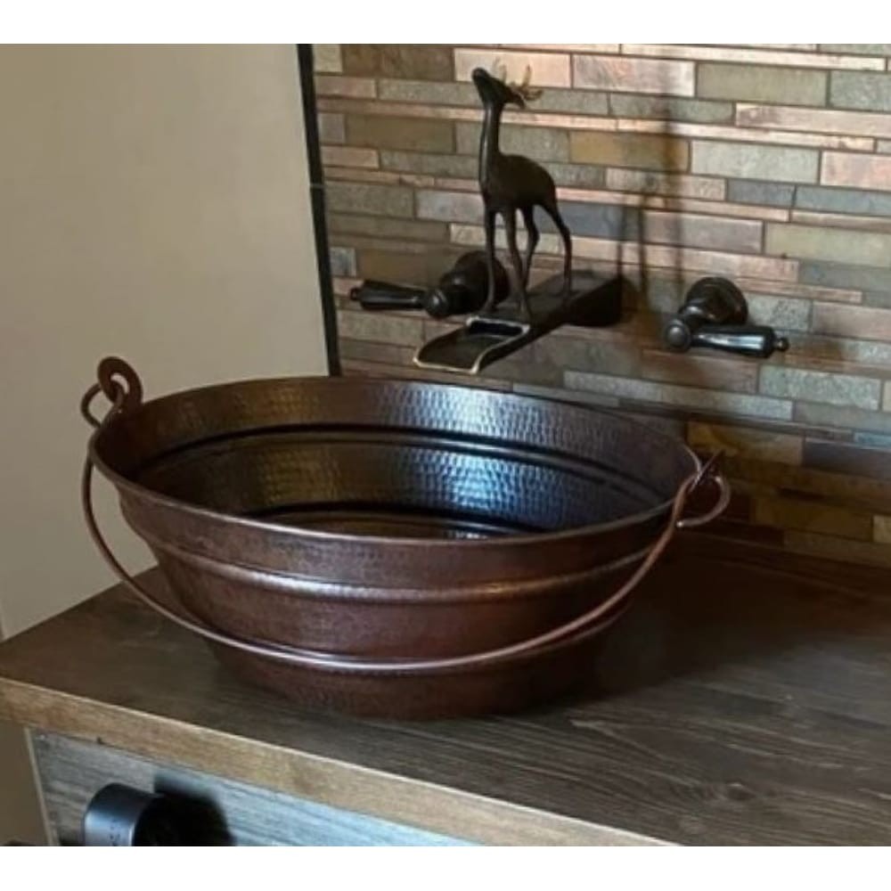 Welcome to SimplyCopper. Discover the Old-World Beauty of our Handmade Copper Sinks!SimplyCopper 16" Oval BUCKET design is created of 18-gauge copper, which is hand-hammered to provide a rustic antiqued look. This copper sink is installed as a vessel. Shape: Oval Outside Dimensions: 16" x 12-1/2" x 6"D Inside Dimensions: 16 x 12-1/2" x 6"D Bottom Measures: 11" x 8-1/2" Edge (Lip): Wire Rimmed Drain Opening: 1-1/2" { Non-Overflow } Drain Sold Separately Faucet Not Included Design: Hand-Hammered Surface Gauge: 18 Material: Copper Naturally Antimicrobial Finish: Aged Copper Overflow: No Installation Type: Vessel Warranty: Limited Lifetime Suggested Accessories: Compatible Faucets; ( OS-SC81H26-ORB ), ( OS-FLG100045 ), ( OS-89051B-3) Compatible Non-Overflow Sink Drain- Free Shipping Over $49.99* Details 16" Oval Farmhouse Copper Vessel BUCKET Bathroom Sink by SimplyCopper - 16" X Product Description: Welcome to SimplyCopper. Discover the Old-World Beauty of our Handmade Copper Sinks! SimplyCopper 16" Oval BUCKET design is created of 18-gauge copper, which is hand-hammered to provide a rustic antiqued look. This copper sink is installed as a vessel. ShapeOval Outside Dimensions16" x 12-1/2" x 6"D Inside Dimensions16 x 12-1/2" x 6"D Bottom Measures11" x 8-1/2" Edge (Lip)Wire Rimmed Drain Opening1-1/2" { Non-Overflow } Drain Sold Separately Faucet Not Included DesignHand-Hammered Surface Gauge18 MaterialCopper Naturally Antimicrobial FinishAged Copper OverflowNo Installation TypeVessel WarrantyLimited Lifetime Suggested Accessories: Compatible Faucets; ( OS-SC81H26-ORB ), ( OS-FLG100045 ), ( OS-89051B-3) Compatible Non-Overflow Sink Drain - (O-LT), (OS-DD) ,(O-Grid), (O-POP) Included: (1) Copper Sink Installation Instructions Copper Sink Care Warranty Information Please Note: Each sink is handmade by Skilled Artisans. Our sinks are unique and one of a kind. You will use the sink as your template as dimensions can vary slightly due to the handmade nature. Variations in the patina are normal and not considered to be a defect. We recommend a professional for installation. Use only mild soap and water with a soft cloth for cleaning.