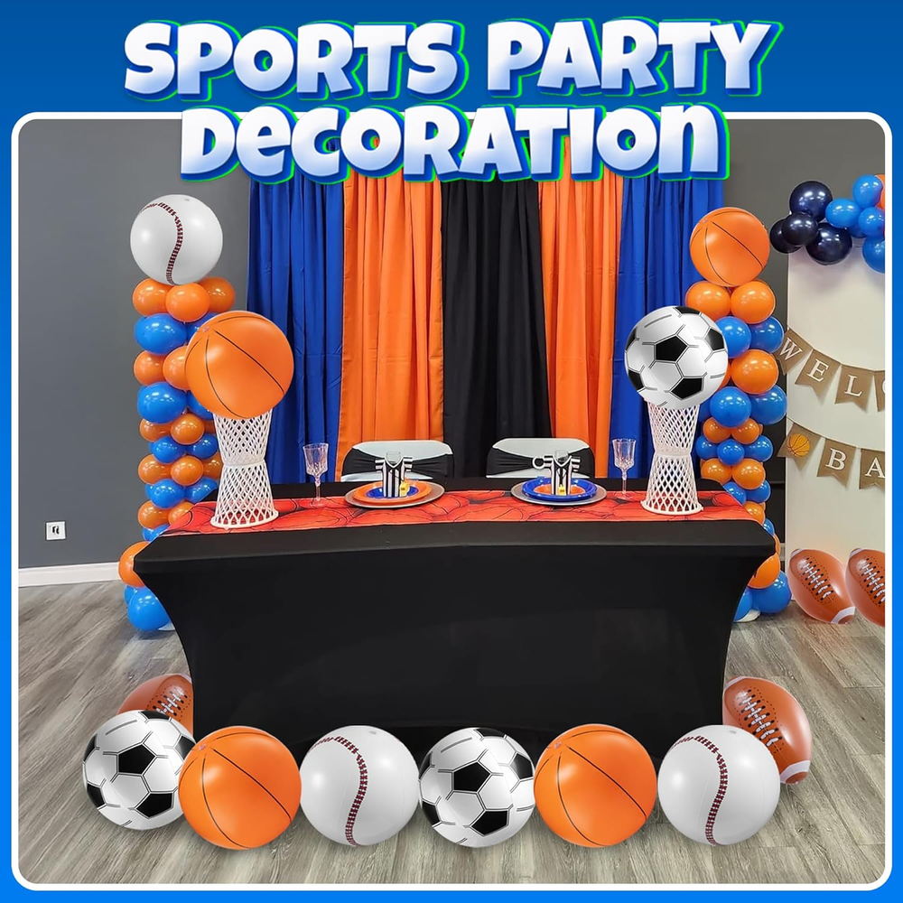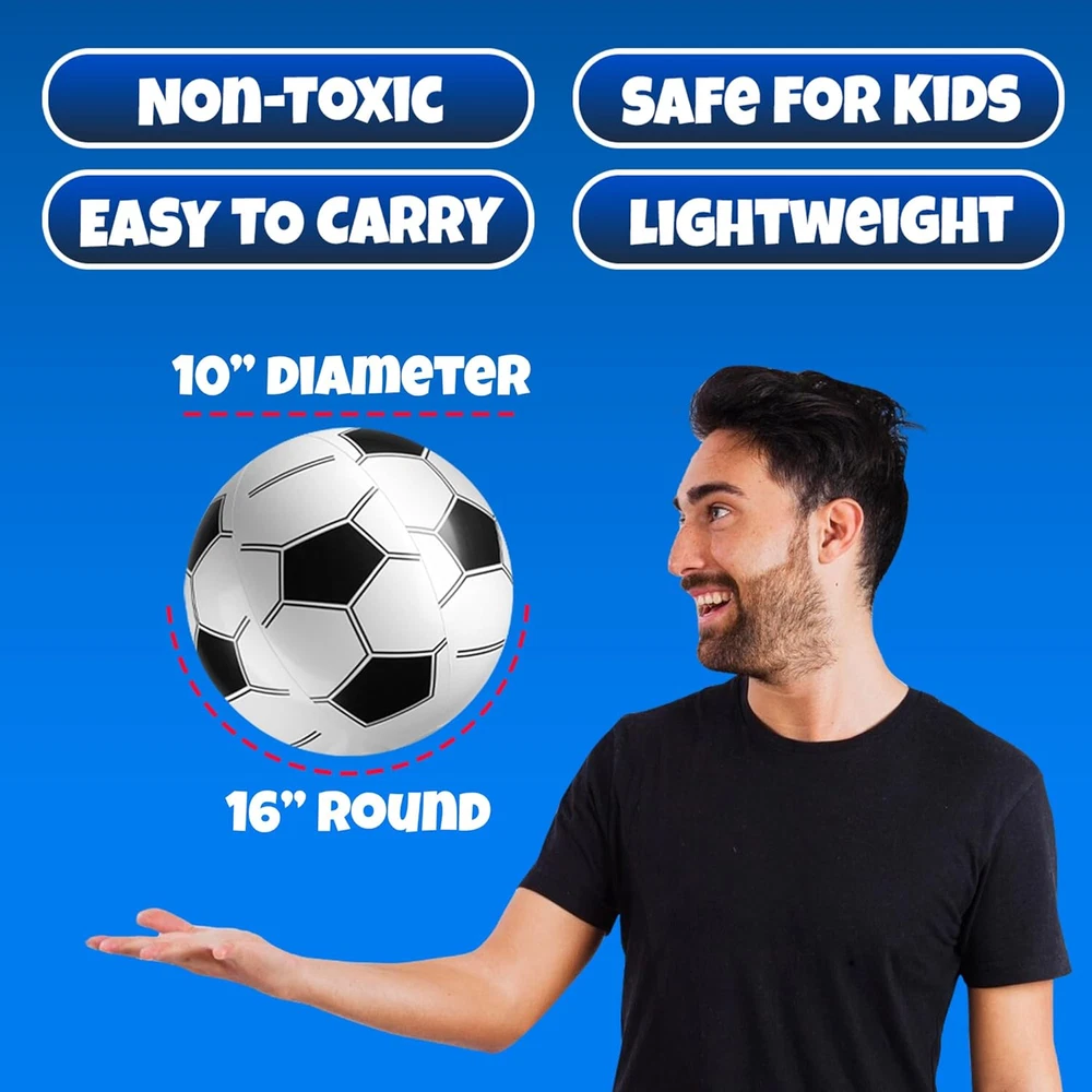 PACK OF 12 - 16" INFLATABLE SPORTS THEMED BEACH BALLS: Score Big Fun with Our Inflatable Sports Beach Balls! Each order includes a total of 12 inflatable beach balls featuring 3 of each sport: basketball, baseball, football, and soccer. These fun and durable sports-themed balls are perfect for pool toys, beach activities, or party decorations. EASY TO INFLATE BEACH BALLS: These inflatable sports theme beach balls feature a standard size valve that is easy to inflate and deflate quickly without much effort. You can inflate them with just a few breaths or by using a hand pump. Each beach ball will hold air and stay inflated for hours of fun. FUN FOR KIDS AND ADULTS - GREAT FOR ALL OCCASIONS: The Ultimate Sports Party Pack. These inflatable balls are small enough for kids' hands to play yet large enough to make any beach or pool party exciting. Perfect for themed parties, sports goodie bags, and backyard games, these lightweight beach balls add a sporty twist to any event while providing endless fun for all ages. DURABLE & PREMIUM QUALITY: Made from durable PVC vinyl material, these inflatable sports beach balls are designed to last. Each beach ball is individually wrapped for convenience, ensuring that they arrive in perfect condition for your next event. Lightweight and portable, they’re the perfect addition to any sports-themed celebration or summer outing. PERFECT FOR SPORTS-THEMED PARTIES: These Bedwina beach balls or pool toys for kids make the perfect addition to any sports-themed celebration, use as fun decorations, exciting party games or activities, and memorable take-home party favors that will delight guests of all ages! Warning: CHOKING HAZARD -- Small parts. Not for children under 3 yrs. Product description