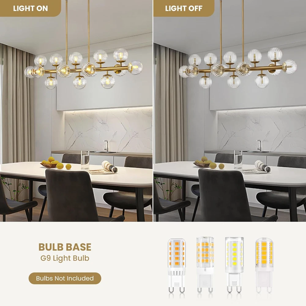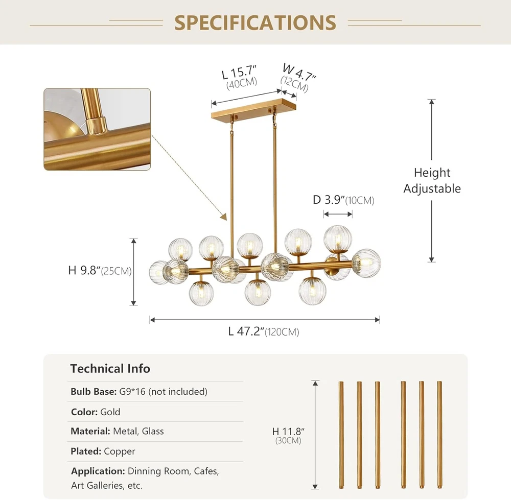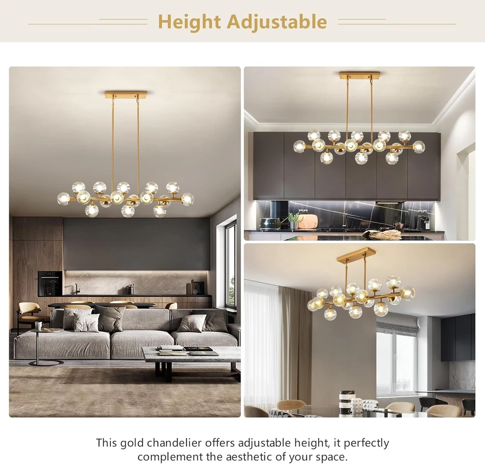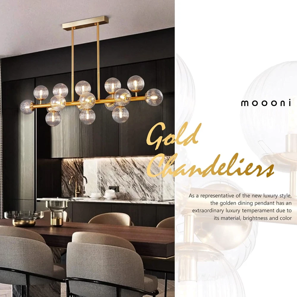 Store New Arrivals Add to Favorite View Feedback Contact 16 Lights Modern Rectangle Chandelier Gold Pendant Ceiling Light Fixture Clear Glass Shades Gold Chandeliers for Dining Room Kitchen Island Description Item model number MO-8814 Light Source Type LED Style Modern Number of Items 1 Power Source Corded Electric Fixture Type Non Removable Number of Light Sources 16 Control Method Touch Embellishment Crystal Batteries Included? No Lighting Method LED Maximum Compatible Wattage 7 Watts Controller Type Push Button Unit Count 1.0 Count Room Type Laundry Room, Kitchen, Living Room, Game Room, Dining Room Assembly Required Yes Product Dimensions 39.37"L x 14.57"W x 18.11"H Material Glass, Metal Installation Type Semi Flush Mount Model Name 16 Lights Modern Rectangle Chandelier Finish Type Polished Specific Uses For Product Indoor use only Indoor/Outdoor Usage Indoor Bulb Base G9 Light Color Gold Batteries Required? No Warranty Type Limited Item Weight 14.52 pounds Light fixture form Chandelier Special Features Dimmable, G9 led bulb, max 7watts per bulb, DON'T use any halogen bulb to this light fixture Special Feature Dimmable, G9 led bulb, max 7watts per bulb, DON'T use any halogen bulb to this light fixture Part Number MO-8814 Shade Color clear Mounting Type Ceiling Mount Color Gold Wattage 112 watts Shape Rectangular Voltage 120 Volts Plug Format A- US style Recommended Uses For Product Indoor Shade Material Glass Finish types Polished Included Components Ceiling Plate, Gold Light Frame, Glass lampshades Switch Type Push Button 【Modern Luxury Fixture】: 16 lights chandelier features clear glass shade with the gold finish, which makes the chandelier full of design and absolute stunning when light turns on. This elegant chandelier light fixture, perfectly match with casual spaces, residential houses, or any commercial areas. 【Unique Design】: The gold chandelier has 6 of 12" connection rods , you can choose to use 1 to 3 rods to your desire height . The lamp rod can rotate 180 degrees horizontally, so you can easily adjust the angle you like. The rods can be connected by the connector provided. 【Light Source】16 * G9 bulb socket, G9 led bulb can be searched online, DON'T use any halogen bulbs. (support 7 watts per bulb). Fully dimmable when used with a dimmable bulb and compatible dimmer switch.(Bulbs and dimmer switch not included). 【Assembled Dimension】 Length: 39.37"/100cm x Width:13.8"/35cm x Height:14"/36cm; Glass Lampshade: D7.5/19cm. Ceiling Plate: L15.7"/40cmx Width 4.7"/12cm. 【120% No-worry After Sales】30 days return without worry, 100% . 24/7 customer support with technical advice. Please don't tighten it too much to avoid the glass to crack at the joint. Product Description Gold Dining Room Chandelier Decorate with the globe glass lampshade, this gold rectangle chandelier will never let you down with its amazing lighting effect! Gold Island Pendant Light With a gold finish, the light frame craftsmanship highlights the extraordinary and uniqueness of this luxury gold chandelier, showing its luxury and atmosphere. Suitable for sloped ceiling. 1 Recommended Height 2 Available Function 3 For Sloped Ceiling 4 Install Lampshades How Should We Choose A Chandelier Size for Dining Table? If you are hanging the rectangle chandelier above a dining table or kitchen island, the chandelier’s bottom should be 30 to 36 inches away from the table top. You can also decide the size of the chandeliers based on the size of your dining table or kitchen island. We generally recommend that the width or diameter of the chandelier should be between 1/2 and 2/3 of the width of the dining table or kitchen island to create a good balance of proportions. 1 Suitable Scenes 2 Fine Details 3 Unlighted Effects 16 Lights Modern Gold Rectangle Chandelier Is this light suitable for sloped ceiling? Yes, we upgraded this gold chandelier light fixture, it has 2 link rings that are available to use for a sloped ceiling. What type of dimmer switch is compatible? This modern gold rectangular pendant light is suitable for use with any dimmer switch, the important key point being that a G9 LED dimmable bulb is required to achieve the dimming effect. Do you have matching extension rods for this gold chandelier? Yes, this gold dining room chandelier includes 6 of 12" connection rods. Please contact Moooni if you need extra extension rods. Does this fixture come in black? This modern linear chandelier can be done in black, please contact Moooni if you need it! What bulb should we use for this pendant light fixture? This gold chandelier for island kitchen is required to use G9 bulb, maximum wattage is 7 watts per bulb (equivalent to 75 watts for halogen bulbs). ABOUT US We offer the best prices around on high quality products. Our E-store includes media such as books, movies, music and games while offering electronics, toys, sporting apparel, clothing, tools, general home, garden items and more. SHIPPING We are always working hard to ensure your package arrives as soon as possible. Please understand that some factors like weather, high postal traffic, and the performance of shipping companies are outside of our control. We offer free shipping to the lower 48 states and ship within 2 business days of payment, usually sooner. We do not accept P.O. Boxes. Please provide a physical address. For shipping outside of the continental USA, we only use eBay's Global Shipping Program.The item is shipped to KY and then sent to the rest of the world. International customers are responsible for all duties and taxes. Continue to check out in order to calculate costs for shipping the item to your country. Messages regarding eBay's Global Shipping Program MUST be directed at eBay EXCLUSIVELY. RETURNS We offer a 30-Day Return Policy on items which you are not completely satisfied with. You have the option for a full-refund or an exchange of the item. No returns are available on items shipped outside of the USA. PAYMENT We acce