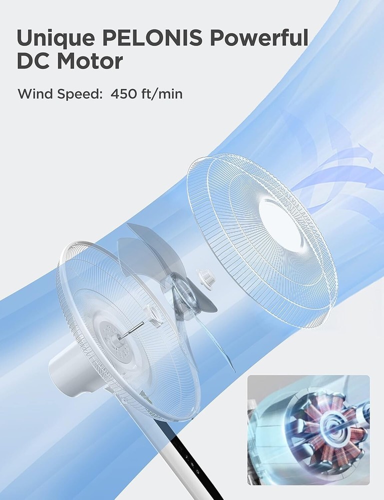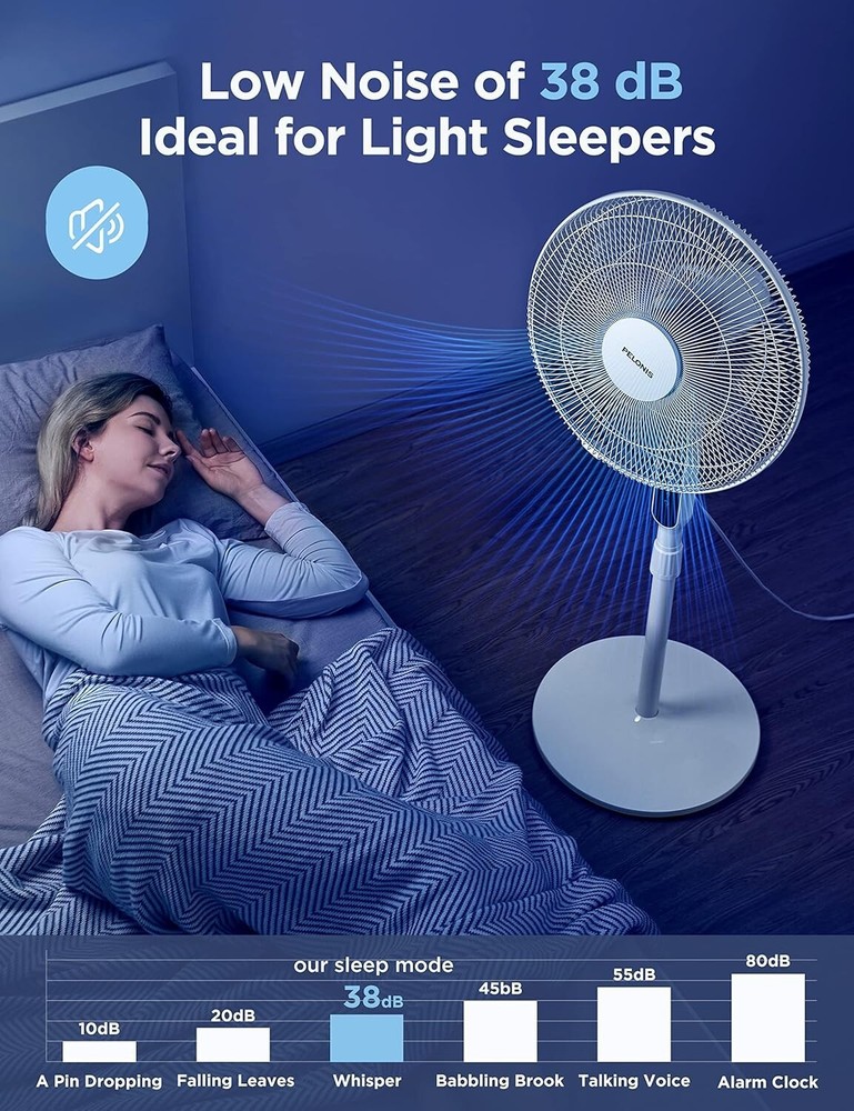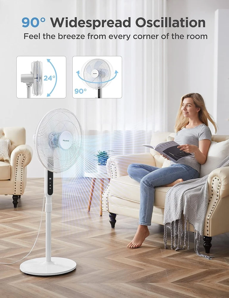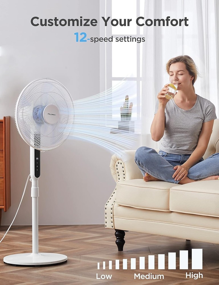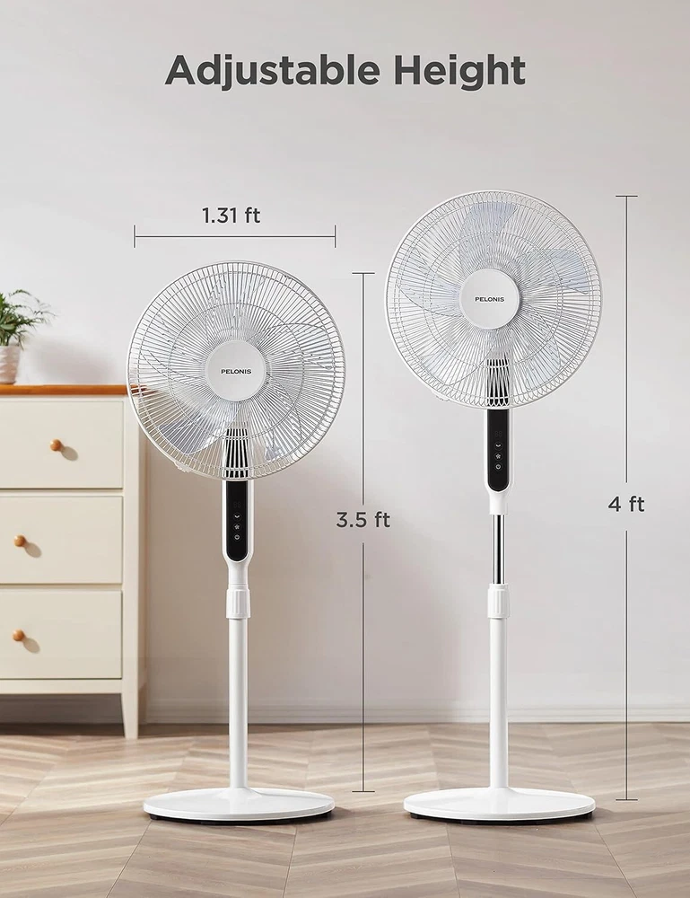 16" Oscillating Pedestal Stand Up Fan | Adjustable Height | Ultra Quiet DC Motor | Remote Control | 12 Speed | 12-Hour Timer | High Energy Efficiency | for Bedroom Home Office Use | White ULTRA QUIET & ENERGY EFFICIENCY: Equipped with DC silent motor, the pedestal fan is engineered for quiet operation (as low as 38 dB) which is less than half as loud as most standard fans. It is perfect for your bedroom or nursing room. The DC motor also offers greater energy efficiency and save up to 35% of the energy cost than its AC counterpart POWERFUL WIND & WIDE OSCILLATION ANGLE: 12 speed settings and 12-hour timer design allow you to customize your breeze needs in your house, living room and office. With 5 high-quality blades and a strong motor, this oscillation fan could provide strong wind to boost the cooling effect when using with air conditioner. The 85° oscillation angle and 24° tilt angle will extend wind the coverage to every corner of the room EASY TO USE: Featuring blue LED display, remote control and auto power off functions, the floor fan is designed for long-range and full function control (up to 6 meters). With the height adjustable between and 4 feet, it could get you fully covered no matter you are sitting on the couch or lying in bed SAFETY FIRST: The big and heavy-duty base could provide additional stability for the fan during its operation. The built-in overheat protection would automatically switch off the fan when the motor overheats. The kid friendly safety grid will create a safe and cool environment for every member of the family MANUFACTURER WARRNTY: With confidence in the quality of our product, offers a 1- manufacturer with your purchase of any of our product VOLTAGE: 120 volts 16-Inch 12-Speed Oscillating Quiet Pedestal Fan with 12-Hour Timer, Remote Control and Adjustable in Height with DC Motor, .