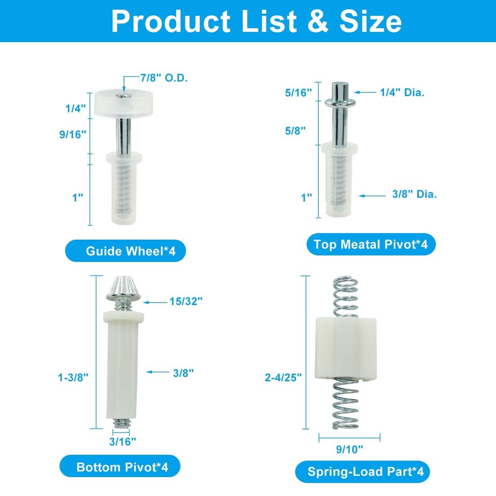 Features: Complete accessories, of damaged parts in one step. Wide range of application, one set of accessories can be used in many places. Specification: Name: Bifold Door Hardware Kit Material: Metal, Plastic Package Includes: 4 x Guide Wheel 4 x Bottom Pivot 4 x Spring-Loaded Part 4 x Top Metal Pivot Note: Light shooting and different monitors may cause the items in the pictures to be slightly different in color from the real thing. Due to manual measurement, please allow 1-3 mm error. Complete Accessories: The bi-fold door hardware kit comes complete with top metal pivot, bottom pivot, plastic guide wheels and spring-loaded part. Please refer to the picture for detailed dimensions Quality Materials: The door parts are made of quality steel and plastic materials, the finished product is durable and not easy to break. They will be the best partner for the folding door in your home Wide Range of Applications: You can quickly fix the old doors in your home with these sliding door accessories, they are suitable for most places, such as bi-fold cabinet doors, garage doors, barn doors, accordion doors, shower doors, pantry doors and so on Easy to Install: Our closet door repair kit already includes the accessories you will use during installation. All you need to do to replace or install the damaged parts is to simply combine and lock these parts Important Note: Regarding the size of the product and the accessories included in the hardware bag, we have made a detailed size reference and product list description in the product pictures, please make sure that the product meets your needs before you purchase