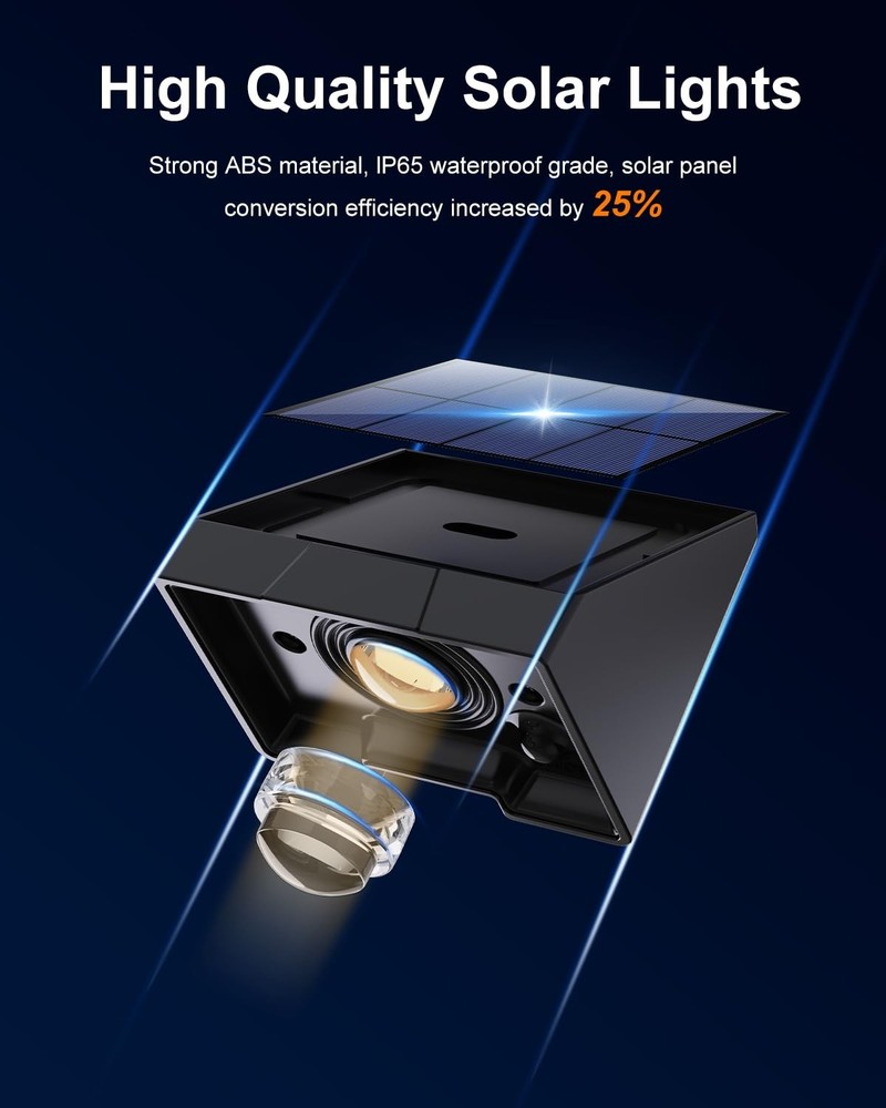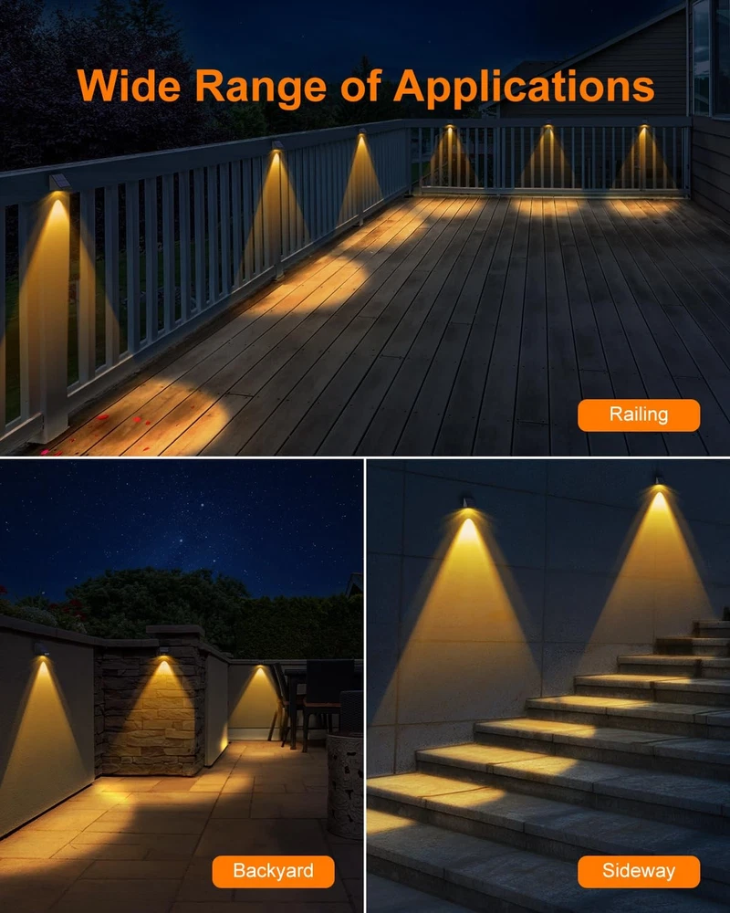 solar lights outdoor fence for light wall led lighting powered waterproof patio outside deck yard house to mount pack pool warm porch power dusk dawn backyard mounted exterior railing white on garden color landscape  door bright mailbox 8 stair and lamps sconce the panel metal luces para garage changing back cage modern stairs 12 out vinyl gate down red iron solares + stick colored adhesive step lamp 2 a colores multi balcony stairway gv shine panels fences solor low brick steps vertical around concrete with wooden weatherproof de 6 , mounting lanai screen fixture fencing area under security walls over walkway super wash lumen sun wood block enclosure side of fixtures building best k till winter facing yellow accent soft hampton bay leidrail frame fenced cedar fliti vwcyl brizled or attached aluminum easy wrought brighter address automatic exteriores sidewalk perimeter set number fens heavy duty illuminate attach fabstyle board outdoors entry rod portfolio keyhole swimming small electric downlights orange that wireless downlight screw purple downward hand so solarstep lightfor homes better stonewall installation kayak gazebo guntis jofisis bridika fensas melunar washer tub hot stockade ballaster fensa ledge gigalumi drywall lani post box mail numbers xinree lifengsoler ekq othway vtuik roopure brightever jsot letmy tilting bulk inside night corner in combo ebay sar chinly wdtpro lower artcool maggift niorsun solpex path corral guide go cinderblock passive kialush screened jardin soslina drive strong curved extensions durable highest rated nd gen compound linai source tread pointed ecoscape edge dmak decoration mr beams woolmug non type reflectors guidelight feit reflection dim play summer courtyard bottom greenhouse lightings photo cell nadjia privacy top external playhouse decks asmad moon rays wuxux cozy walllights luz piso big nymphy ring rails solarwall solaroutdoor lightkeys ext front luciole handrail pin point ugdluck long quntis three lithium ambient battery operated volisun thin solarlights permanent bridge siding damage free sunyoukit wilson fisher curb rechargeable rail pergola court vallas gvsshine fense otdair insert terrace enclosures hardscape land scaping xmnsoly xlux round railings sign systems driveway downcast sticky amber bolt spot no screws kaxiida blue multicolor taped black casting colorful single green architectural cementoutdoor amazing self downlighting up party downshield colorized change spotlight glue Brightness Increased by 50%: solar downlight feature a brand-new optical lens design that effectively concentrates diffused light into a bright, V-shaped beam. Additionally, they cast a perfect circle of light on the ground. Compared to similar fence lights, our product offers at least 50% more brightness, significantly enhancing both the safety and aesthetic appeal of your outdoor garden. Superior Durability, Extended Lifespan: Crafted from premium LED and robust ABS materials, solar wall lights boast an IP65 waterproof rating, ensuring functionality even in adverse weather conditions for long-lasting durability. Equipped with rechargeable batteries and high-efficiency solar panels, they provide reliable outdoor illumination, shining brighter for 6-10 hours on just 4-6 hours of charge. Simple Installation Methods in 1 Minute: Easily installable within one minute on surfaces such as wood, metal, or concrete. Solar deck light can be securely mounted using the provided screws or EVA tape, suitable for various scenarios like stonewall, cement walls, wooden walls, meeting the installation requirements of different environments. Save 50USD on Your Electricity Bill Per Month: promotes green living. The solar stair lights reduce your homes electricity expenses, saving you 50USD monthly. This diminishes your carbon footprint, minimizing humanity's environmental impact and contributing to a greener Earth. Ideal for consumers seeking to make a positive environmental impact. Mini Design, Small Size, Massive Power: The small multicolor solar balcony lights outdoor are carefully designed, only 2*2.56*2.28 inch, approximately the size of a baseball, to achieve maximum functionality in a compact form. This design philosophy ensures that the lights enhance your outdoor spaces without overwhelming them, providing perfect illumination with an elegant, space-saving footprint. Dusk to Dawn Automatic On/Off: The solar panels lamp has a light sensing function that automatically turns on at dusk and turns off at dawn. Please note that the product needs to be fully charged before using it for the first time, so as to better extend the battery life of the product. This feature ensures a seamless integration of convenience and efficiency. Ideal for a Wide Range of Outdoor Applications: The solar electric lights for outside is highly suitable for a variety of outdoor settings, including enclosure, lanai screen, address number and gazebo, greatly enhancing the ambiance and safety of the environment. It is versatile enough for various scenarios, such as poolside evenings or as a decorative element in landscaping projects. Using Tips: Wireless solar lights are not suitable for use in shaded areas or places with limited sunlight exposure, as they rely on solar energy to function effectively. It's important to install them in locations where they can receive direct sunlight during the day to ensure optimal charging and performance. Maintenance matters too. Clean panels regularly from dust and dirt. Position them right for max sun exposure. : Give me sunshine, return you bright night. Utilizes sustainability and modern design to cultivate a contemporary smart living atmosphere, exploring colors of the new era to create unlimited possibilities for personalized lifestyles.
