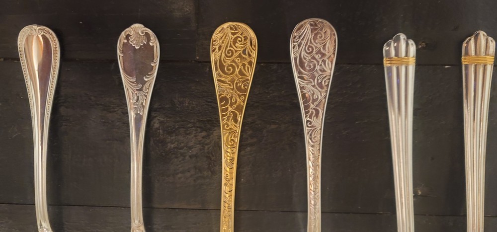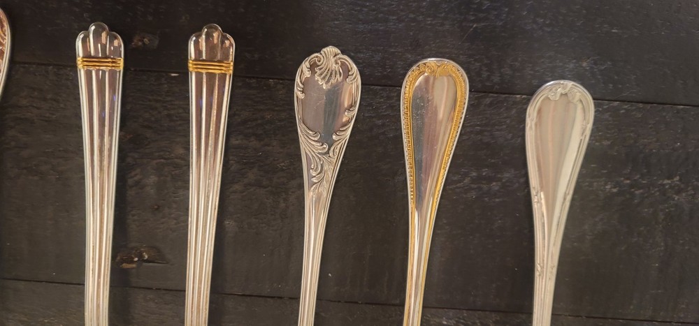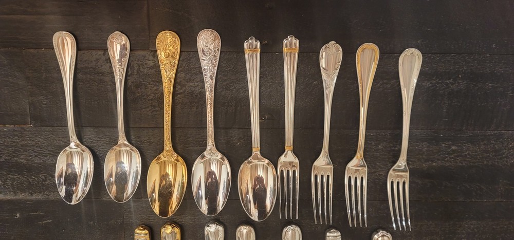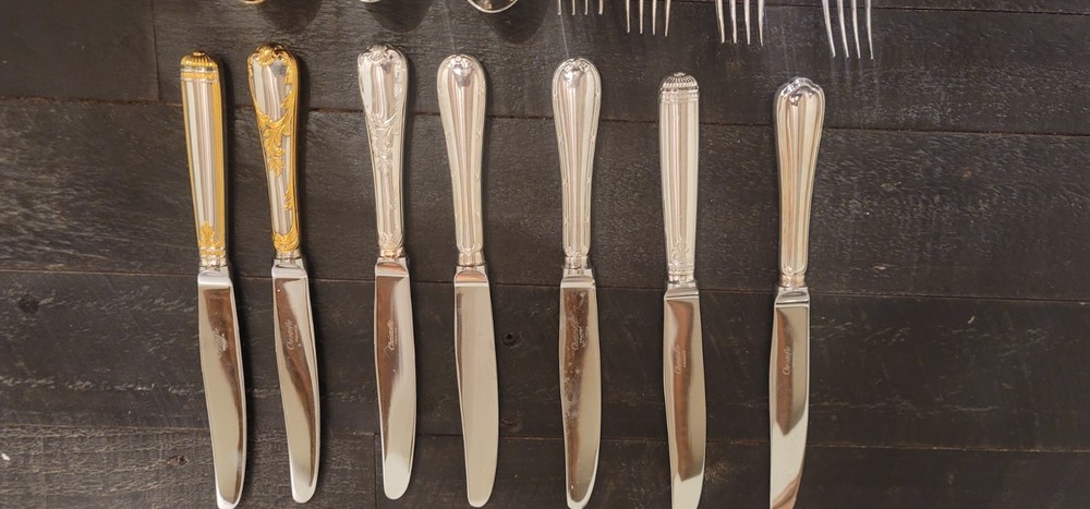 Assorted Collection of Used Christofle Silverplate Flatware 16 Piece Set Consist of the Following Items: Rubans Dinner Fork Malmaison Partial Gilt Dinner Fork Marly Dinner Fork Aria Partial Gilt Dinner Fork Aria Partial Gilt Table Spoon Jardin D'Eden Table Spoon Jardin D'Eden Gold Gilt Table Spoon Marly Dessert Spoon Malmaison Dessert Spoon Cluny Dinner Knife Malmaison Dinner Knife 2 Rubans Dinner Knives Marly Dinner Knife Marly Partial Gilt Dinner Knife Malmaison Partial Gilt Dinner Knife This is great for Buffet Dining and Parties
