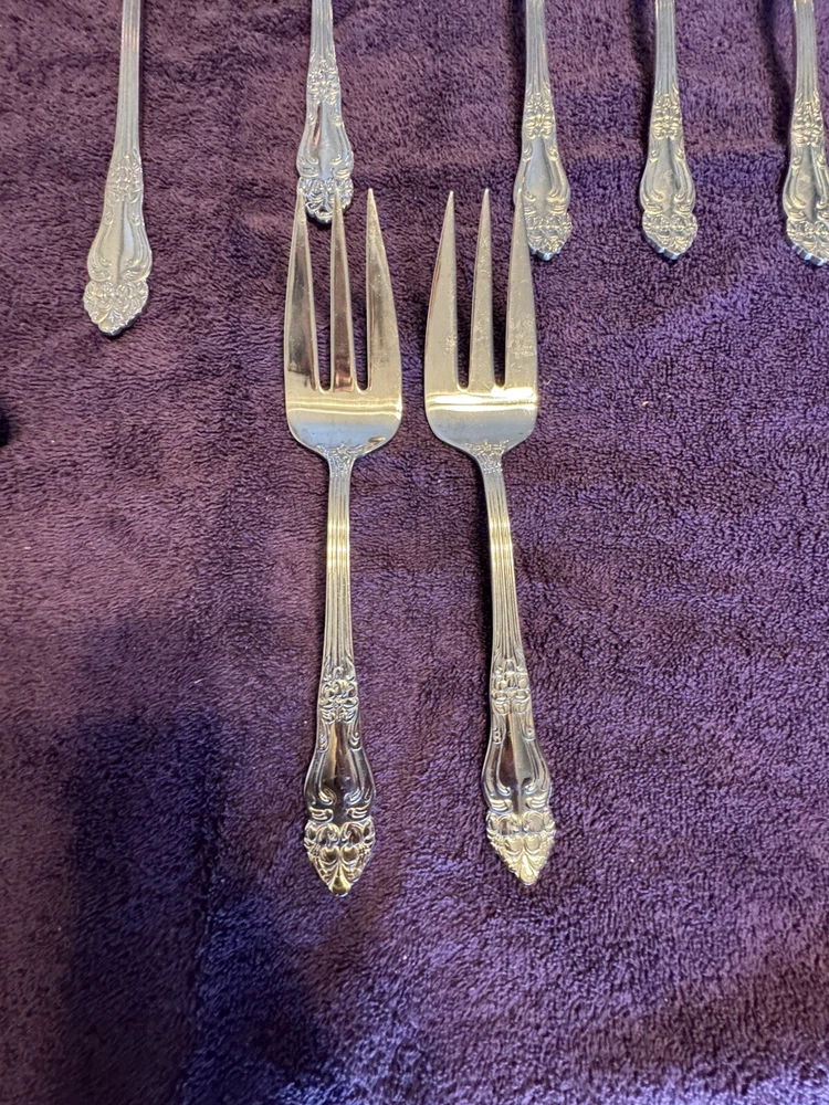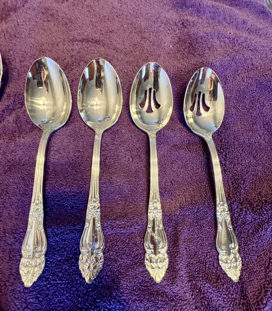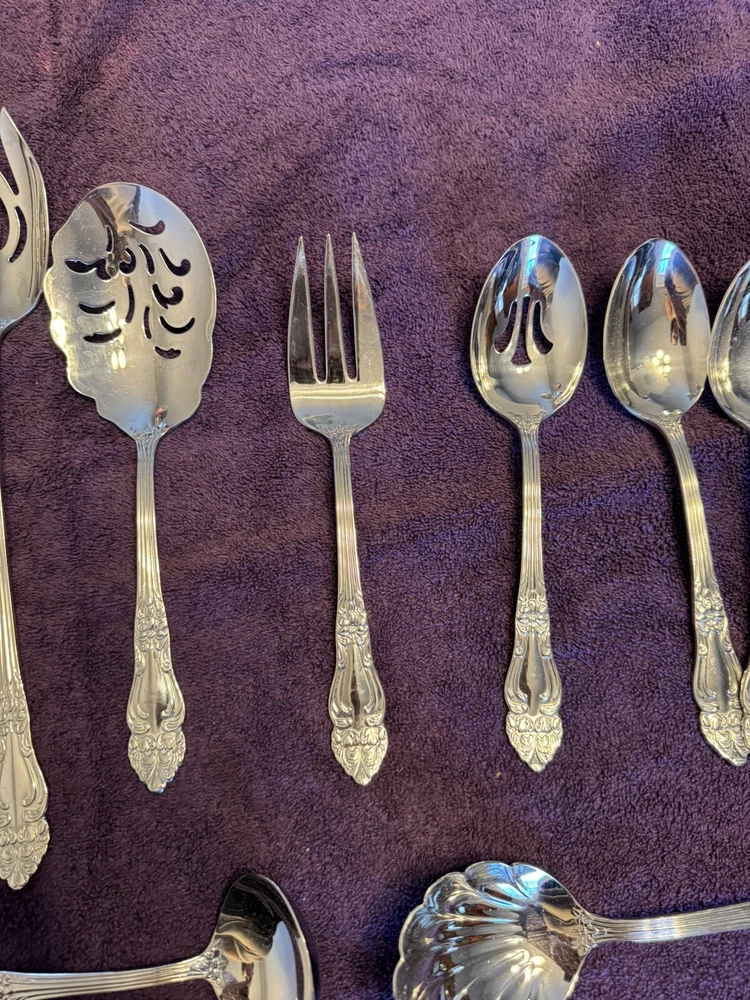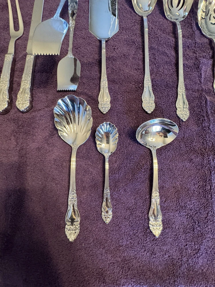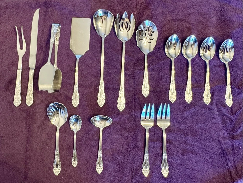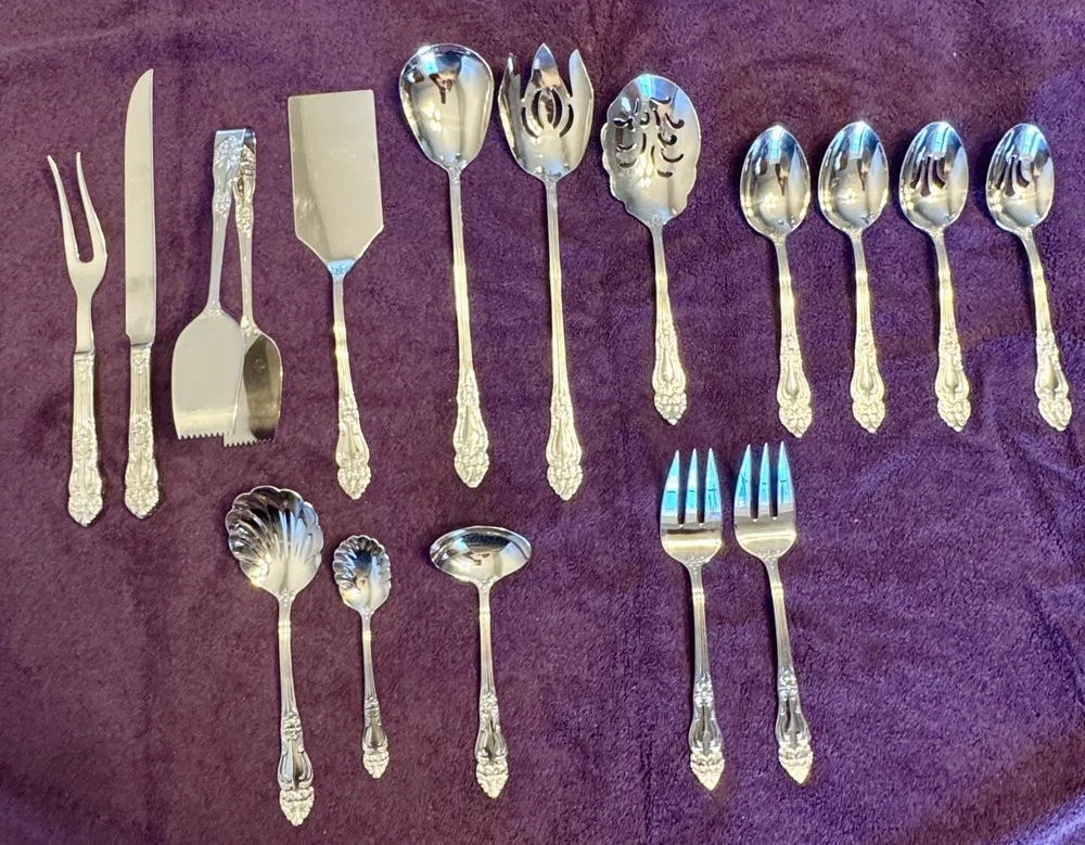 16 pieces total! See all photos! I’m unsure the name of each piece but they’re all the larger serving utensils for the haversham silverware. *At the time of listing, I also have a 6-person silverware lot for this same style! Check out my other listings if you want a larger set! May have some surface scratching and/or water markings from rinsing. Elevate your dining experience with the Reed & Barton Haversham Glossy 18/10 Stainless Flatware collection. Designed for both elegance and durability, each piece in this set embodies the traditional style with its intricate floral and scroll patterns, complemented by a brilliant silver finish that resists rust and corrosion. Ideal for any occasion, the set includes a diverse array of hostess and serving pieces, such as a ladle, slotted spoon, cake/pie slice, knife, server, serving fork, and serving spoon, ensuring that you're well-equipped for any gathering. Crafted with a commitment to quality, these stainless steel utensils are dishwasher safe and designed for repeated use, making them as practical as they are stylish.