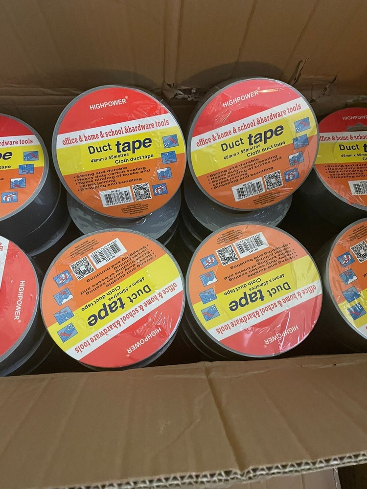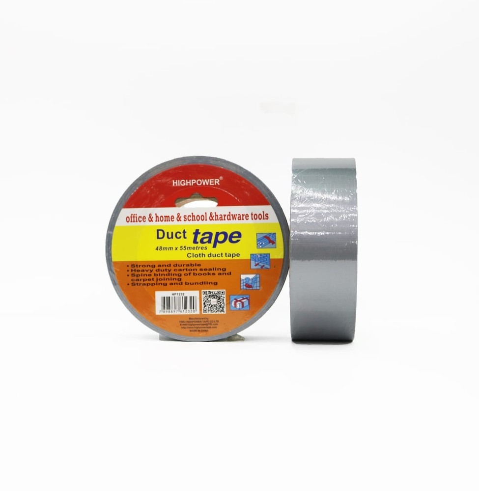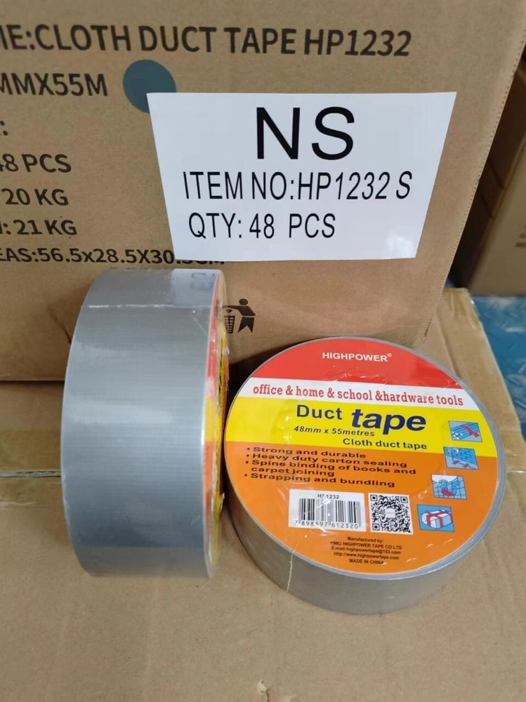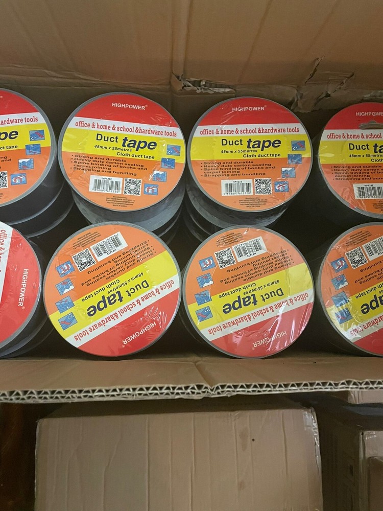 Utility Grade Duct Tape Economy grade polyethylene-coated cloth with a natural rubber adhesive. Good tensile strength, hand tearable, excellent moisture resistance. Conforms well to irregular surfaces. Used for bundling, heavy carton sealing, general maintenance, pipe wrapping, carpet fixing, AC duct seaming and joint sealing. 3" neutral core. Physical Properties: Total Thickness: 7.2 Mils Adhesion to Steel: 44 oz/in Tensile Strength: 31lbs/ in Elongation: 19% Temperature Range: -4 F to 140 F AVAILABLE IN LARGE QUANTITY Size : 48MM (2 in) X 55MM (60 Yards) Quantity : 16 Rolls Available : Gray & Black Color