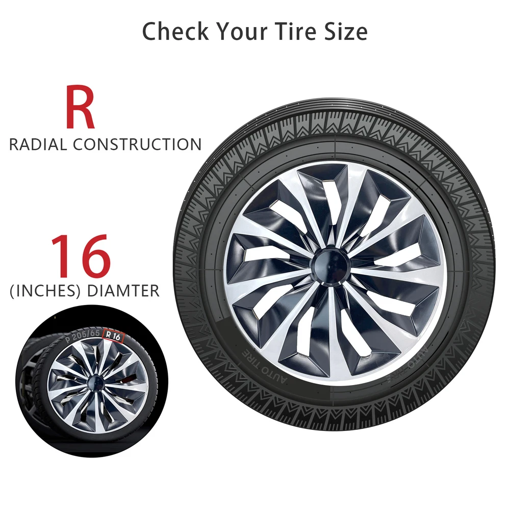 4 x 16" SILVER AND BLACK WHEEL COVER HUBCAPS PLEASE MAKE SURE YOU HAVE 16" STEEL WHEELS. Measure by checking the number after the "R" on your tires. IT MUST SAY R16! DESCRIPTION This pack contains four silver and black hubcaps, a pair of gloves, a screwdriver, four suitable tyre valve cores ,four white adhesive strips and Installation instructions. This product is easy to install, simple and stylish. Note: Please check your tyre size before buying a wheel. Please m ake sure your iron wheels fit these hubcaps. The color of the picture is slightly different from the real thing Welcome to purchase!