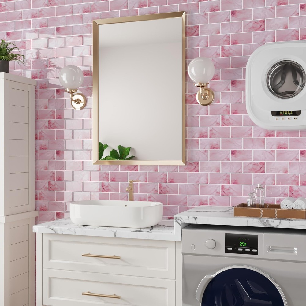 pink peel and stick backsplash for kitchen subway tile pink marble peel and stick tile for bathroom back splash stick on tile stickers waterproof 3D Subway Tile: Kitchen backsplash peel and stick, pink marble tile stickers, with white grout lines, glossy finish. Sheet size is 12"x12"x0.05", chip size is 3.3"x1.9", each box of 16 sheets covers 16 square feet Features: Peel and stick subway tile backsplash, made of durable PU glue and PET backing paper, no yellowing, color loss or cracking with long-term use, waterproof, oil-proof, easy to clean, impact-resistant, heat-resistant (from -30°C to 80°C) Easy to Install: Kitchen backsplash tiles peel and stick, self adhesive, no grout, no glue, no mess, easy to cut, lightweight, flexible, bends to corners, easy to apply, removable backsplash for renters, no residue left behind Wide Application: Peel and stick backsplash for kitchen, peel and stick tile for bathroom, back splash stick on tiles for kitchen backsplash, behind the sink, behind the stove, bathroom vanity backsplash, shower walls, laundry room, dining room, girls room, living room, fireplace, RV, wall tiles Warm Tips: *Please ensure that the tile is applied on a smooth, flat, dry and clean surface, it is not recommended to use it on uneven, textured, rough or dusty surfaces. *Due to the difference in device screens, the actual color may vary slightly from the picture, we recommend that you order 4 sample tiles to check and make further decision. *It is recommended to order 10% more tiles to account for cutting loss during installation