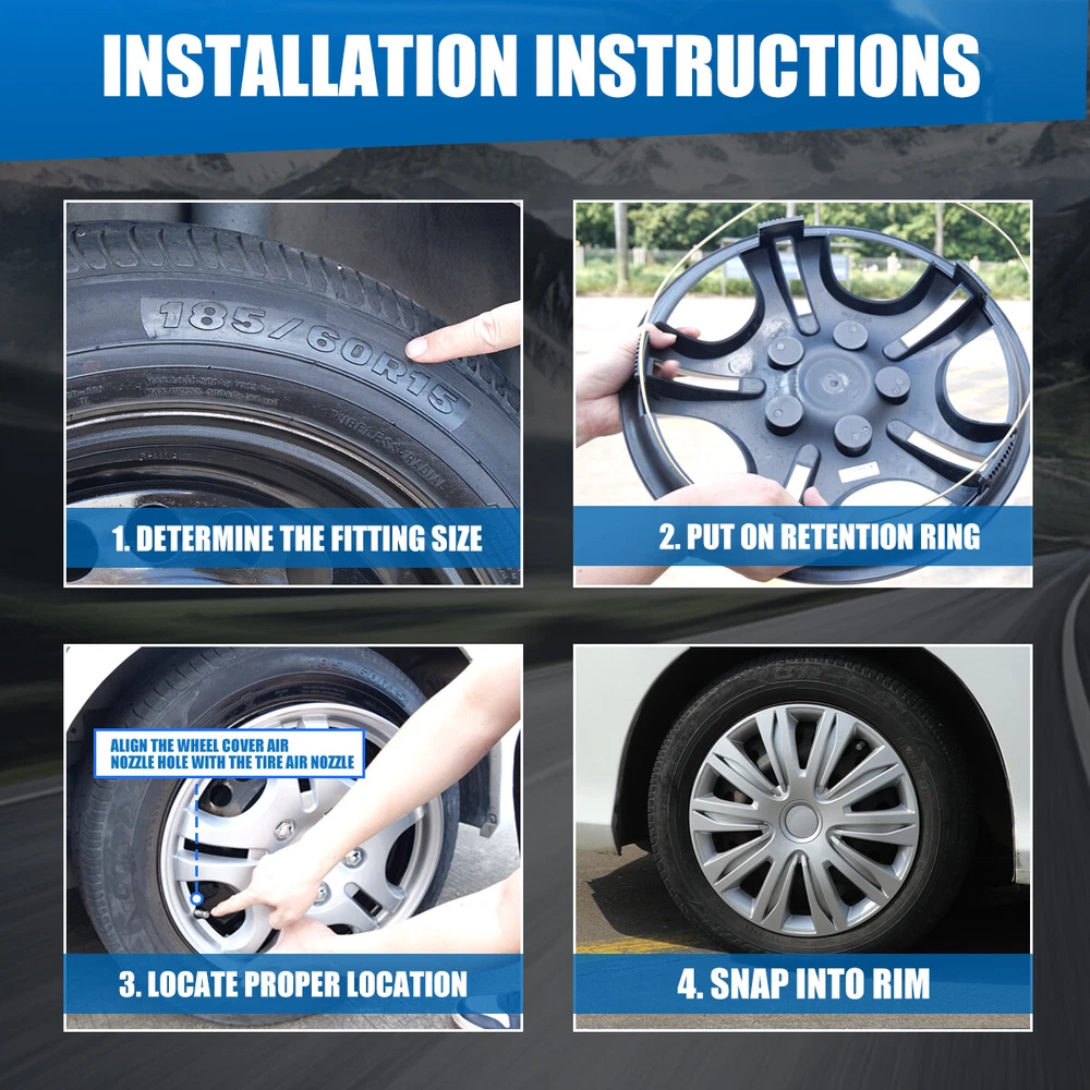 16" Set of 4 Silver Wheel Covers fits R16 Tire & Steel Rim Snap On Full Hub Caps Feature: π Please ensure to check your tire/wheel size before purchase! designed for (p16) 16β stock steel wheels and will not fit over aluminum alloy wheels. π Designed from oem replica style wheelsβ for replacement with fast & easy snap-on installation - made from premium abs material β lab & road tested for performance and ultimate durability. π Adjustable retention rings assures firm grip gives support to the hubcaps making sure they stay in place. locate the curve on the retention ring and match to the tire air valve to install. π Installation instructions available - please refer to the images available as well as detailed instructions below for assistance. π Wolfx wheel covers fit most models of vehicle brands including acura, chevrolet, dodge, ford, honda, hyundai, kia, mazda, mitsubishi, nissan, subaru, toyota, volkswagen and more. Specification: Quantity: 4 PCS Material: ABS Color: Glossy & Silver Lacquer Wheel Size: 16 inch Finish: Glossy Placement on VehicleοΌFront/Left/Rear/Right Package Includes: 4* Wheel Cover Hubcaps Payment Delivery details Terms of sales About us Contact us Payment π We accept PayPal (Recommended), credit card, VISA, Google Pay & Discover etc. π Please submit your payment within 7 days after your purchase. π If not, eBay will automatically open an Unpaid Item Dispute on our behalf if the item(s) are not paid within 7 days. Delivery details π Please double check your delivery address and contact information. π All items will be shipped within 1 business days after payment received. π Tracking numbers will be easily accessible ASAP they are created and processed. Terms of sales π Free 60 days Return, we will cover the return post fee. π If a defective product was received, please do not hesitate to message us via eBay message. π We will response in 24 hours in business to resolve the problem π We stand behind our products. Items can be returned for exchange or full refund within 60 days from the date you receive. About us π Wolfstorm has a huge warehouse and office located in the United States. π All US domestic 48 states customers are able to benefit from the FREE SHIPPING services. π Our experienced, professional customer service representatives offers prompt and courteous service. π Best quality products, outstanding services and professional experience keep our customers. Contact us π Please feel free to contact us if you have any problems. π Emails will be replied within 24 hours in working days. π After hours emails will be replied on the next business day.