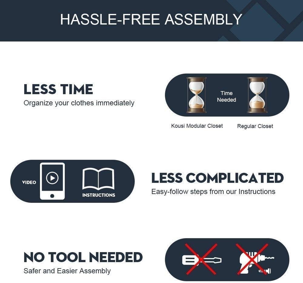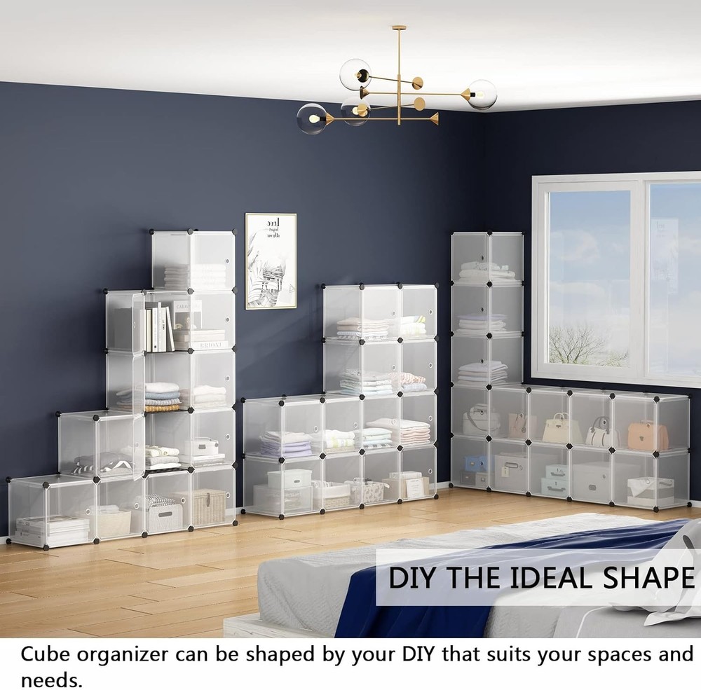 Product Description About this item 【LARGE STORAGE&STURDY STRUCTURE】 A total size of 56"x14"x56" for this storage shelf. Each storage cube is 14"x14"x14" large and can support more than 30 lbs. Designed with strengthen steel panel at the buttom of each cube to hold 3x more weight than PP Plastic sheet buttom. 【VERSATILE USAGE】 It’s suitable to be used in many places, as a clothes organizer for bedroom, yarn storage for craft room,cube organizer for lofts, toy storage for children's room, bookshelf for study room,storage cabinet for kitchen. A great solution for multi-functional storage needs. 【DIY THE IDEAL SHAPE】Cube organizer can be shaped by your DIY that suits your spaces and needs, for example, Landscape position, Separate position, Ladder Shape, With or without door... Flexible and can fit into your every décor and spaces, make your home or room stunning! 【EASY TO INSTALL】: Simple modular structure makes it easy to install and disassemble. With the help of a hammer (included in the package) and the instruction, you can easily assemble the whole unit. 【EASY TO MAINTAIN】Our products use waterproof panels, which are easy to clean. Warranty:2-year. If you have any questions, please contact us, we have a professional team to solve your problems. Buy worry-free. Various function& DIY the Ideal shape You can create the storage organizer in varieties of shapes to meet your needs. Besides, it can be freely adjusted due to the limited space to fit in. Great storage space to store clothes, bags, accessories, shoes and many other things you want! Strong and Sturdy Each cube support more than 30 lbs. Designed with strengthen steel panel at the buttom of each cube to hold 3x more weight than PP Plastic sheet buttom. This also make our storage much sturdier, and great for long usage. Easy to install Simple modular structure makes it easy to install and disassemble. With the help of a hammer (included in the package) and the instruction, you can easily assemble the whole unit. Waterproofed and dust-resistant Light in weight and easy to clean, the dust-resistant wardrobes keep your clothes away from dirt and water-proof panels are easy to clean. Various function& DIY the Ideal shape Strong and Sturdy Easy to install Waterproofed and dust-resistant Announcements Please ask for the necessary quantity of each components if you plan to build a custom design. lease stick each cube all the way inward to make it firm when installing. lease use a pair of gloves while assembling the unit in order to prevent you from getting hurt. lease make sure all grids reach deep into the slot of the connectors during assembly, until you hear the “click”. On Aug 11, 2025 at 23:40:33 PDT, seller added the following information: