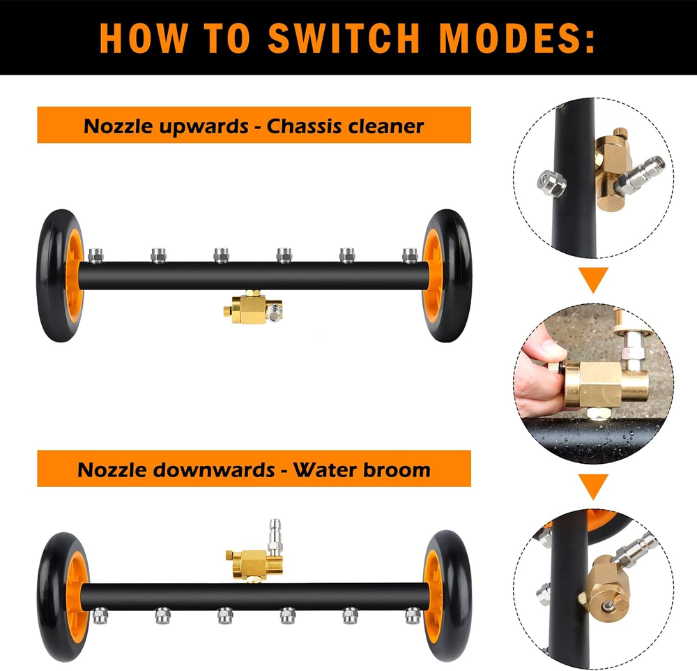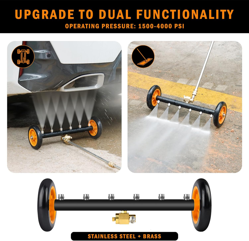 1. This undercarriage pressure washer attachment is a game-changer! The dual-function design works flawlessly as both a cleaner and water broom, making tough grime disappear in seconds. I love how sturdy and easy to use it is—no more struggling to reach dirty spots. The included extension wands and nozzles give great versatility, and it handles high PSI like a champ. Perfect for cars, trucks, or driveways. Definitely worth every penny!