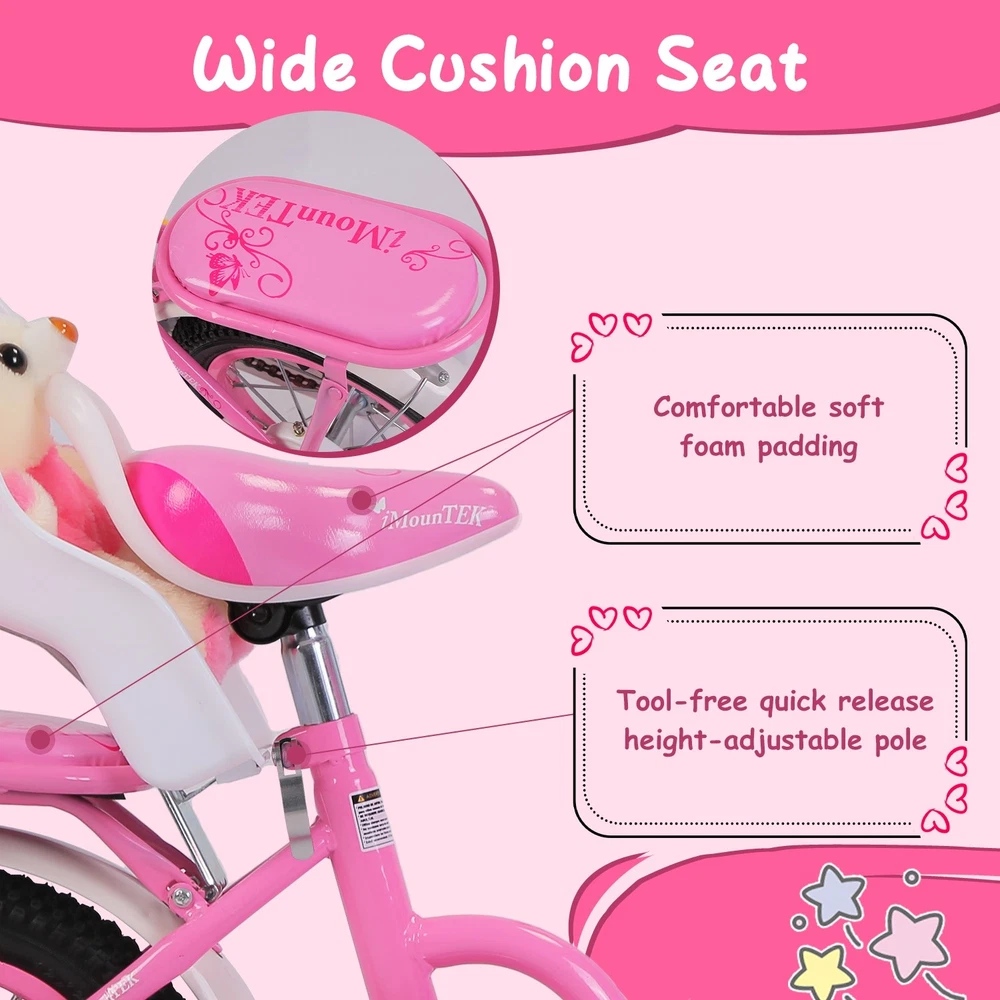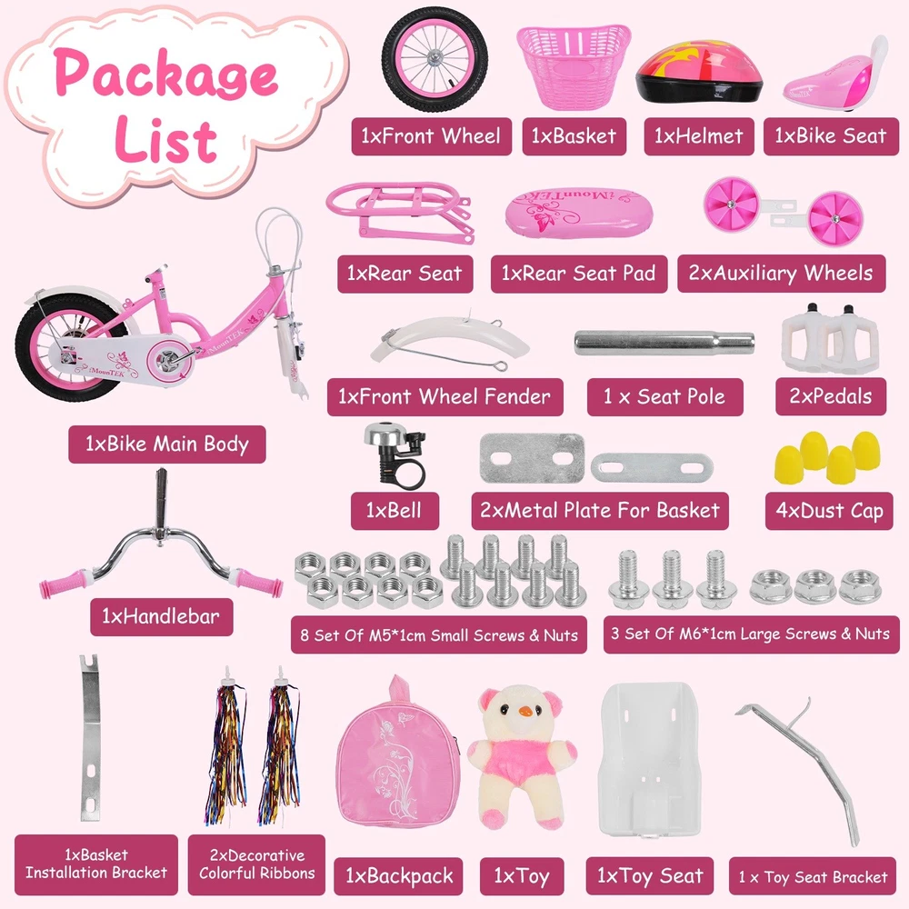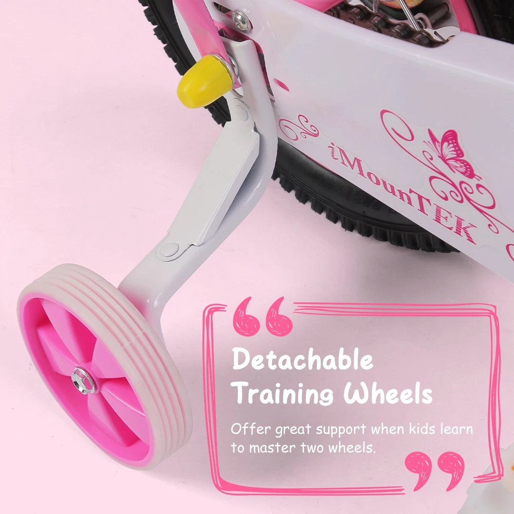 Free Shipping Featured Item Product Detail Image Gallery Product Description Overview: From the first wobbly strides on the balance bike to the first time hitting real singletrack, our all-new kid's bikes are designed to create amazing rides. The cute and lovely outlook attracts kids to ride on it. The bike has extra-wide tires and pedals, making it easy to maintain balance and ride even for young beginners. Low stance and delicate curve frame is easy for kids to hop on. Considerate helmet renders your kid more safety when riding. Extra backpack is great for your kids to put water bottles, paper tissues and other riding gadgets. Equipped with never-bend training wheels that will support them as they learn to master two wheels. Easy for kids to learn riding! A must-have gift for them in their childhood. Features: Cute & Attractive Outlook: Cute bike in lovely colors and patterns,detachable training wheels for excellent steadiness,a ,and a basket for her dolls. It's a great first bike with all the bells and whistles a child will need to learn and get comfortable with biking. Easy Cycling: The bike has extra-wide tires and pedals,making it easy to maintain balance and ride even for young beginners. Low stance and delicate curve frame is easy for kids to hop on. Great Protection: Full cover chain guard provides a great protection for kids riding. Come with soft grip and beautiful streamers,easy for the little one to manipulate the bike. And front caliper brake & rear brake with handbrake provide great speed control. Extra Helmet & Backpack: Considerate helmet renders your kid more safety when riding. Extra backpack is a great companion when riding,you can put water bottles,paper tissues and other riding gadgets. Training Wheels: Equipped with never-bend training wheels that will support them as they learn to master two wheels. Strengthened bracket is more secure & strong for kids’ riding. Also features full chain guard & anti-slip resin pedal for added safety. Specifications: Brand: iMountek Color: Pink Wheel Diameter Options: 16in Load Bearing: 100kg/220lbs Materials: Carbon Steel 16in Bike Height: 105cm-125cm/41.33in-49.2in (4-7Years Old); 100kg/220lbs Max Load 16in Package Size & Weight(2Pcs): 89x32x46cm/35.04x12.6x18.11in; 18.6kg/41lbs Package Contents: 1 x Kids Bike 1 x Helmet 1 x Backpack 1 x Toy Seat 1 x Toy Terms & Conditions Thank you for your business !